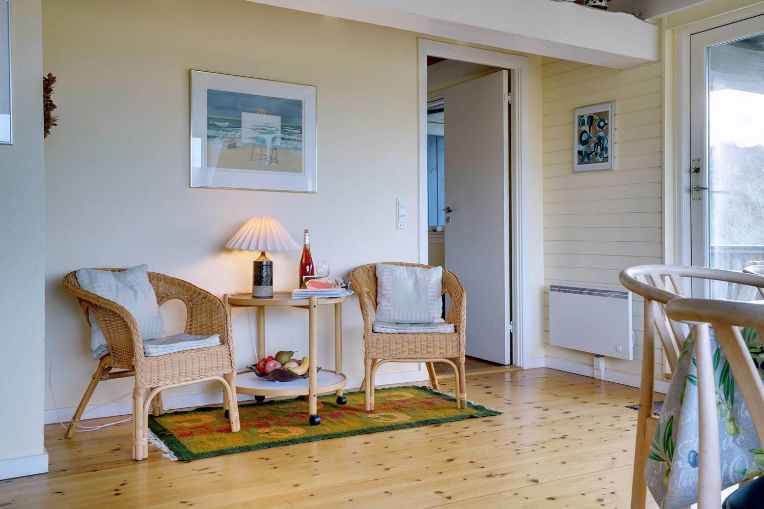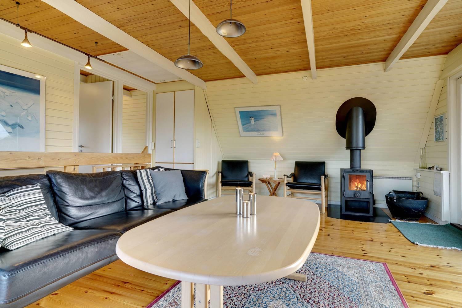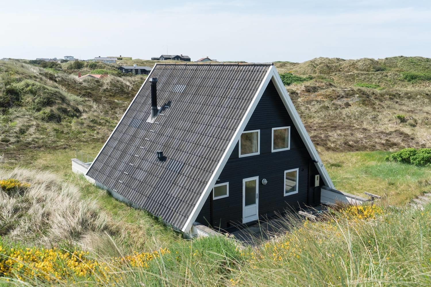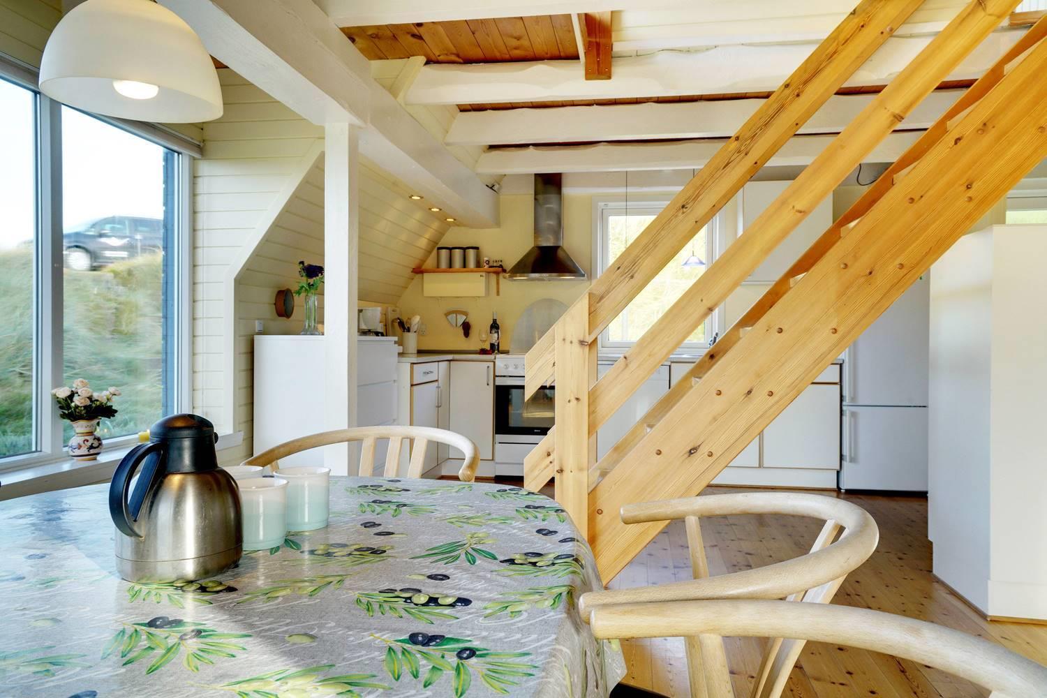 På en pragtfuld kuperet og ugeneret klitgrund fremme ved fredningslinien ligger dette feriehus med udnyttet 1. sal. Prøv at sidde i den hyggelige stue på 1. sal og nyd den pragtfulde udsigt udover klitterne. Køkkenet er i åben forbindelse med den lyse spiseafdeling hvorfra der også er skøn udsigt.