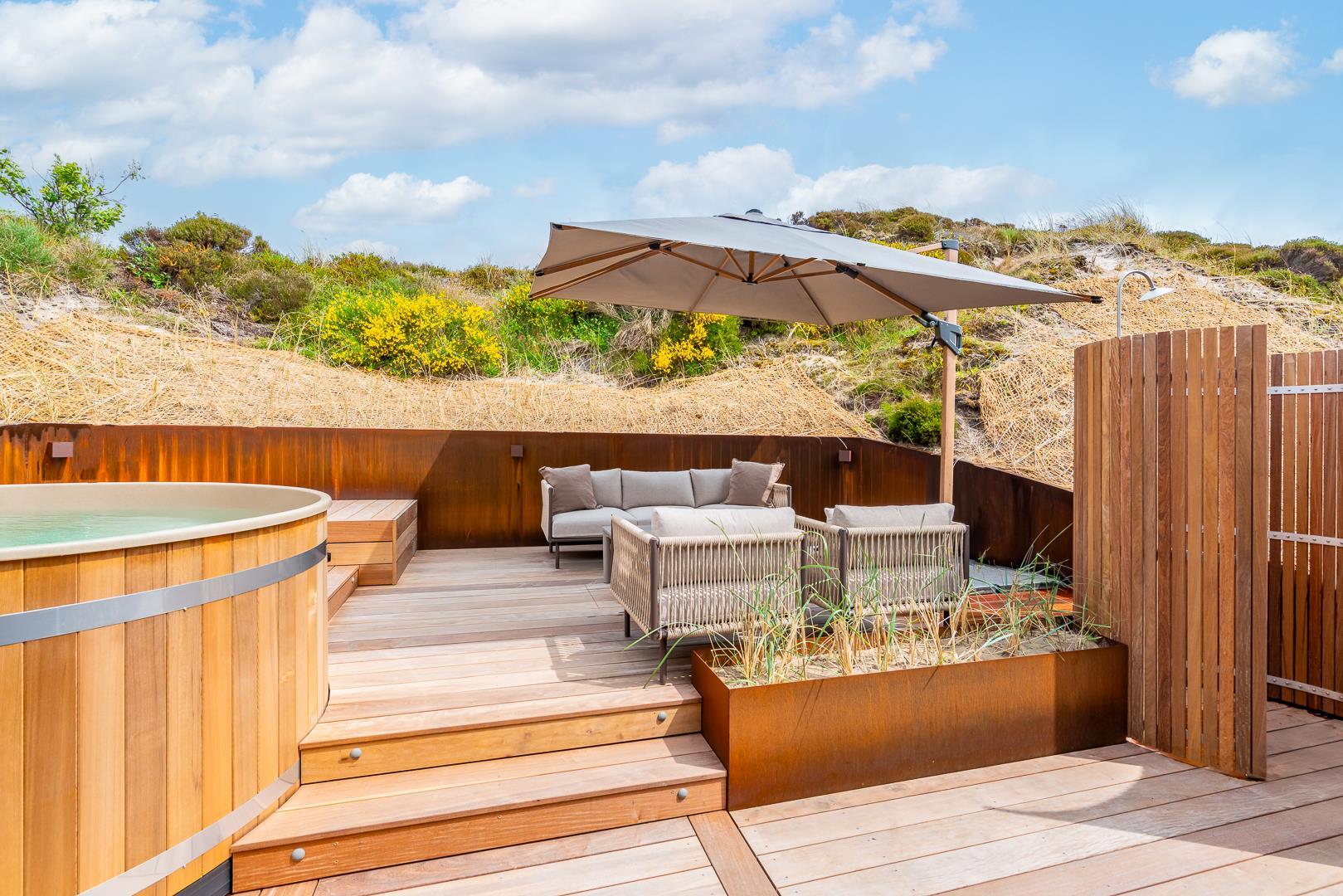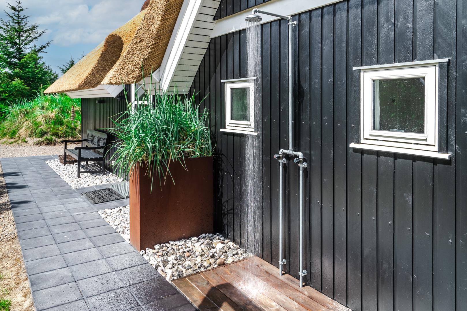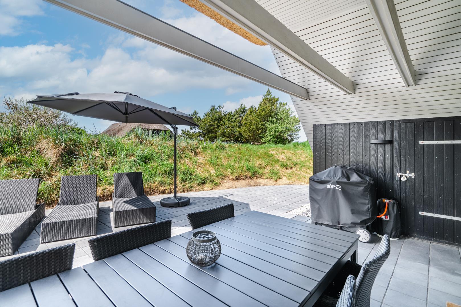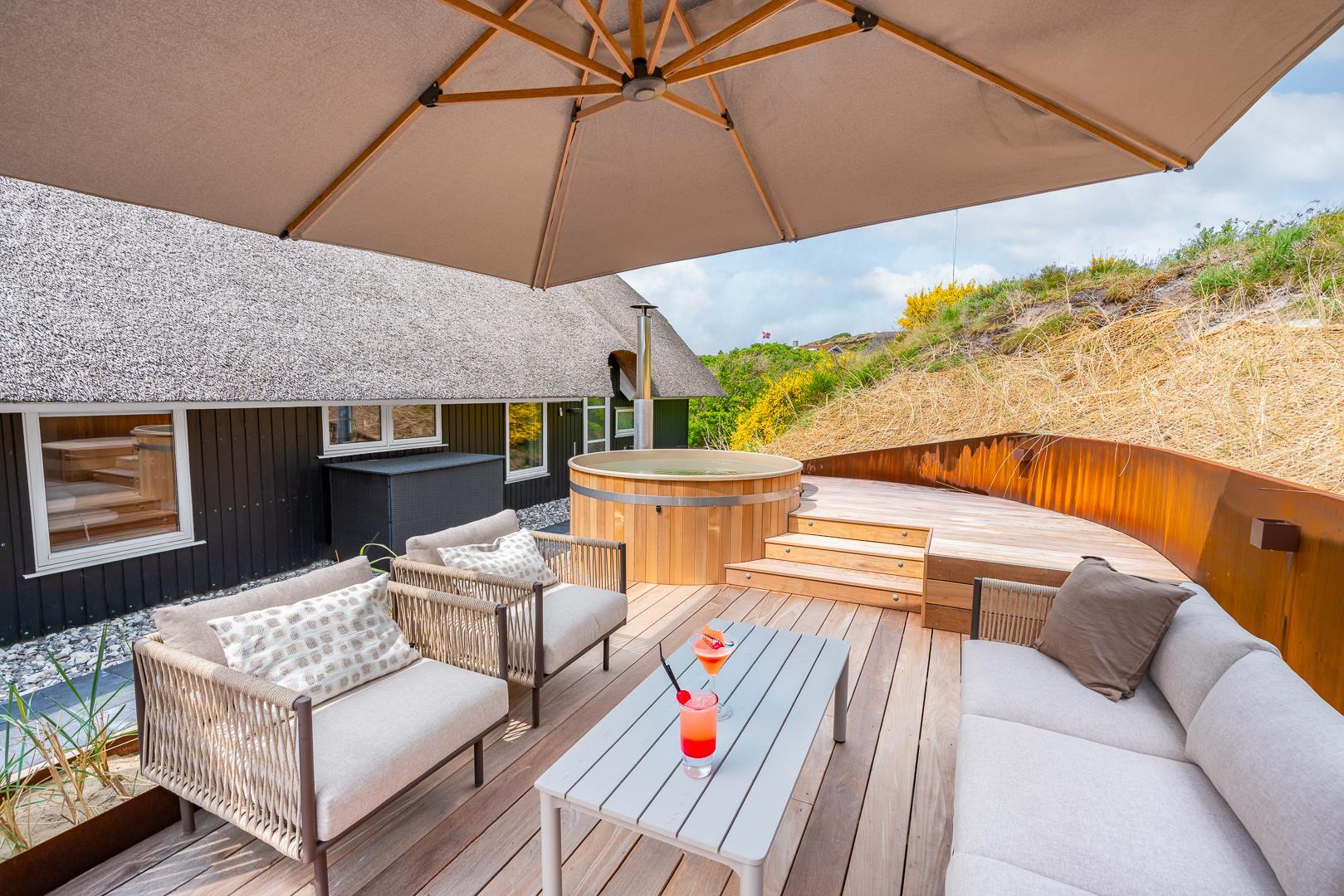 Her er både et lækkert og indbydende lounge område med loungemøbler og vildmarksbad og en stor overdækket terrasse, der vender mod vest.