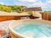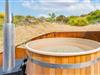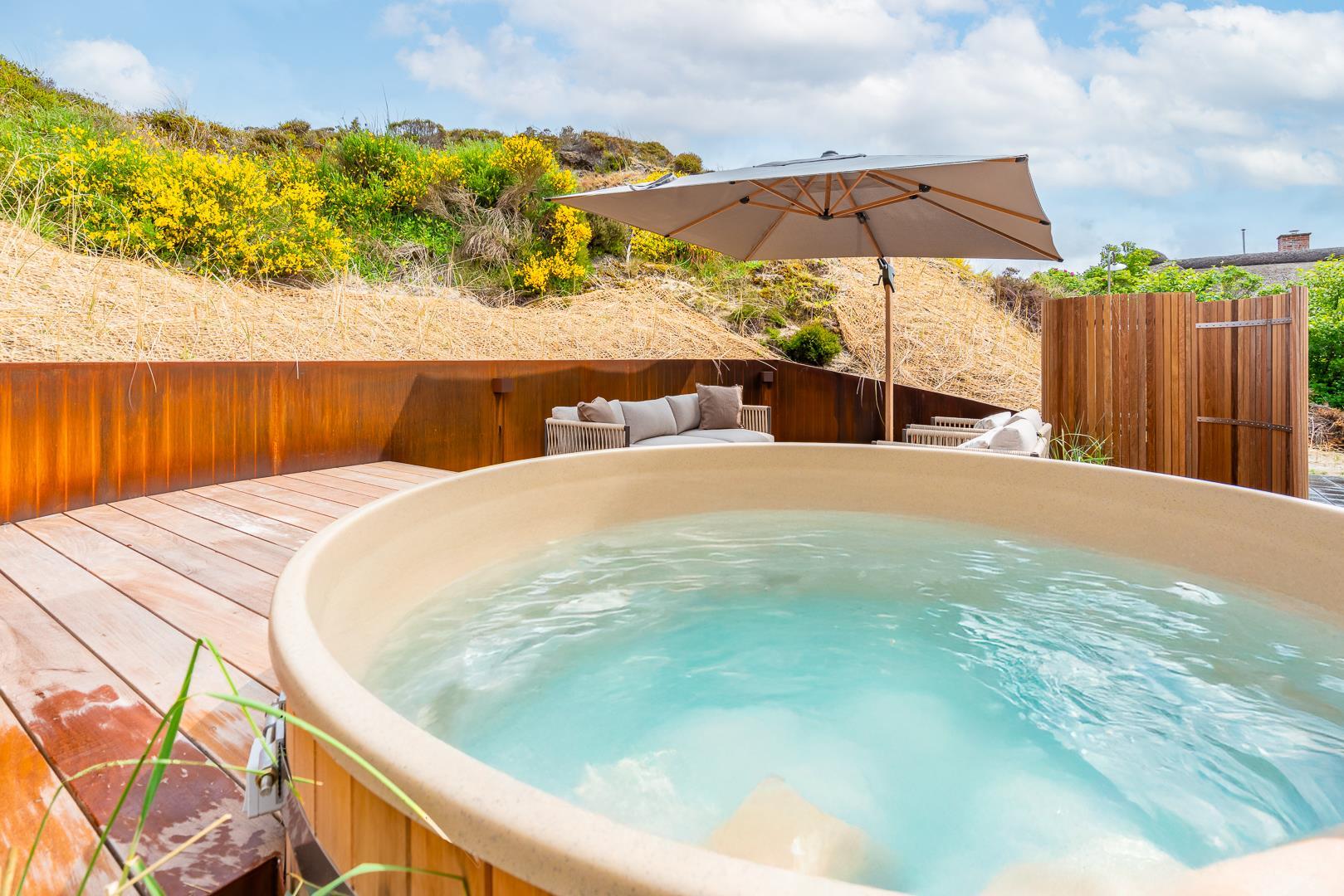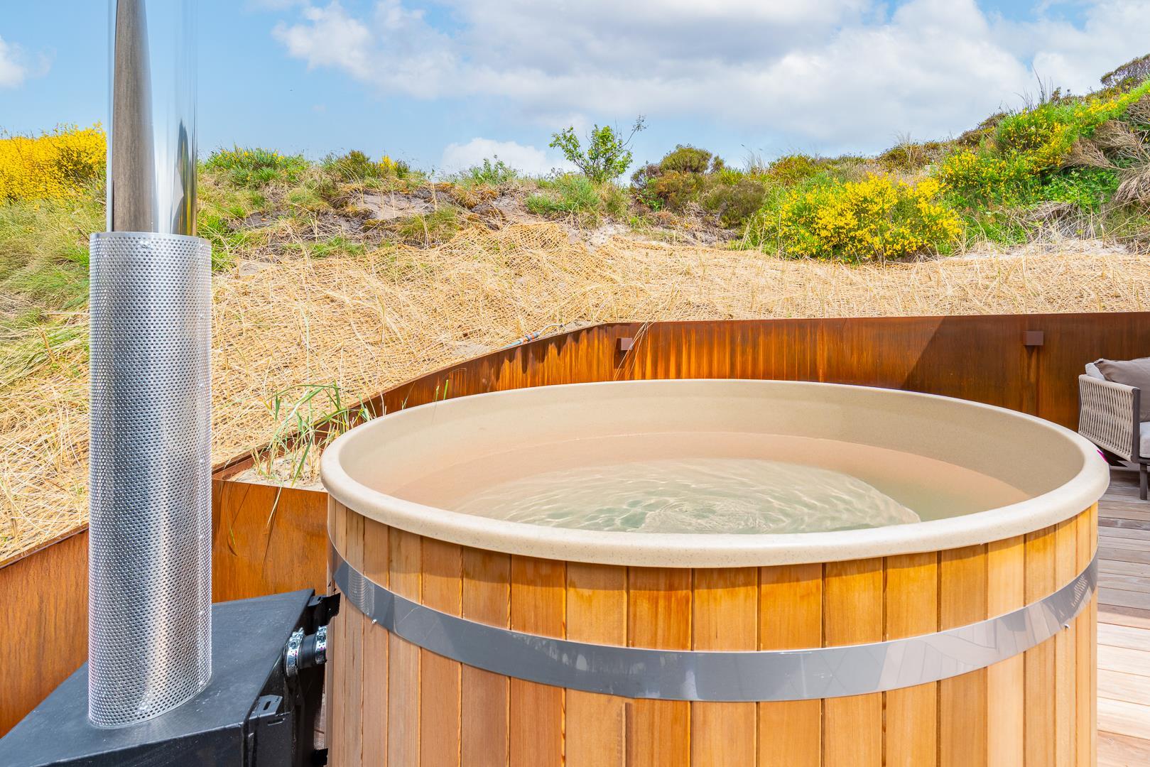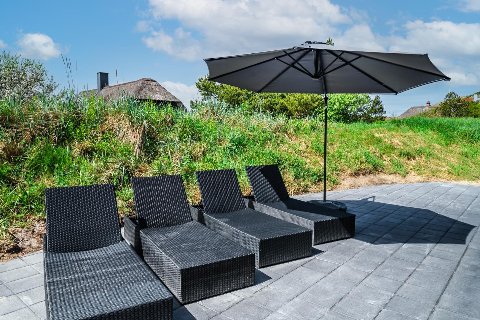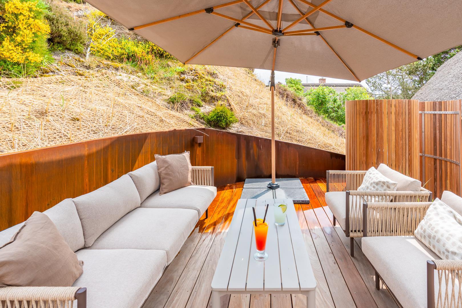 Her er både et lækkert og indbydende lounge område med loungemøbler og vildmarksbad og en stor overdækket terrasse, der vender mod vest.