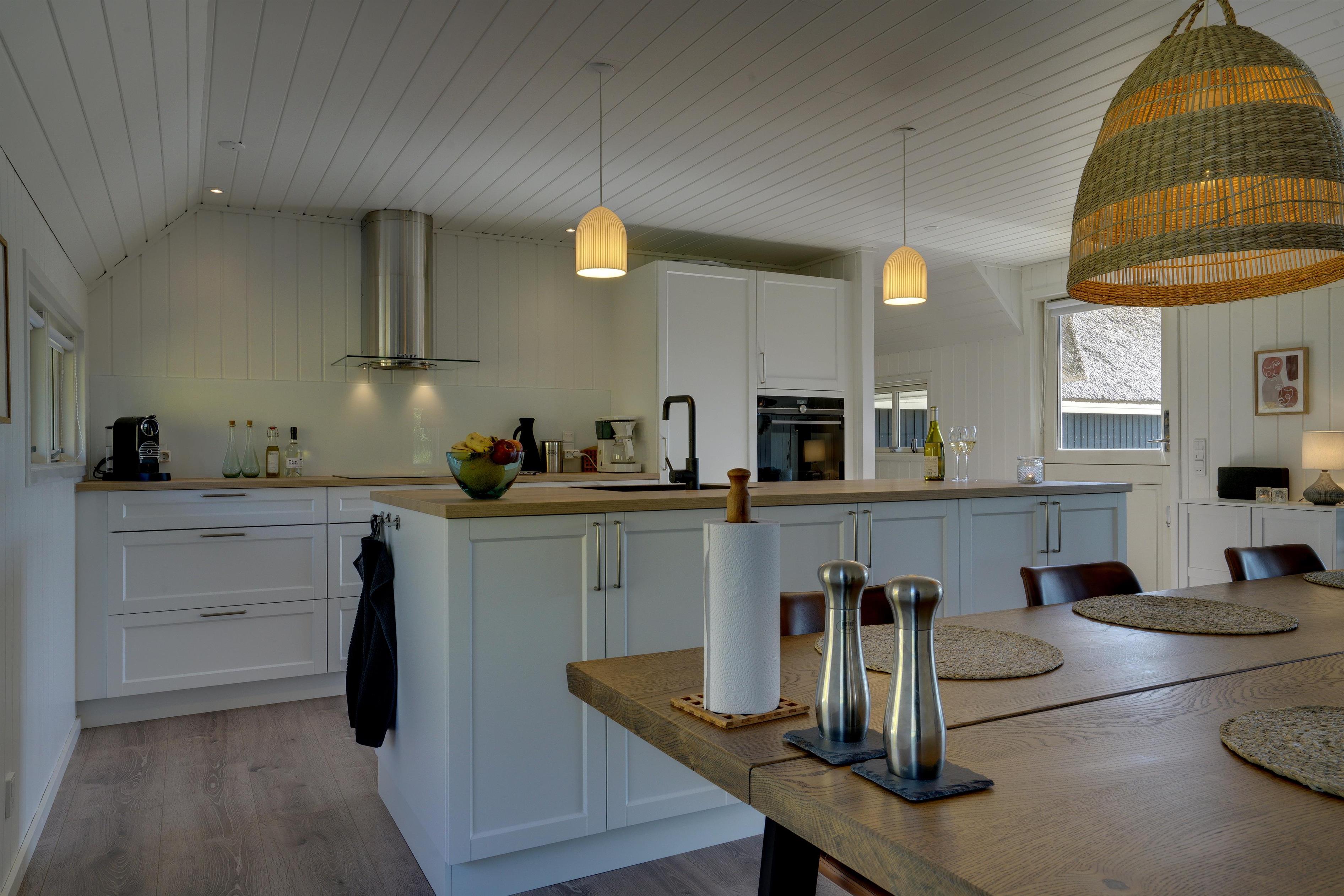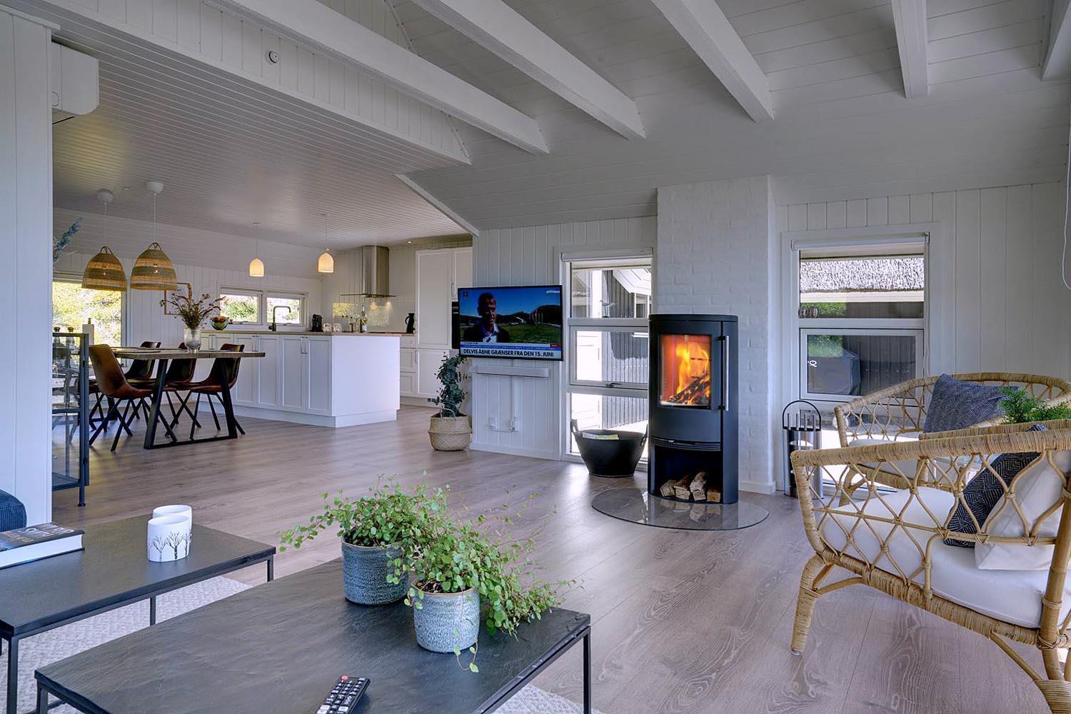 Opholdsrummet består af et flot køkken i åben forbindelse med en stue med loft til kip og synlige spær, der sætter stemningen sammen med brændeovnen, der også er helt ny. Herudover byder huset på fire soverum med dobbeltsenge og to badeværelser, hvoraf den ene har sauna.
