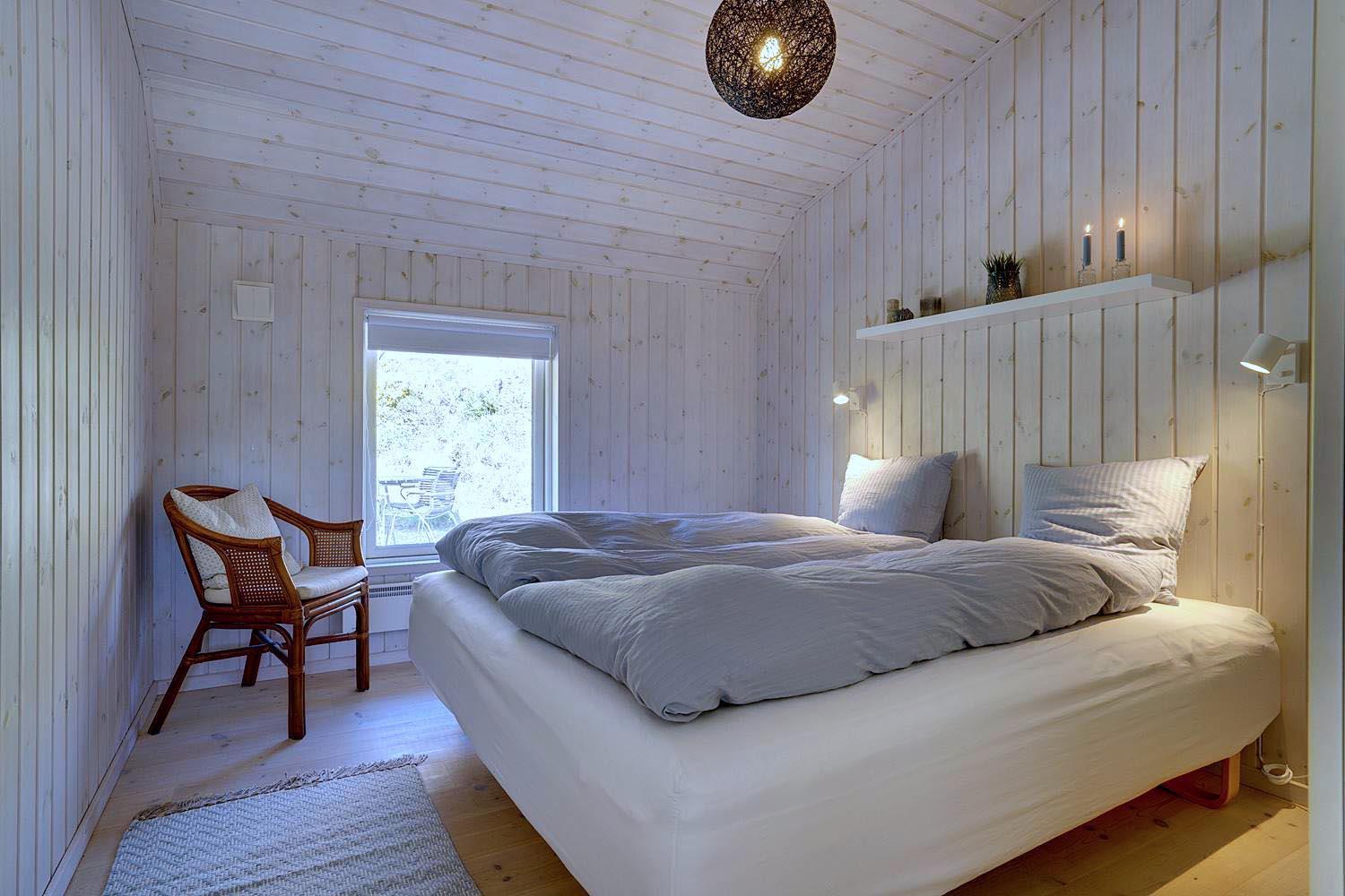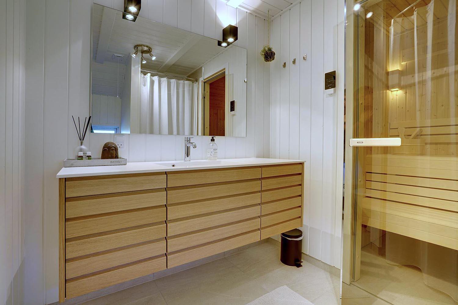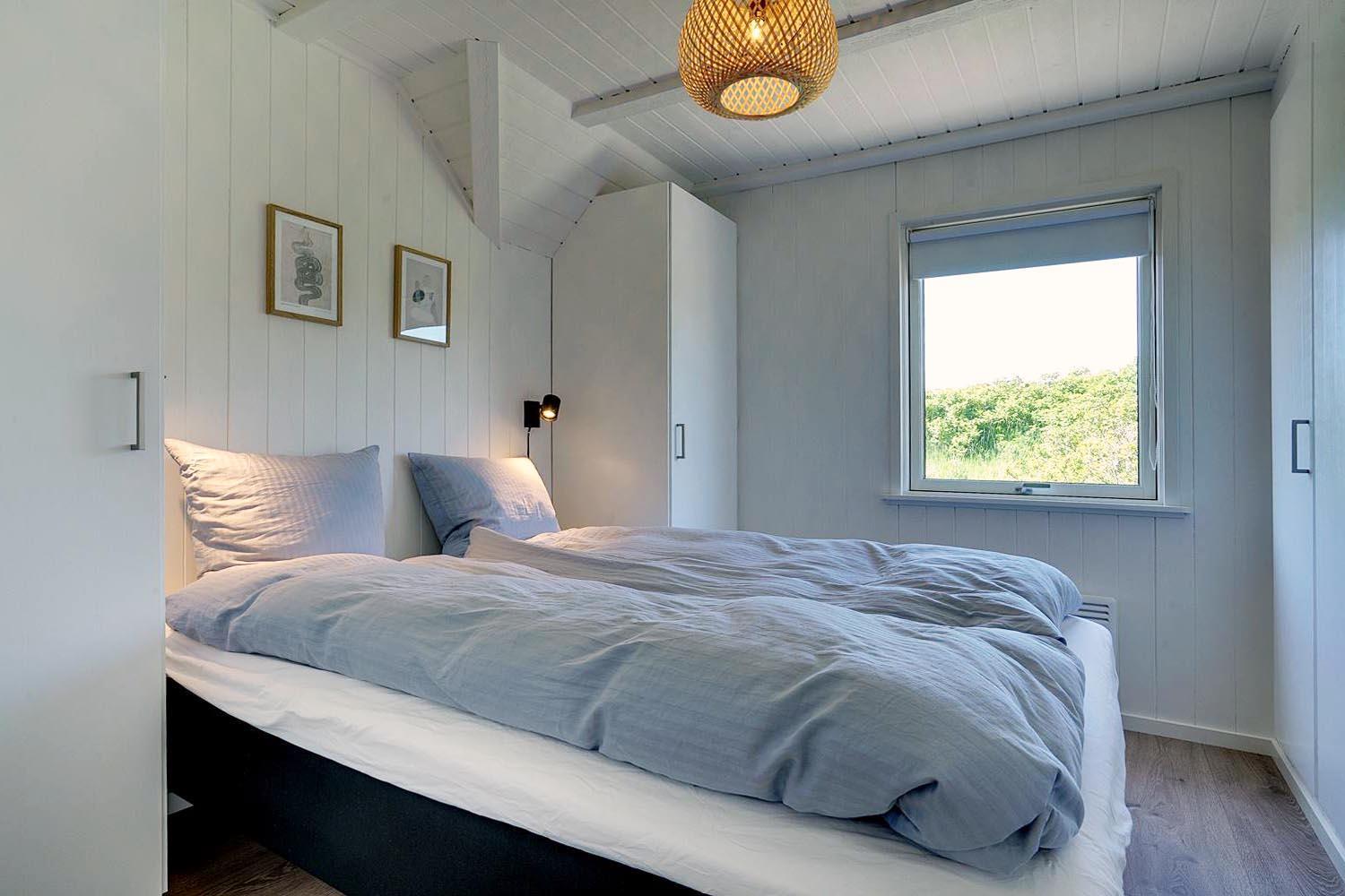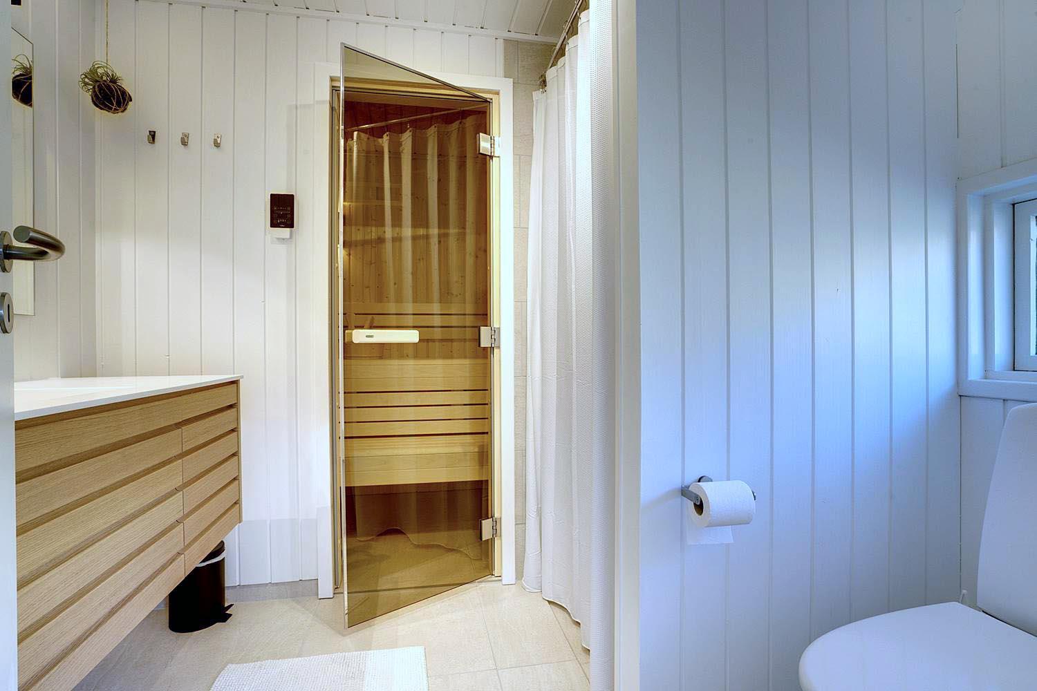 Her kan I nyde ferien i et helt lækkert sommerhus med blandt andet sauna, udendørsbruser og plads til seks personer, der alle kommer til at sove behageligt i nye (2023) dobbeltsenge - i det ene er der kontinentalseng.