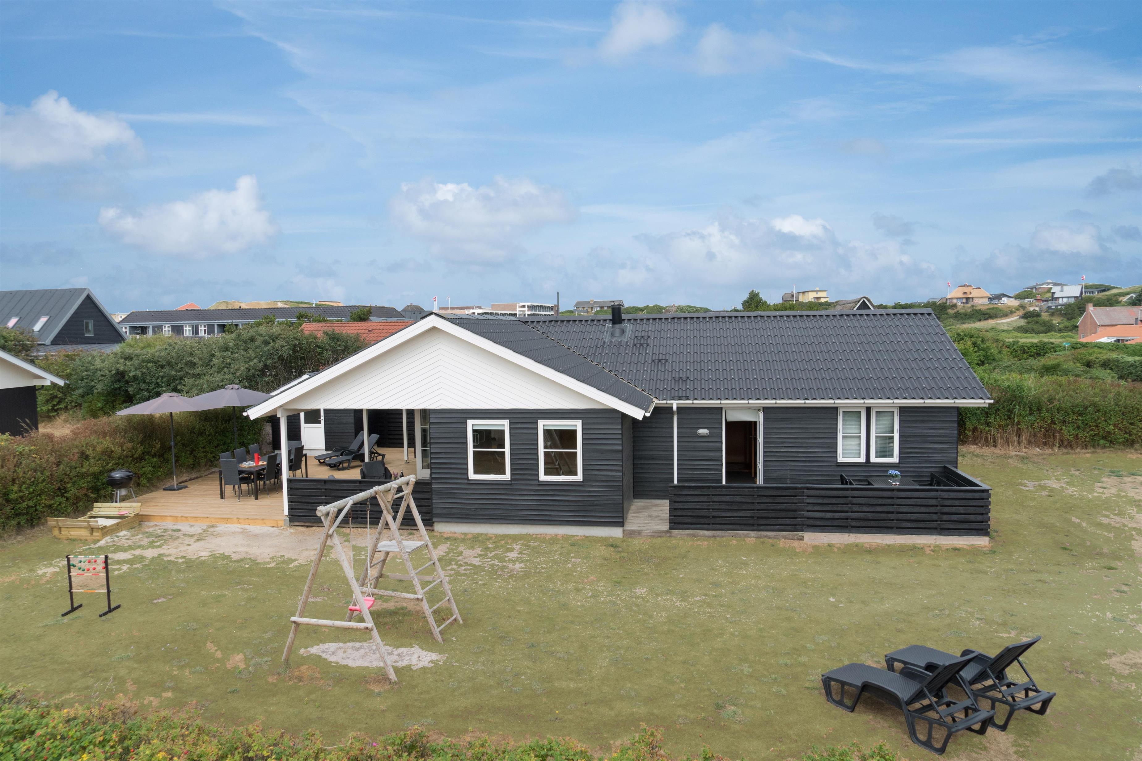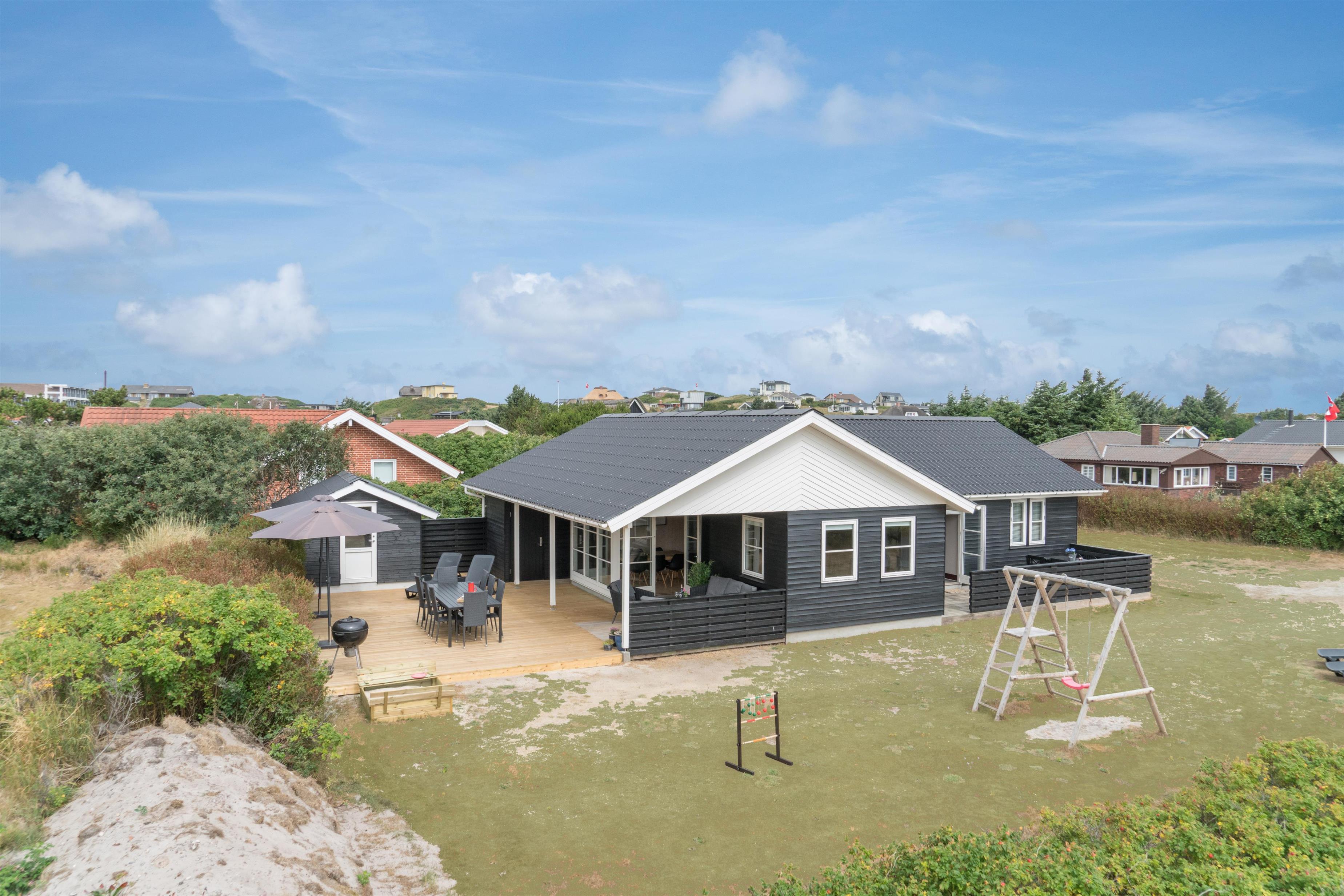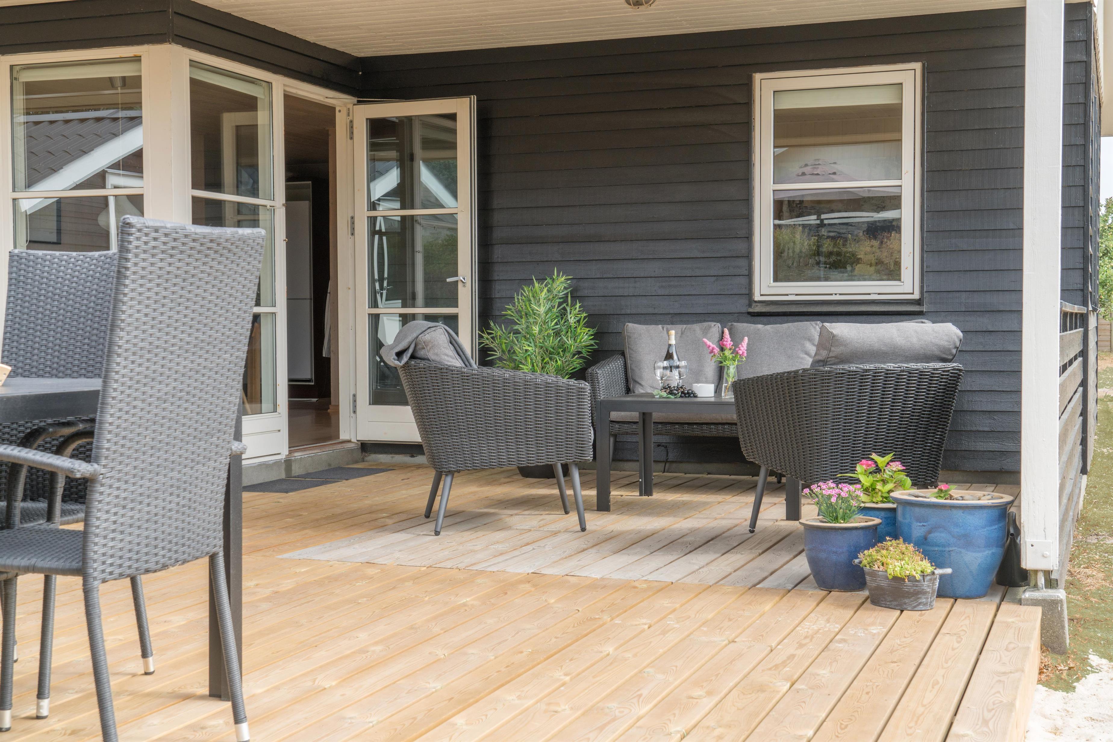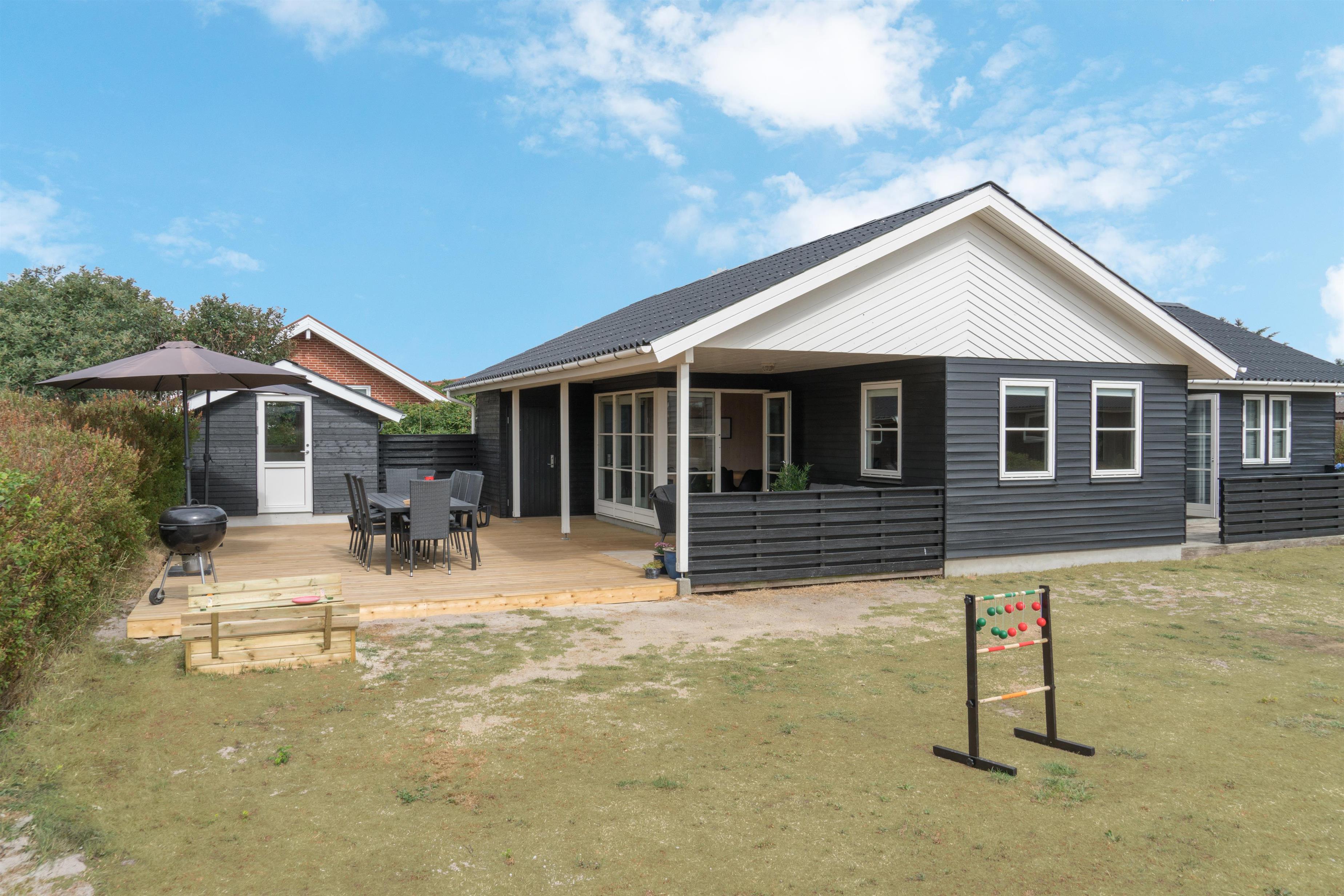 Dejligt feriehus beliggende på en skøn og børnevenlig naturgrund, meget tæt på byen og stranden og den gode handelsliv, men alligevel rolig og ugenert. Flot badeværelse. Huset har en rigtig god indretning og komfortable møbler. Fra stuen er der udgang til dejlig delvis overdækket terrasse med mange aktivitetsmuligheder for de mindste..