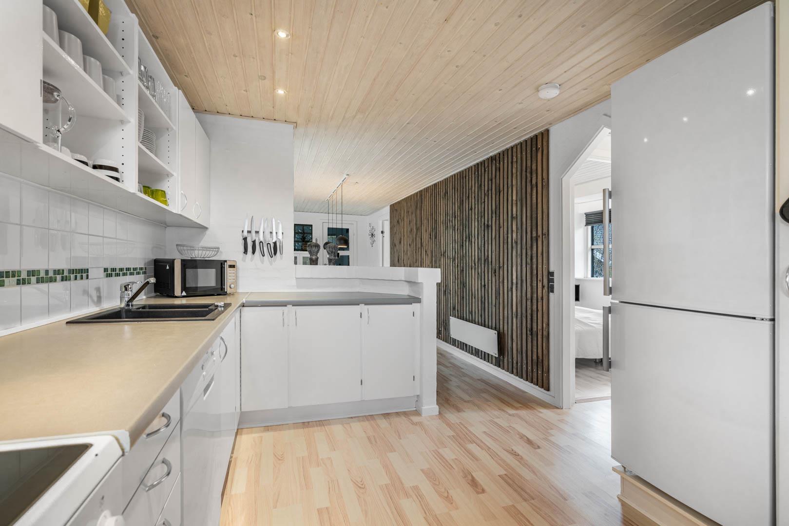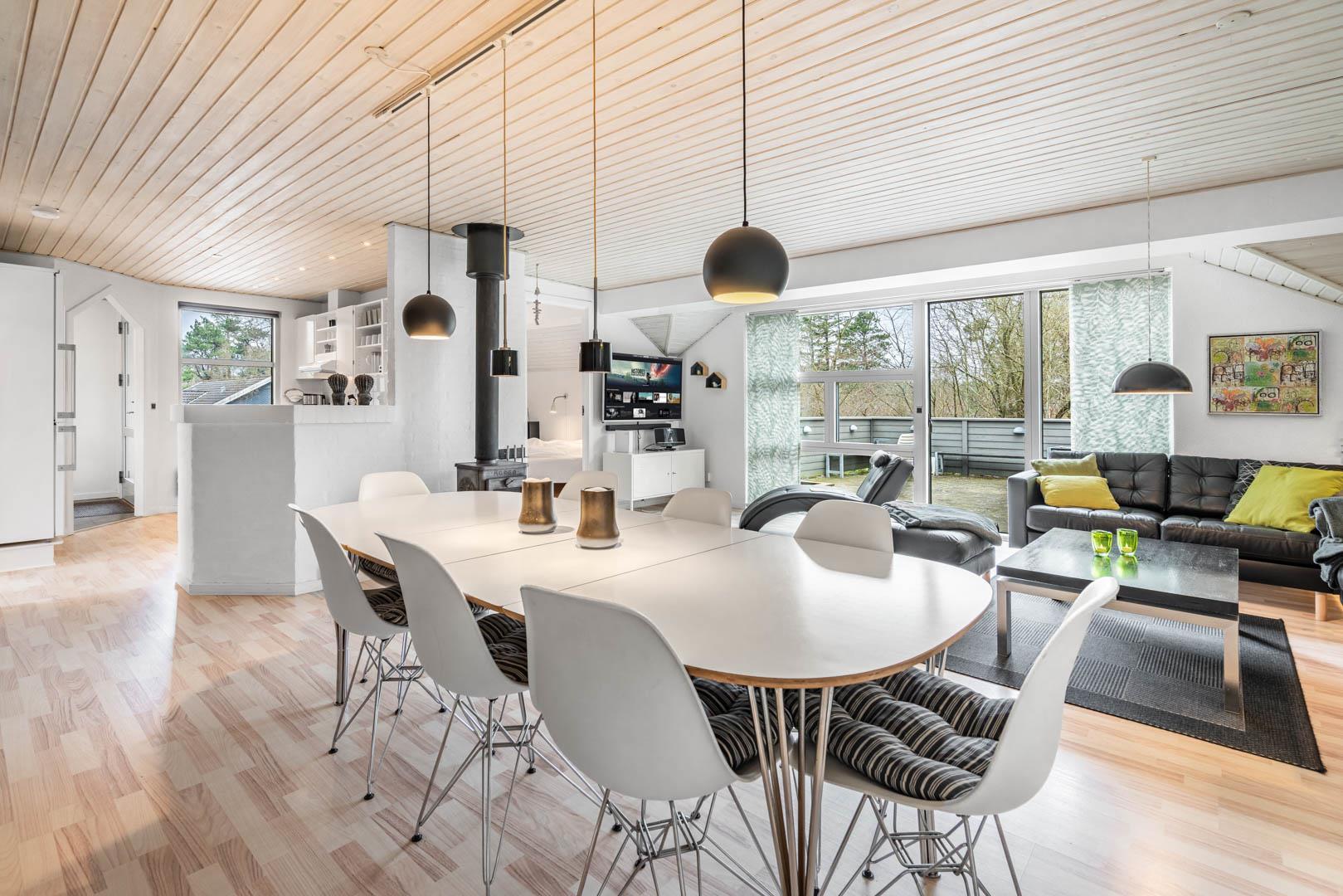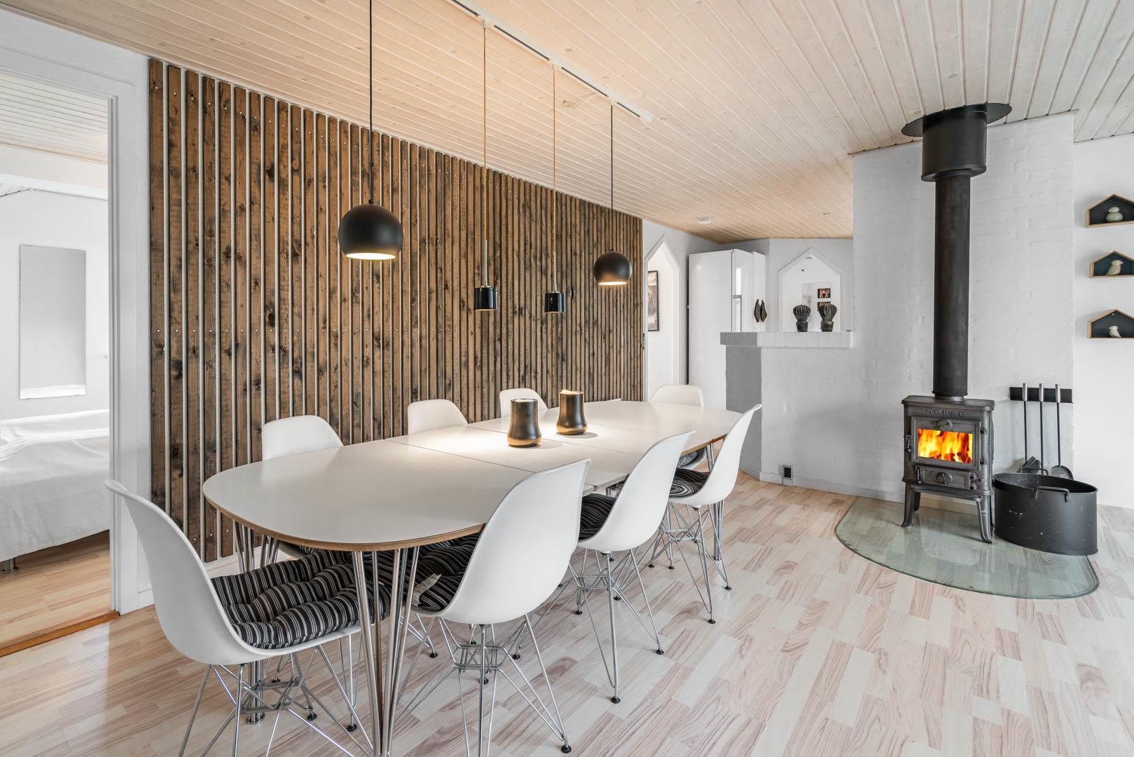 Når dagen er gået med hygge og leg, kan I smide jer med en i den rummelige, hyggelige og moderne stue og nyde varmen fra sommerhusets brændeovn. Sommerhuset er praktisk indrettet til 2 familier og der er derfor god plads til 8 personer.