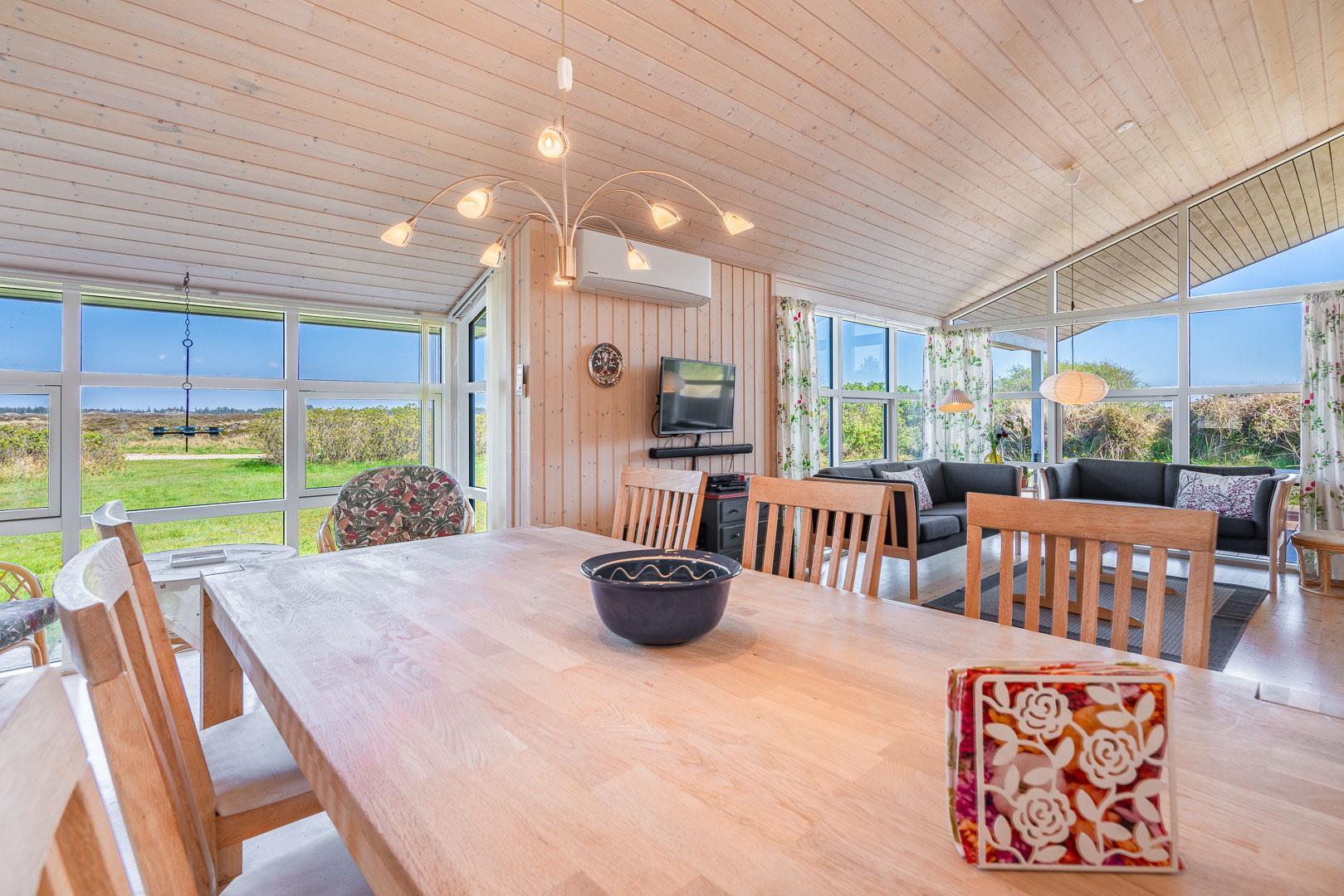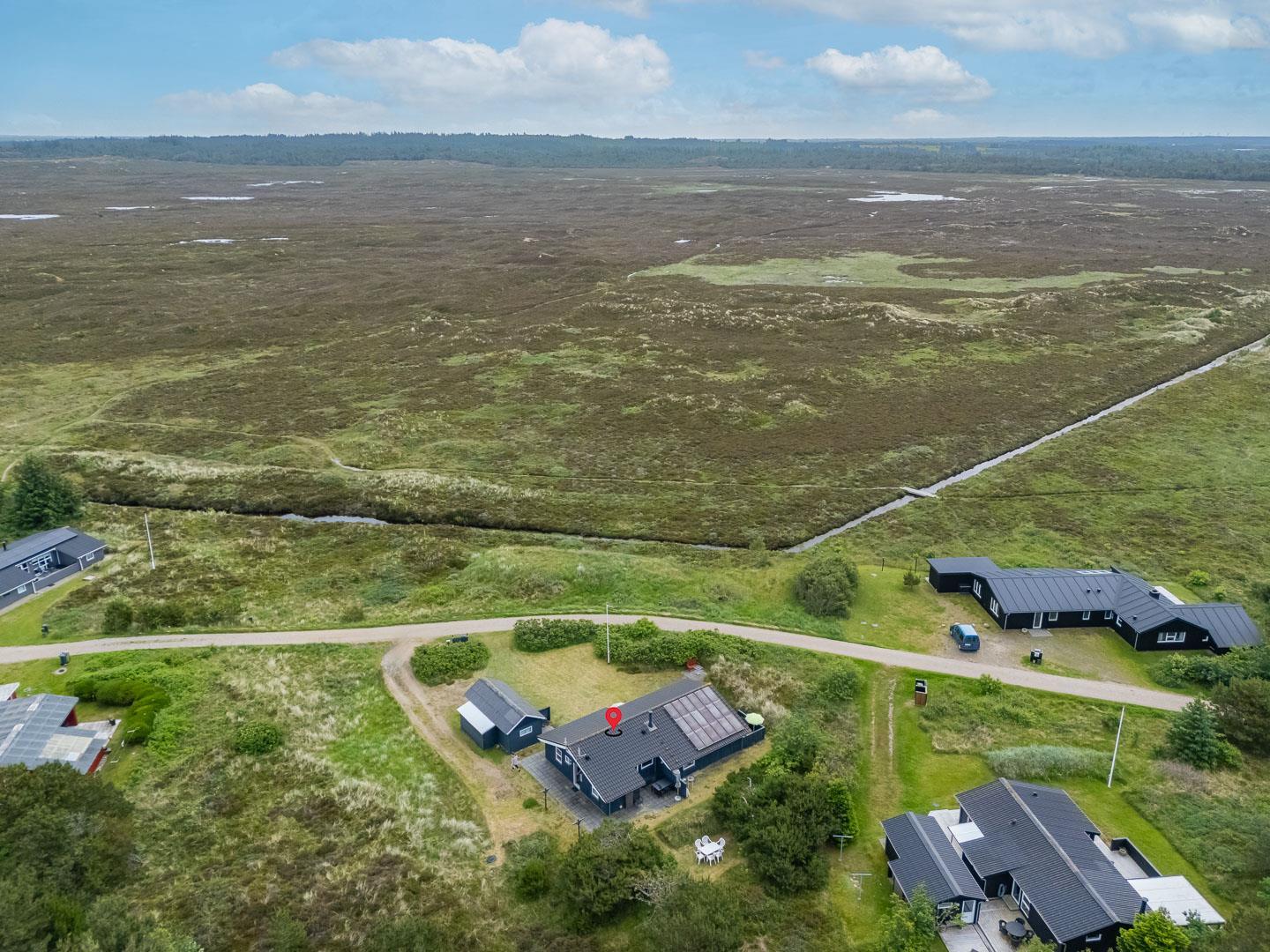 Beliggende i rolige omgivelser med en fortryllende udsigt over det fredede hedeareal, indbyder dette feriehus til afslapning og fordybelse i naturens skønhed. Træd ind i den hyggelige stue, hvor en varm brændeovn spreder en behagelig atmosfære, og køkkenet åbner sig op i en invitation til fælles madlavning og hyggelige måltider.