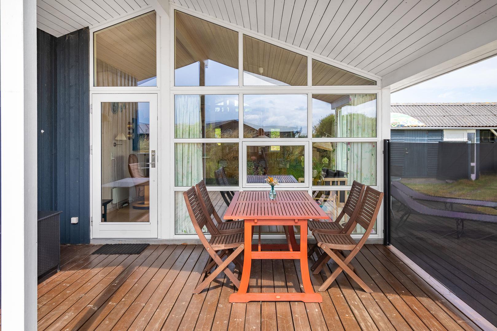 Fra stuen fører en dør ud til en fin overdækket terrasse, hvor du kan nyde morgenkaffen i solens varme stråler eller afslutte dagen med en stjerneklar himmel som kulisse.