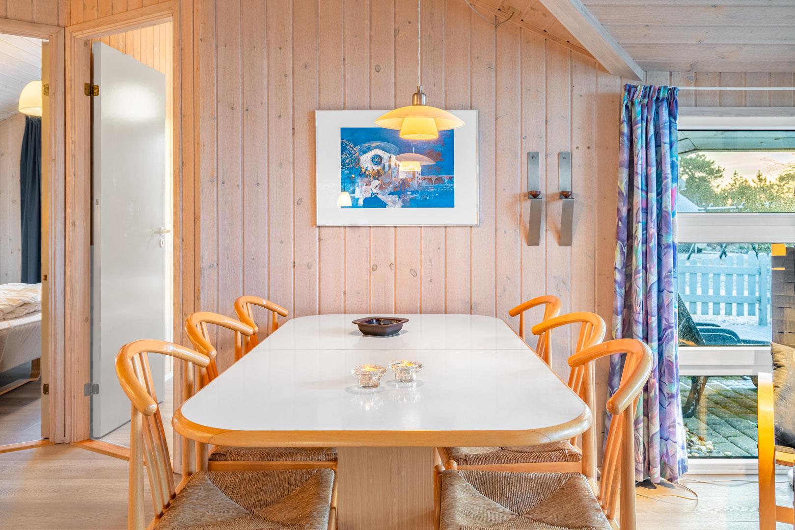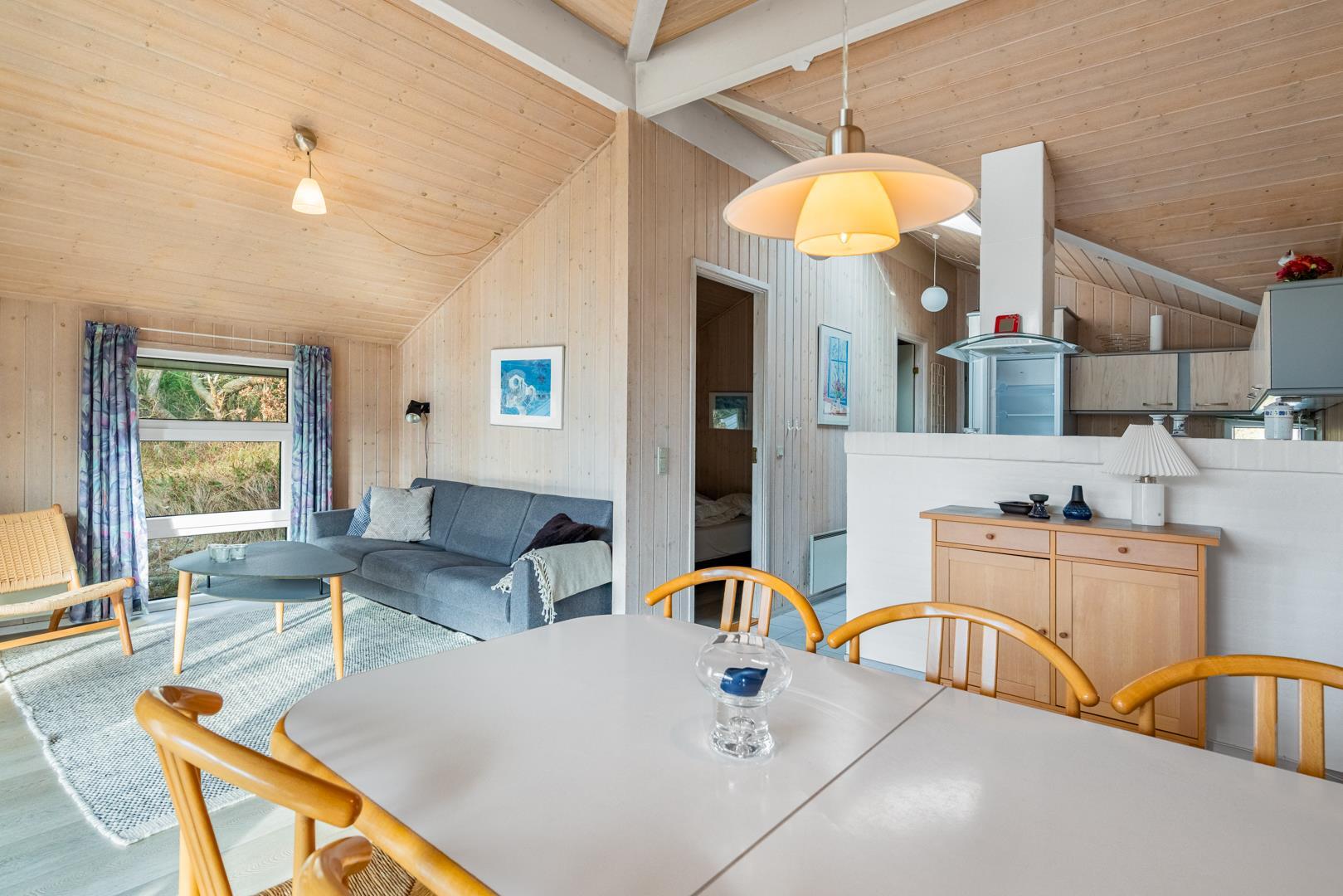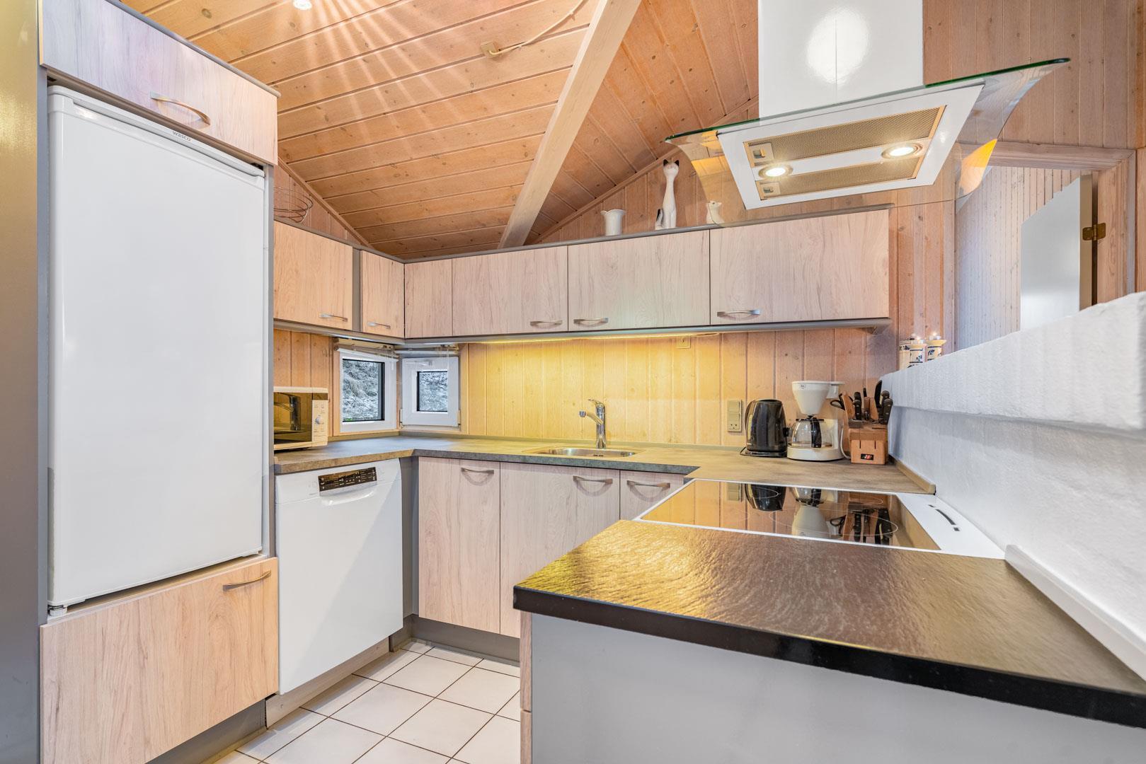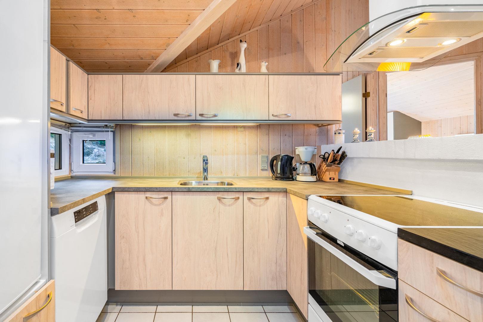 I feriehuset finder du et flot og veludstyrede køkken, som ligger i åben forbindelse med stuen. Så her går du ikke glip af familiehyggen selvom det er dig der står for madlavningen.