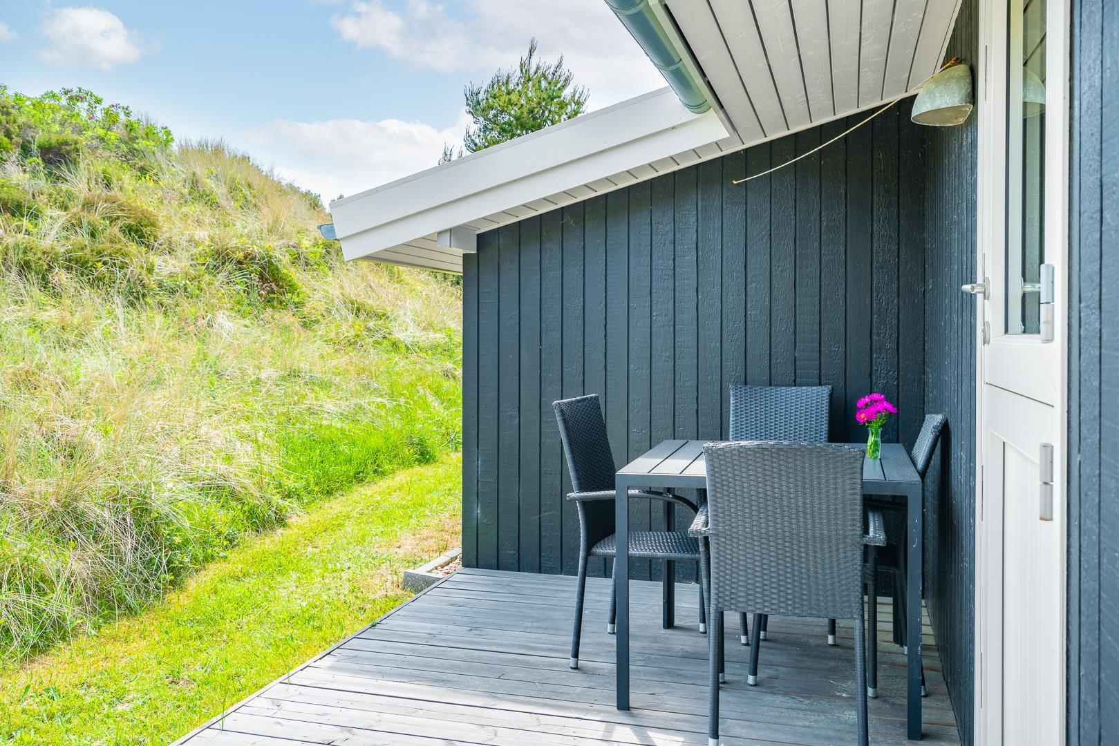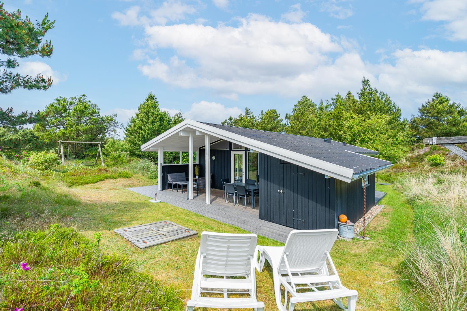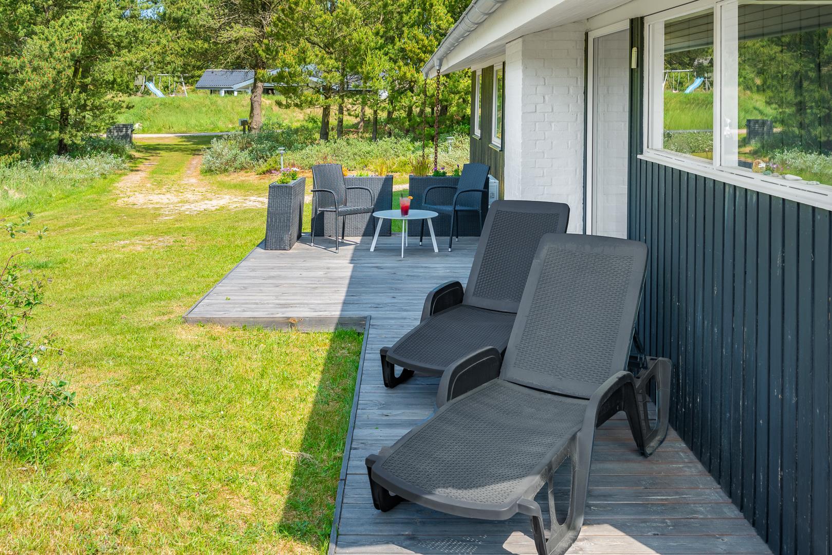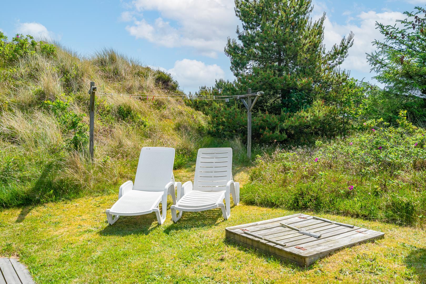 Rundt om huset findes desuden flere gode terrasseområder, som giver mulighed for at nyde solen og naturen hele dagen – uanset tidspunkt. Et sommerhus med masser af charme og praktiske faciliteter – klar til at danne rammen om en skøn ferie i Henne Strand.