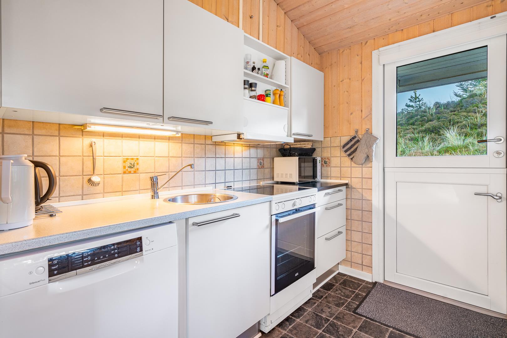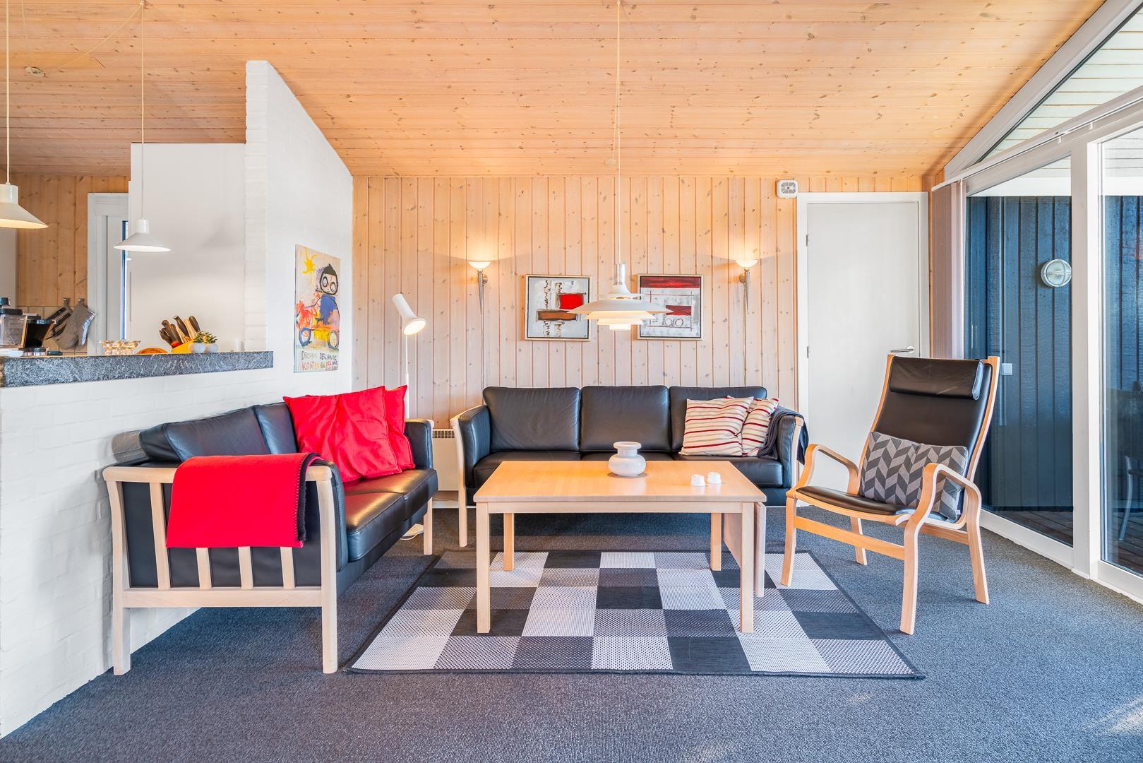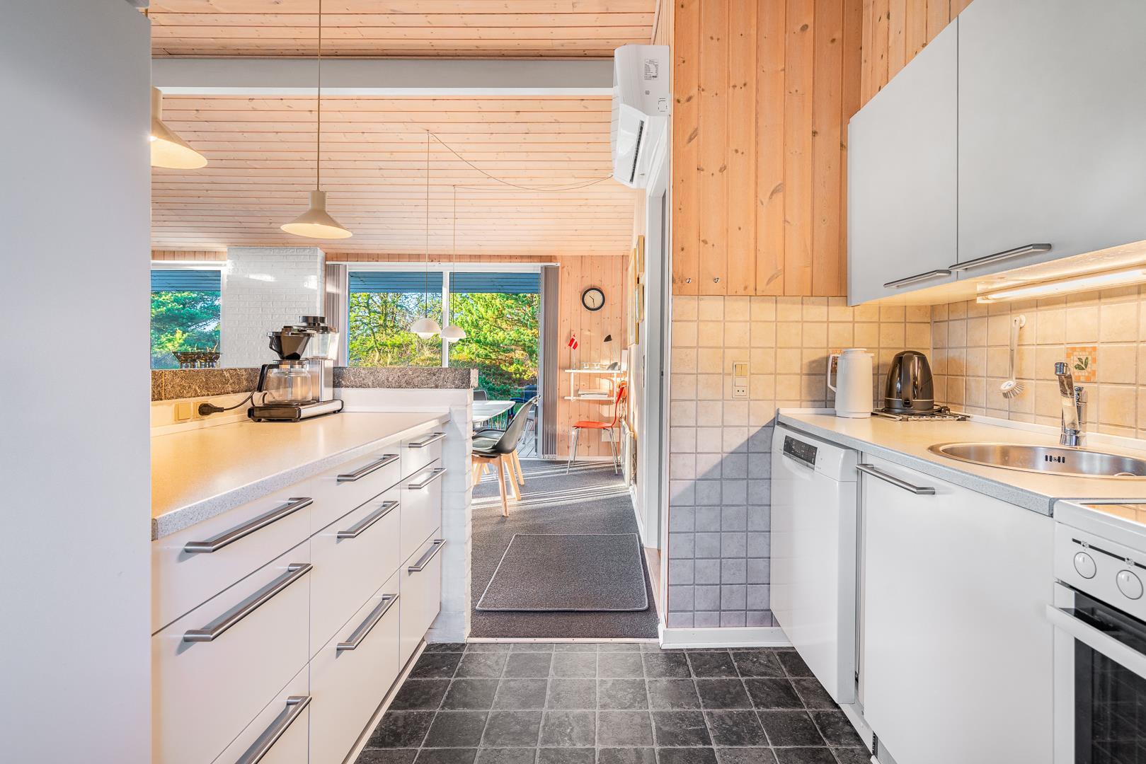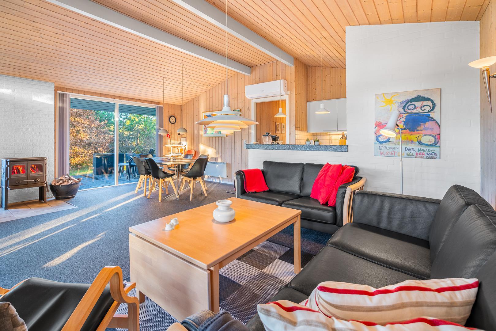 Sommerhuset rummer to badeværelser, hvoraf det ene har direkte adgang til sauna – perfekt til wellness og afslapning efter en aktiv dag ved havet. Det velindrettede køkken-alrum er udstyret med brændeovn og energivenlig varmepumpe, og herfra er der direkte udgang til en delvist overdækket træterrasse.