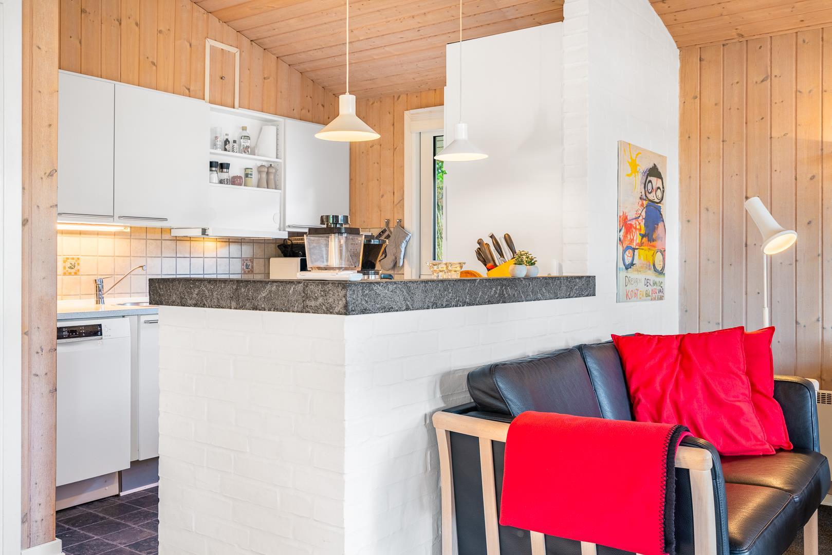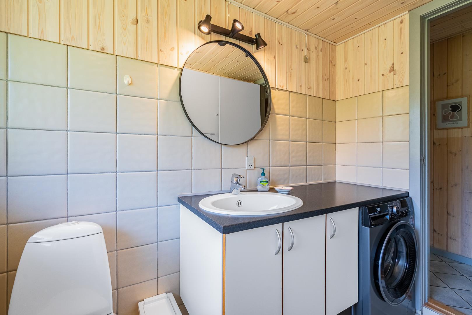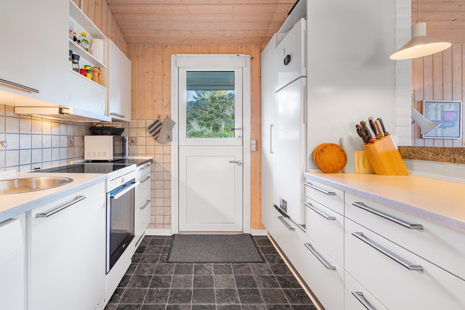 Sommerhuset rummer to badeværelser, hvoraf det ene har direkte adgang til sauna – perfekt til wellness og afslapning efter en aktiv dag ved havet. Det velindrettede køkken-alrum er udstyret med brændeovn og energivenlig varmepumpe, og herfra er der direkte udgang til en delvist overdækket træterrasse.