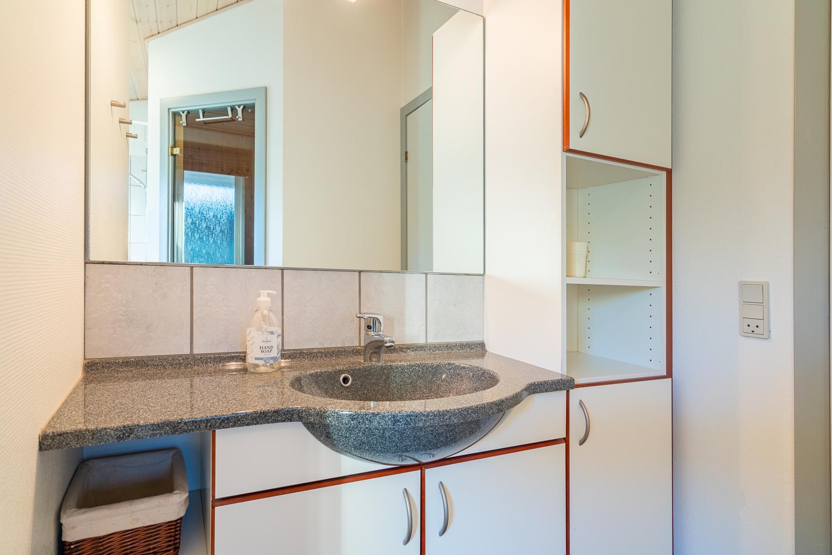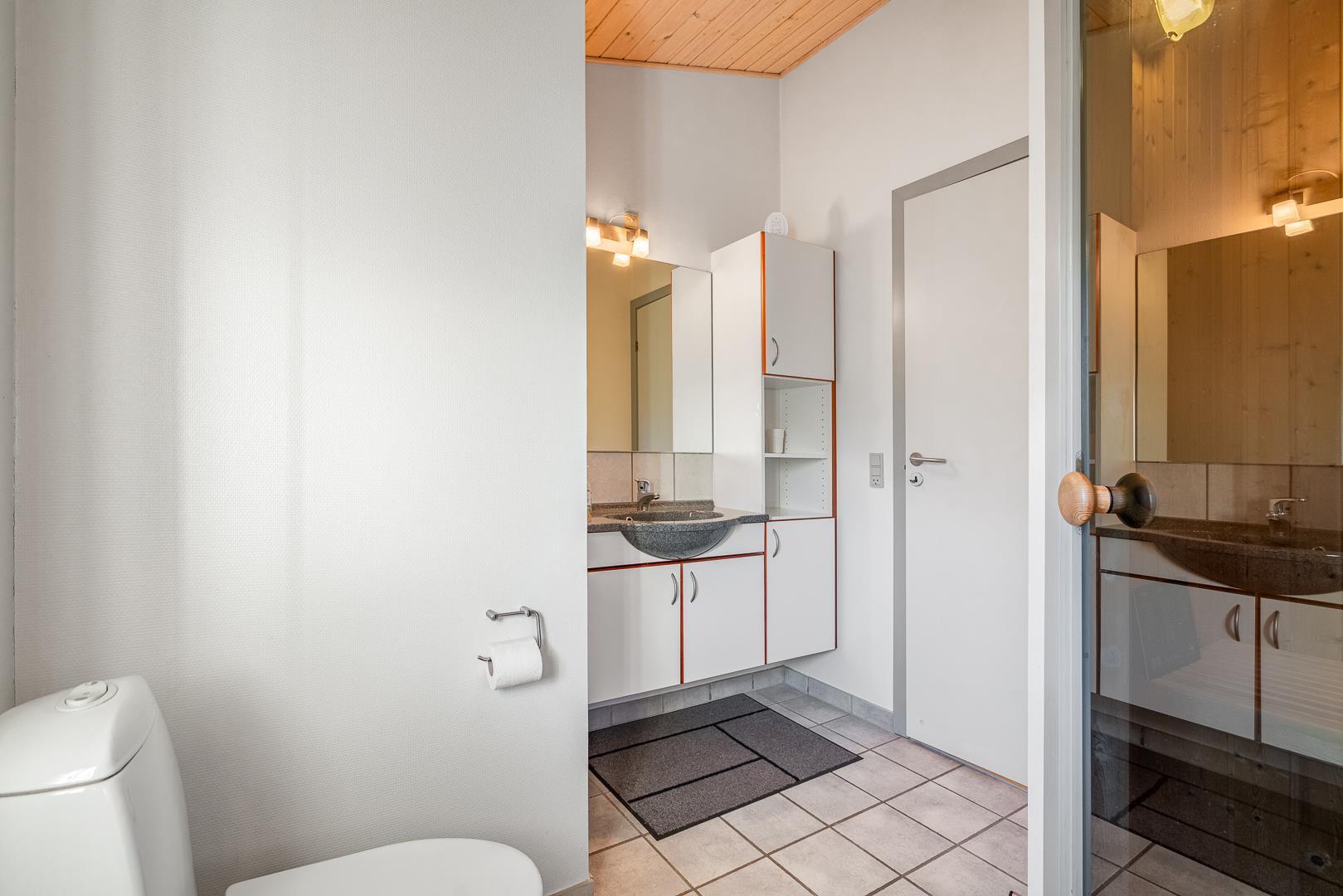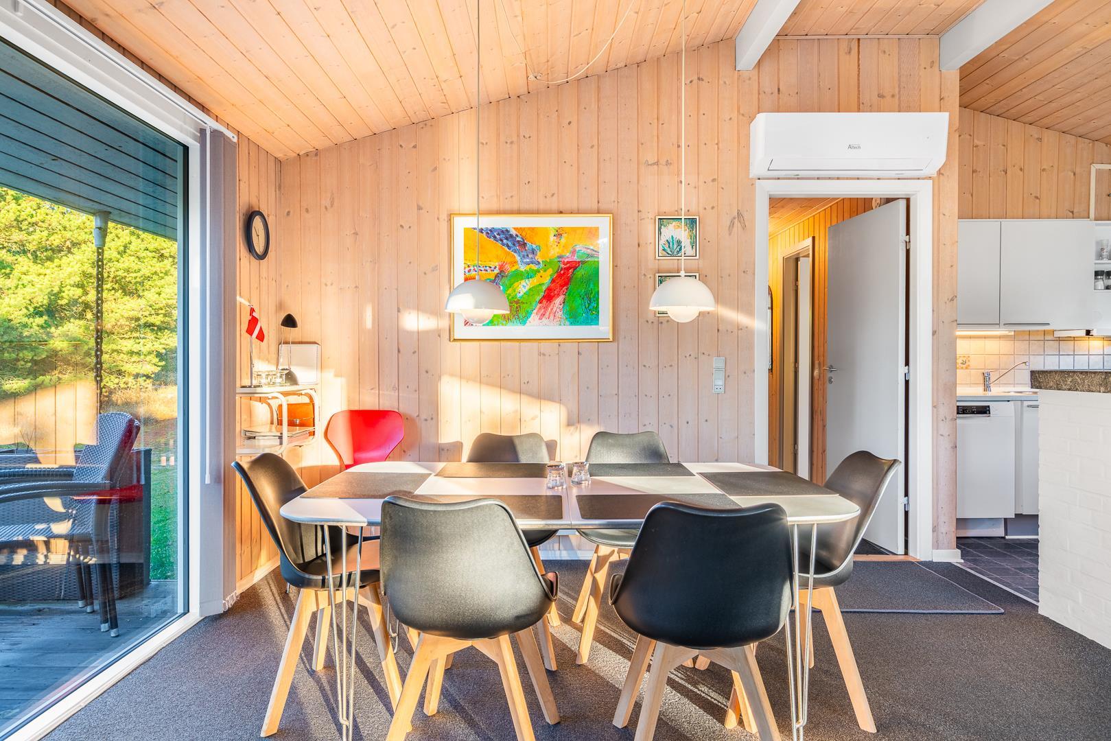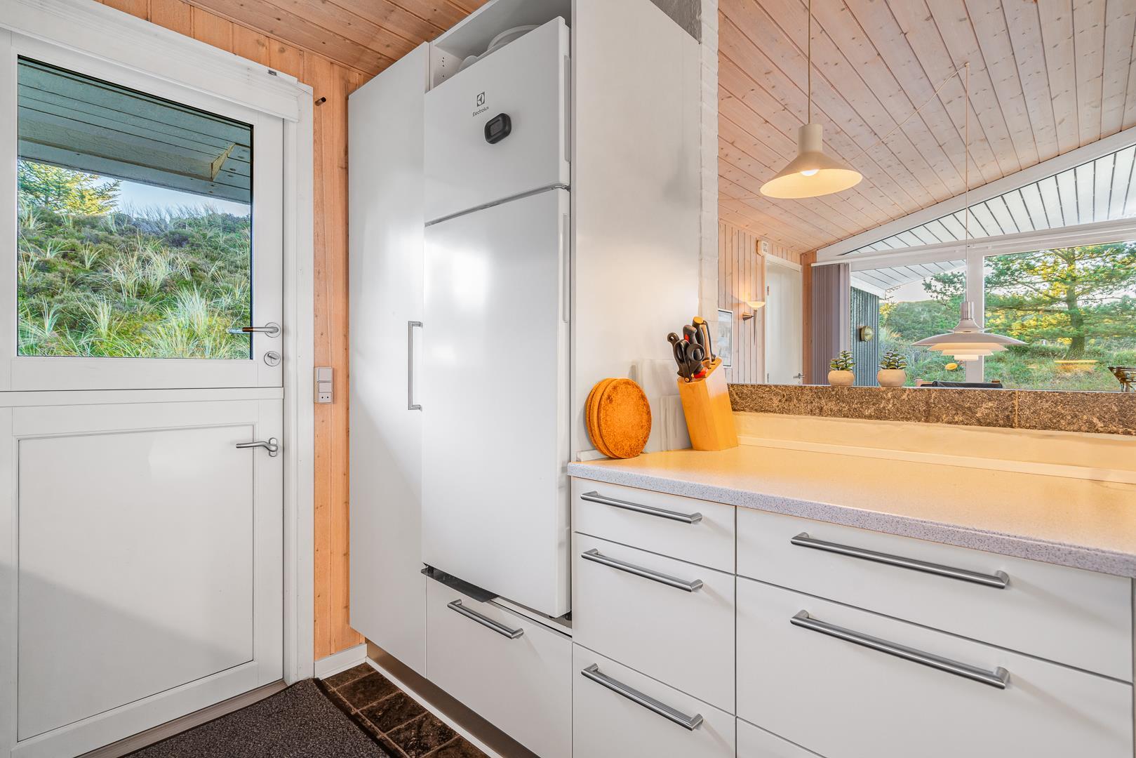 Sommerhuset rummer to badeværelser, hvoraf det ene har direkte adgang til sauna – perfekt til wellness og afslapning efter en aktiv dag ved havet. Det velindrettede køkken-alrum er udstyret med brændeovn og energivenlig varmepumpe, og herfra er der direkte udgang til en delvist overdækket træterrasse.