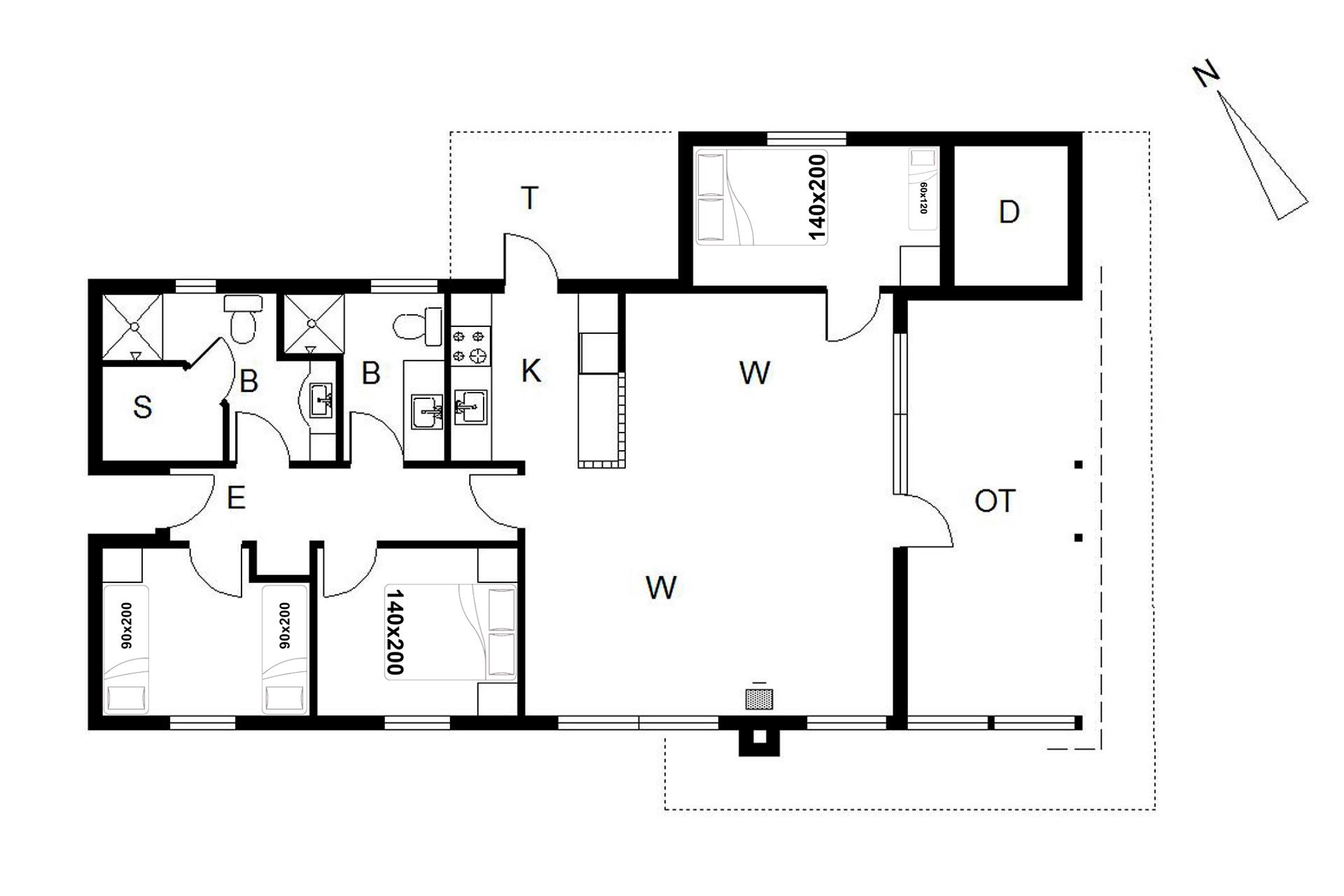 Sengestørrelse: Sengestørrelse: 2 dobbeltsenge 140 x 200 cm + 2 enkeltsenge 90 x 200 cm + 1 tremmeseng 60 x 120 cm.