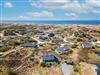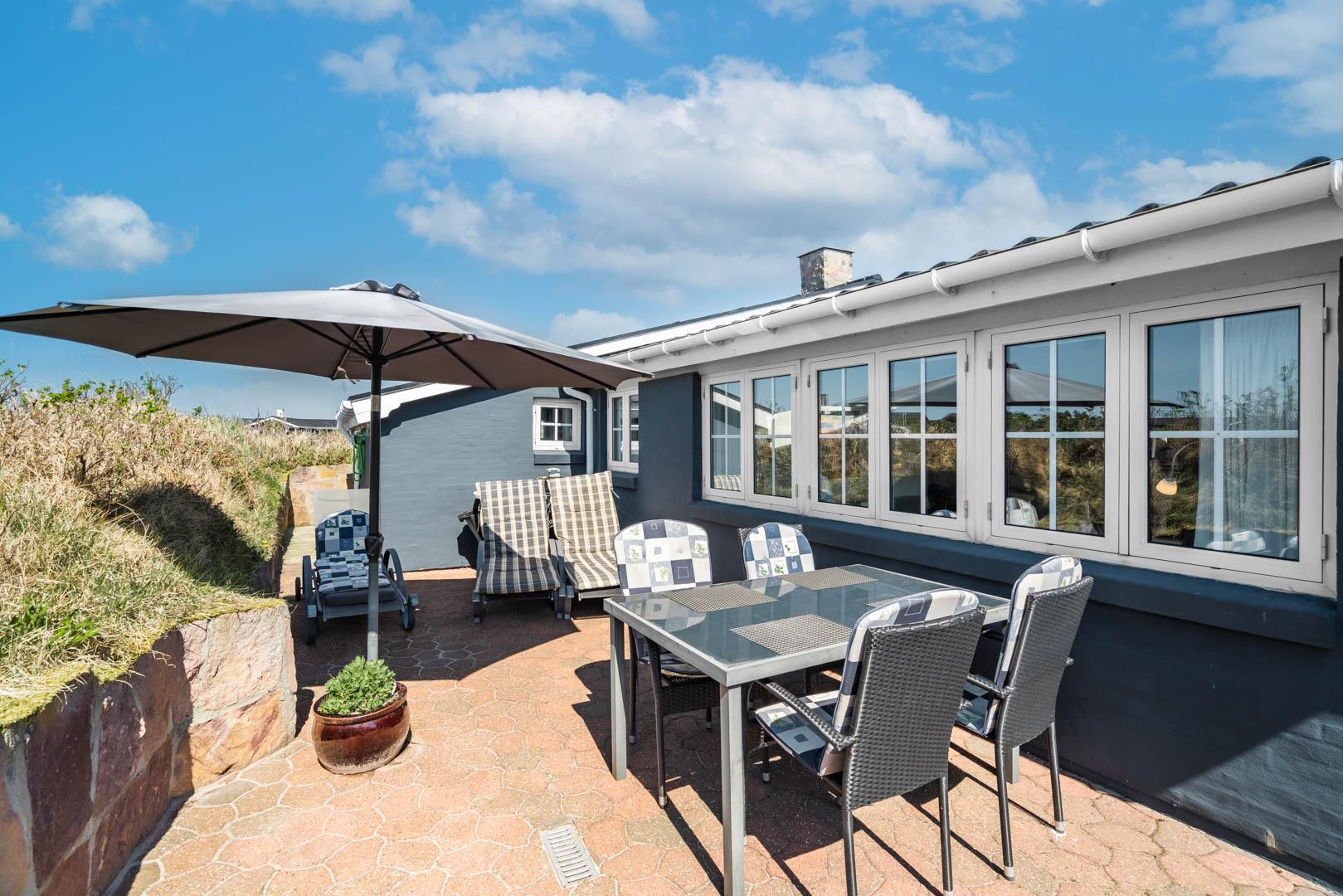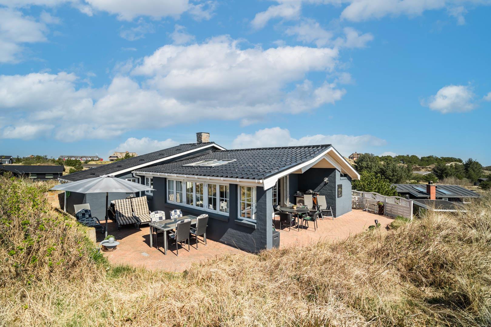 Der er blik ud over stråtækt sommerhus idyl og klitlandskab fra terrassen. Til husets mindre beboere er der både sandkasse og en gynge.