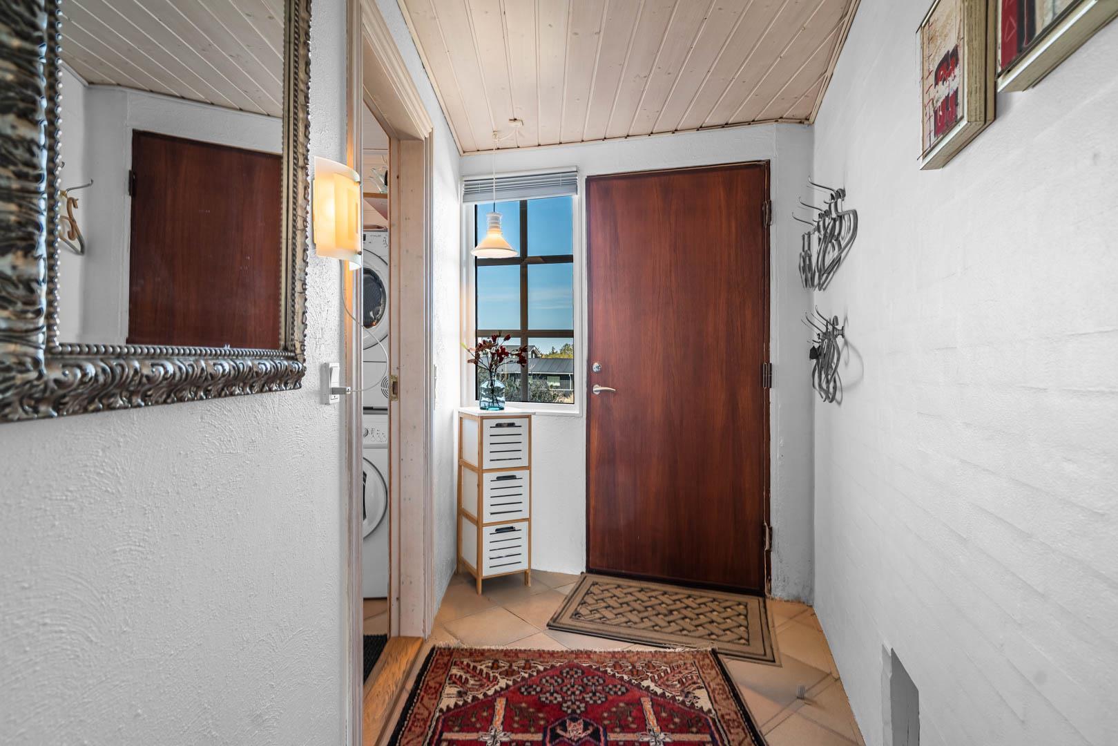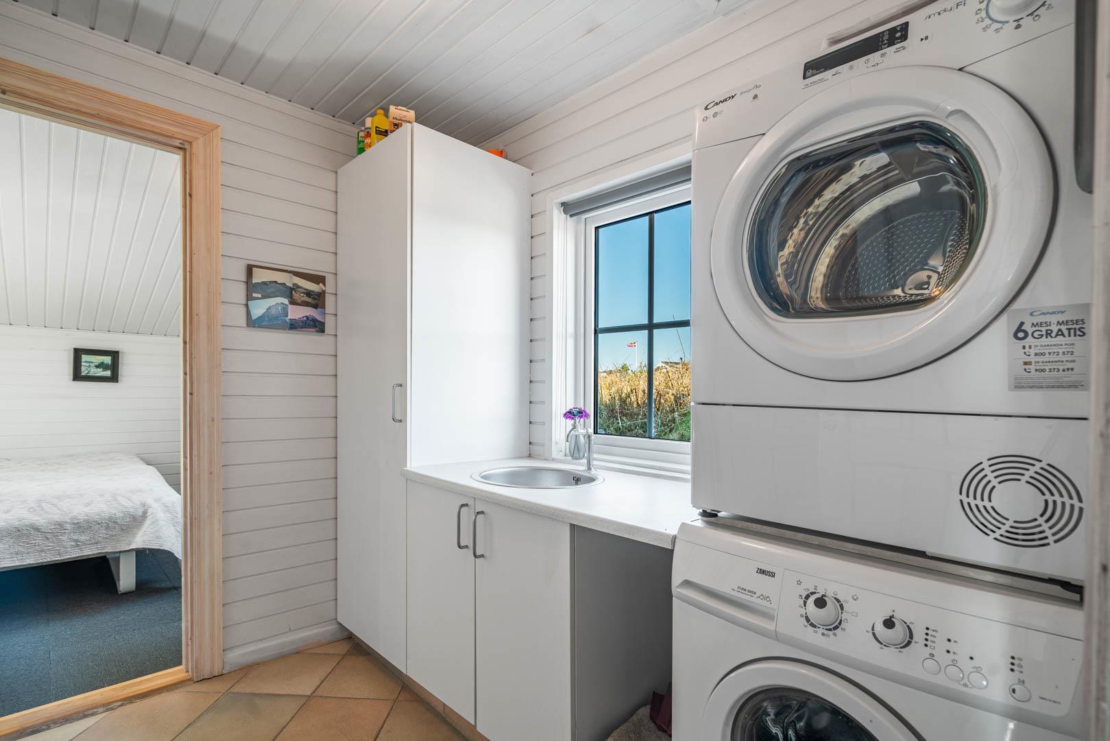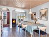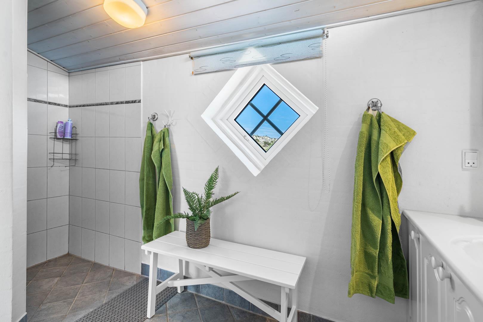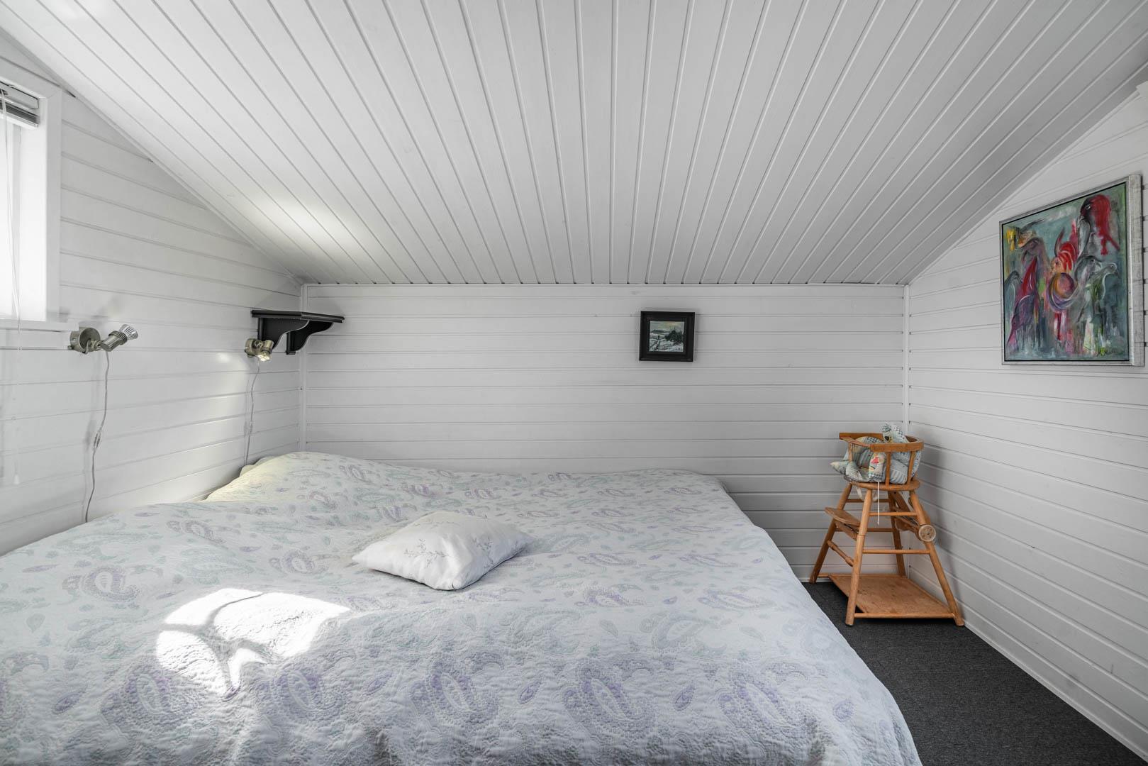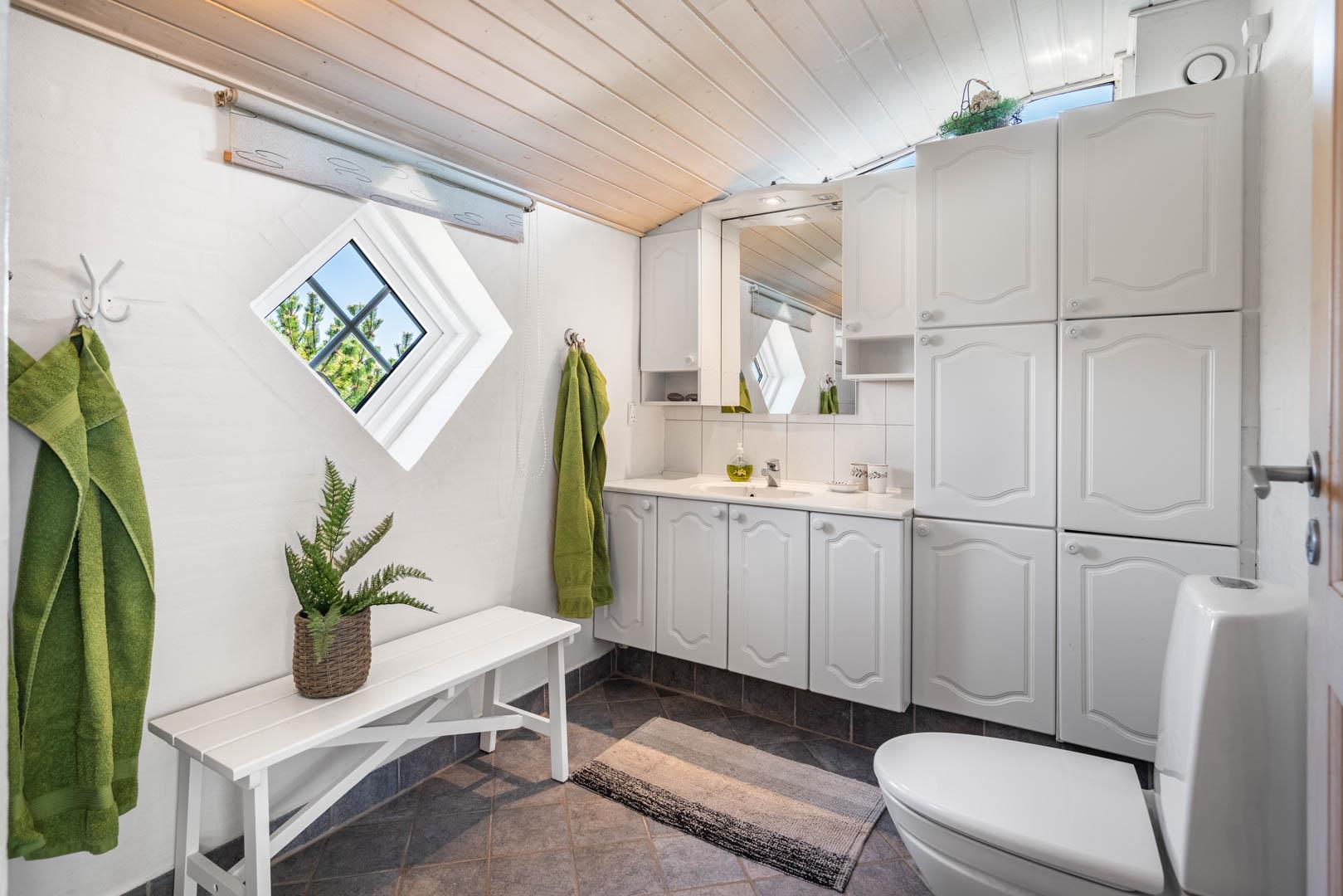 I stuen er der også brændeovn. Fra sofaen kan du på skyfrie aftener, nyde stjernehimlen igennem tagvinduet. I det rummelige badeværelse får du glæde af gulvarmen på den kolde tid af året.