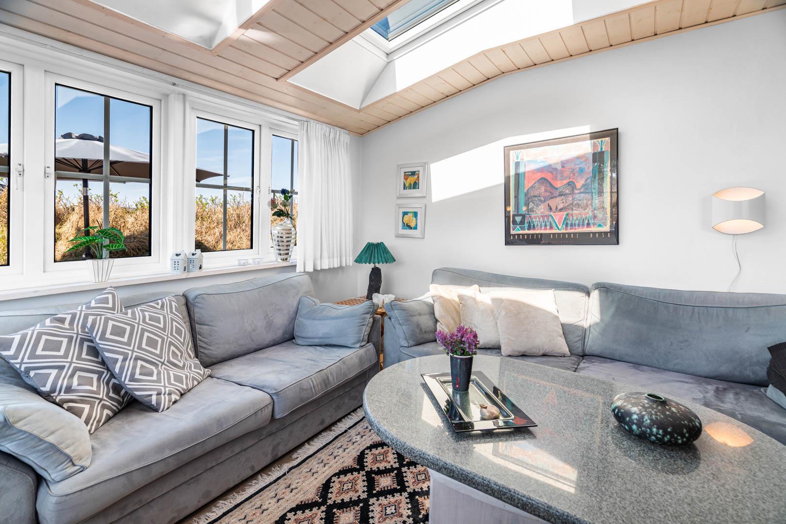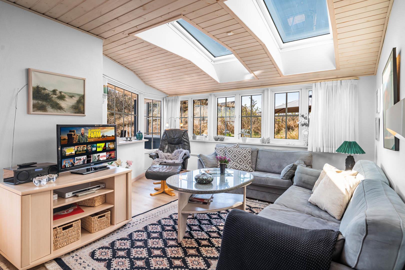 Fra køkkenet er der åben ind i stuen. 2 tagvinduer i stuen sørger for naturligt lysindfald på selv overskyede dage.