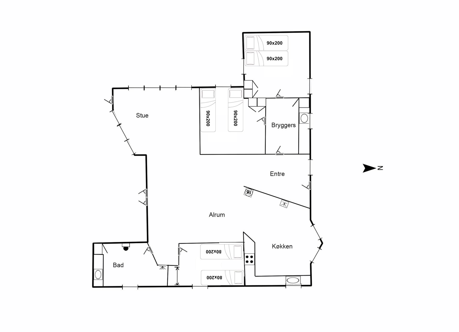 Sengestørrelse: 1 dobbeltseng med 2 madrasser 90 x 200 cm + 2 enkeltsenge 90 x 200 cm + 2 enkeltsenge 80 x 200 cm.