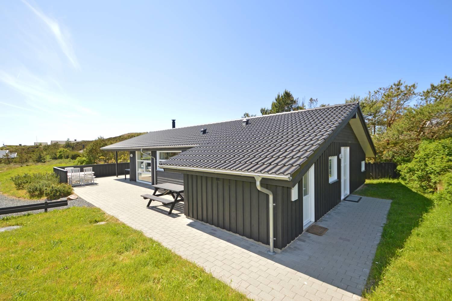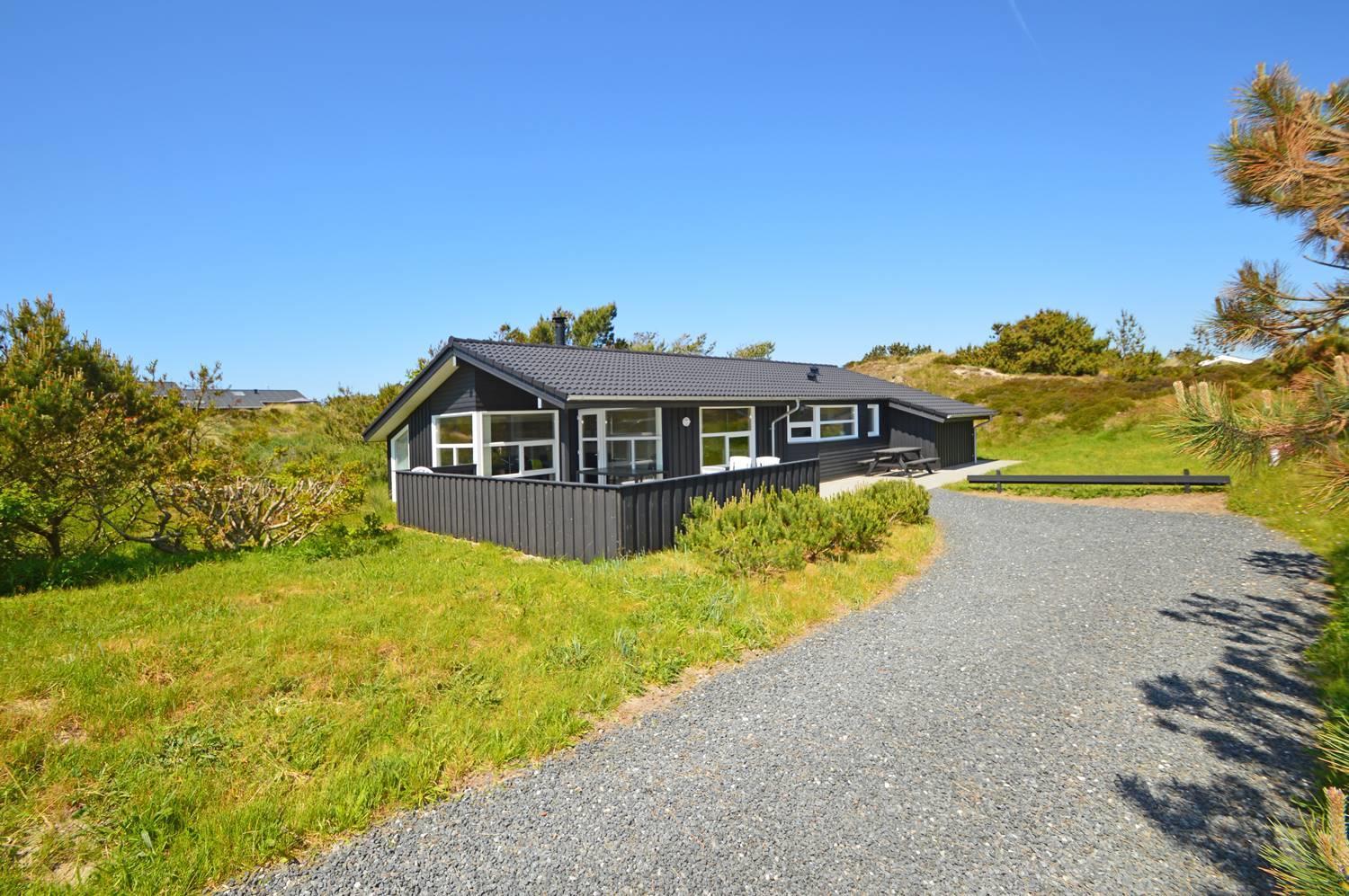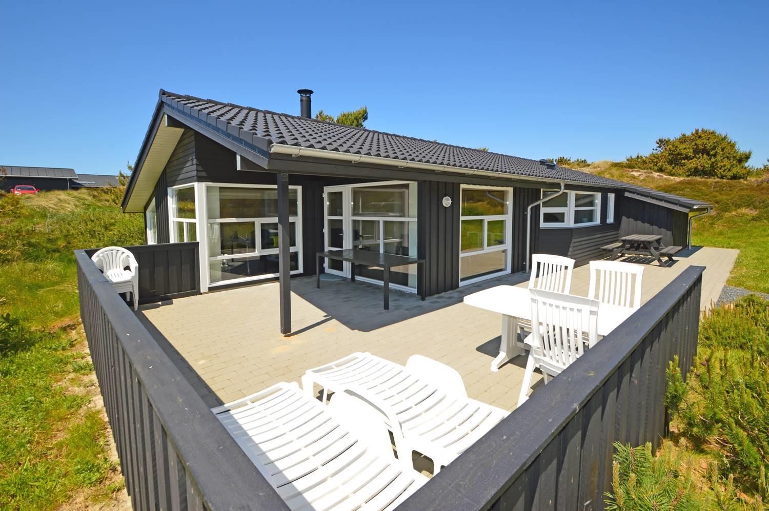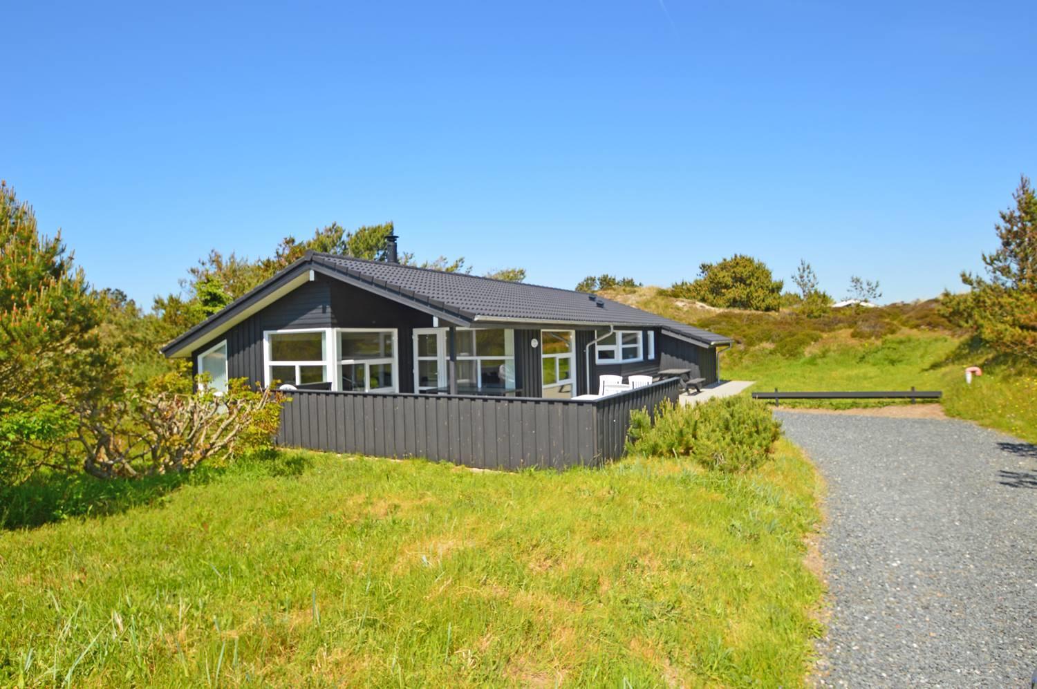 På en skøn, ugeneret og bevokset klitgrund ligger dette pragtfulde feriehus, hvor der er lagt vægt på personlighed. Der er to flotte badeværelser med bruser, det ene råder over 2 pers spa og sauna. Huset råder over 3 gode værelser. Veludstyret køkken som ligger i åben forbindelse med stuen hvorfra der er er direkte adgang til husets terrasser. Et super lækkert hus hvor rammerne er til stede for en rigtig god ferie - hele året.