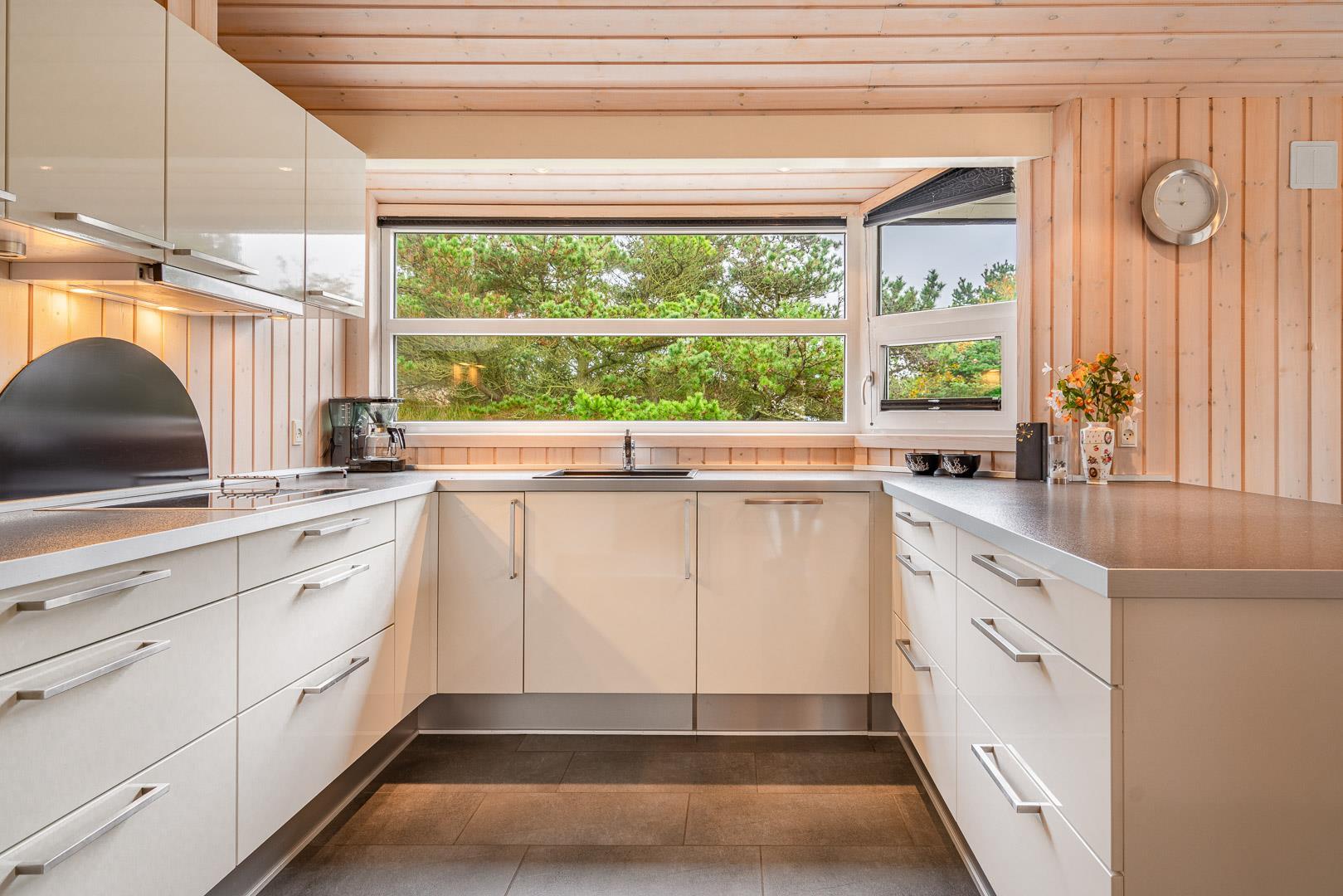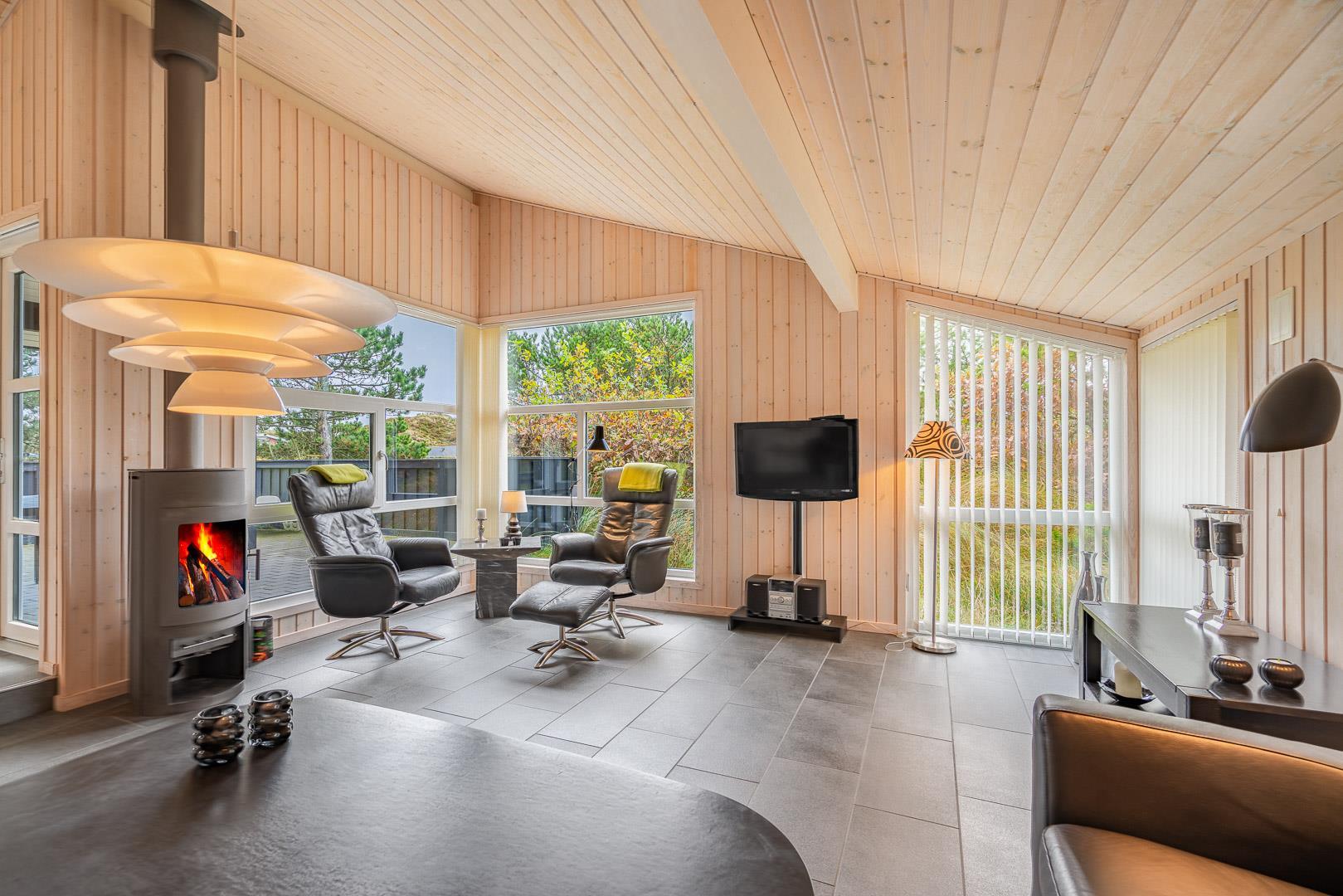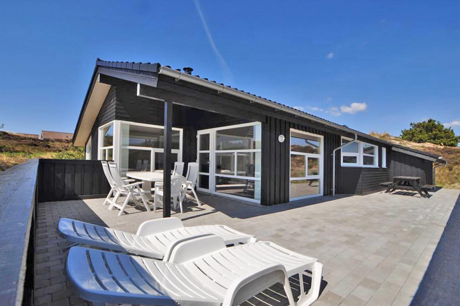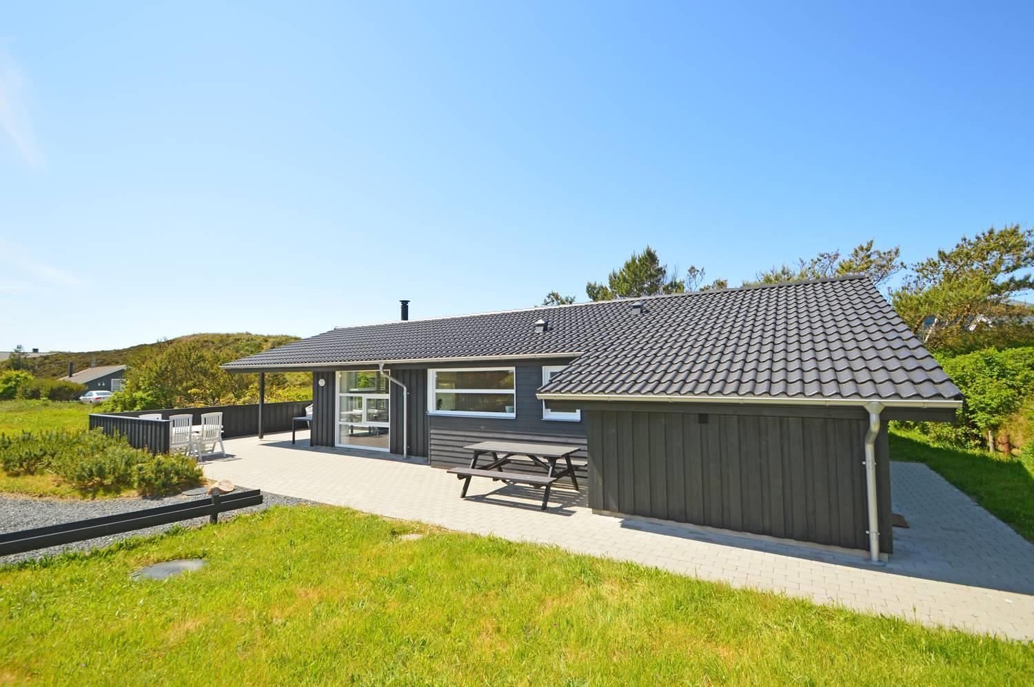 På en skøn, ugeneret og bevokset klitgrund ligger dette pragtfulde feriehus, hvor der er lagt vægt på personlighed. Der er to flotte badeværelser med bruser, det ene råder over 2 pers spa og sauna. Huset råder over 3 gode værelser. Veludstyret køkken som ligger i åben forbindelse med stuen hvorfra der er er direkte adgang til husets terrasser. Et super lækkert hus hvor rammerne er til stede for en rigtig god ferie - hele året.