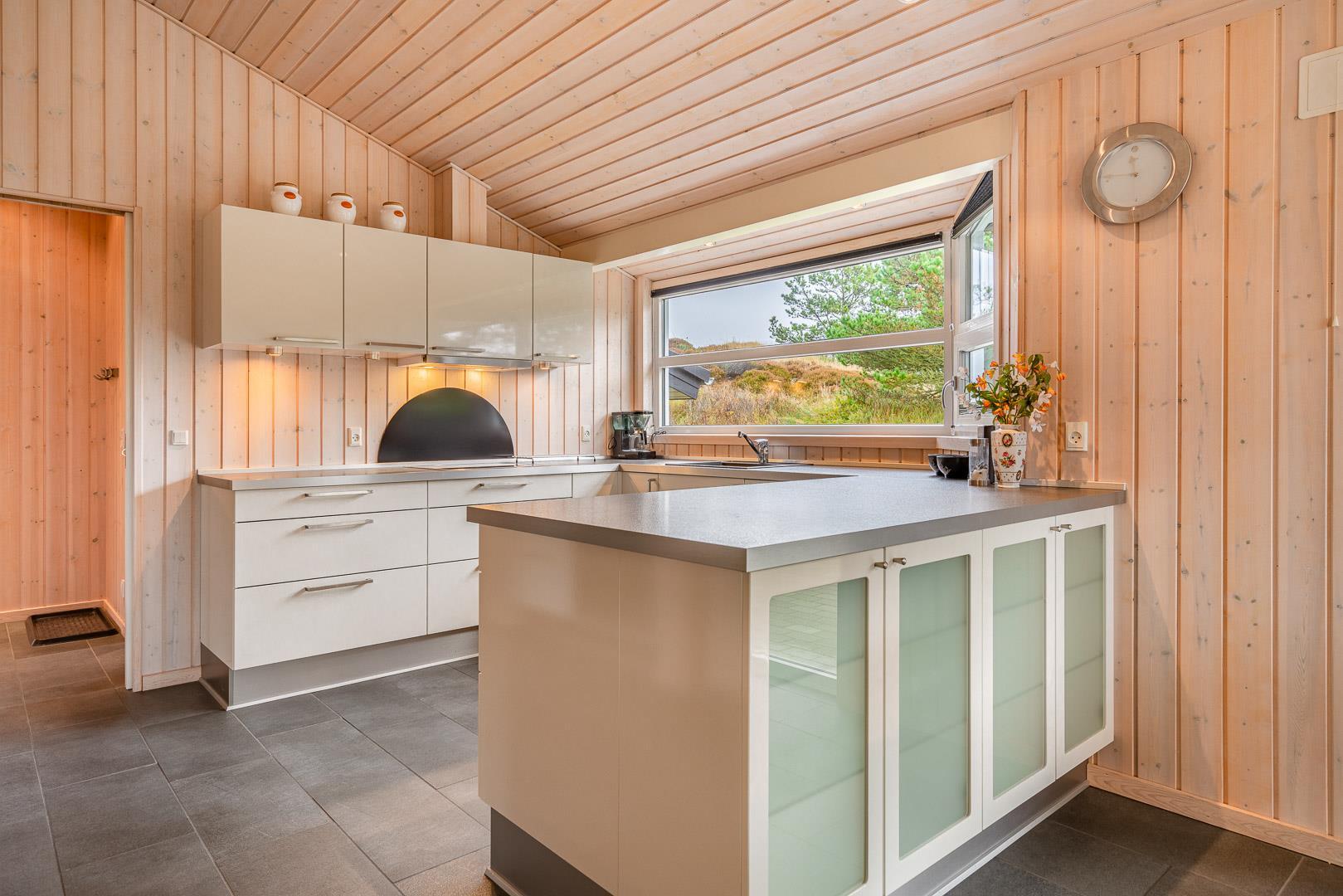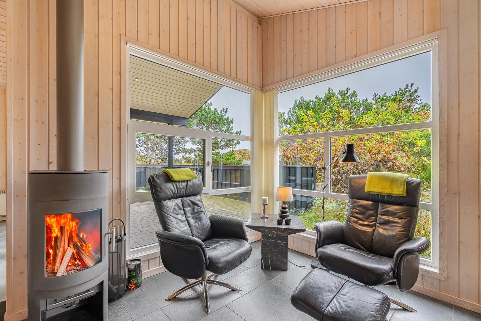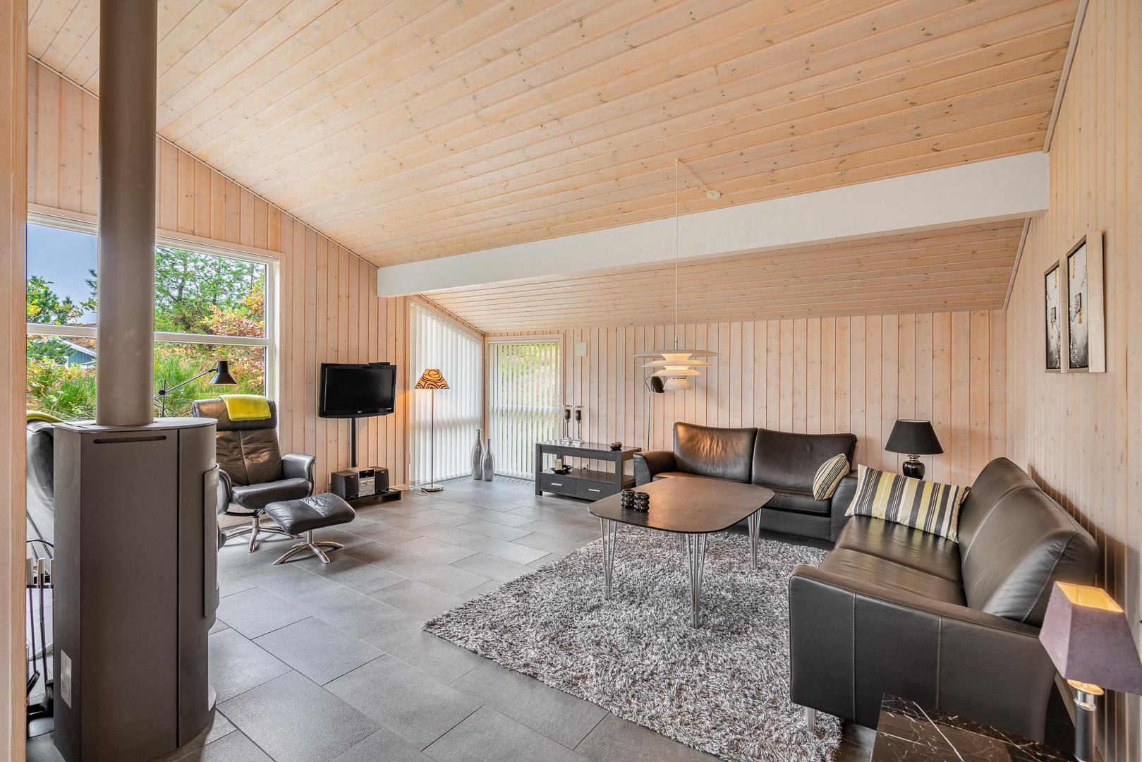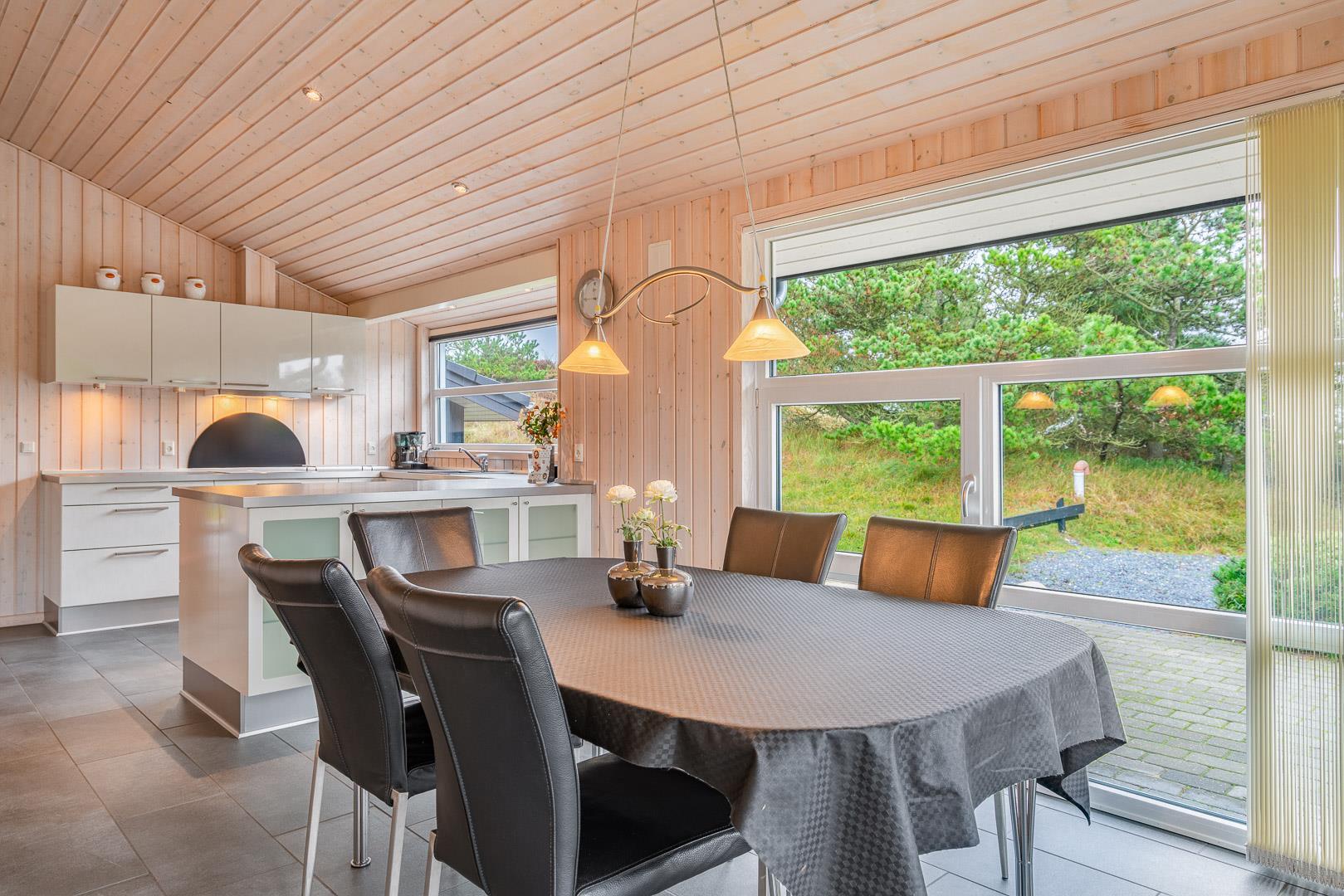 På en skøn, ugeneret og bevokset klitgrund ligger dette pragtfulde feriehus, hvor der er lagt vægt på personlighed. Der er to flotte badeværelser med bruser, det ene råder over 2 pers spa og sauna. Huset råder over 3 gode værelser. Veludstyret køkken som ligger i åben forbindelse med stuen hvorfra der er er direkte adgang til husets terrasser. Et super lækkert hus hvor rammerne er til stede for en rigtig god ferie - hele året.