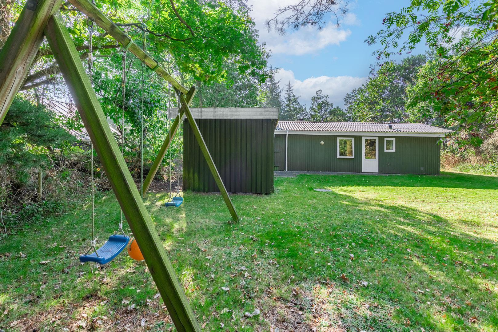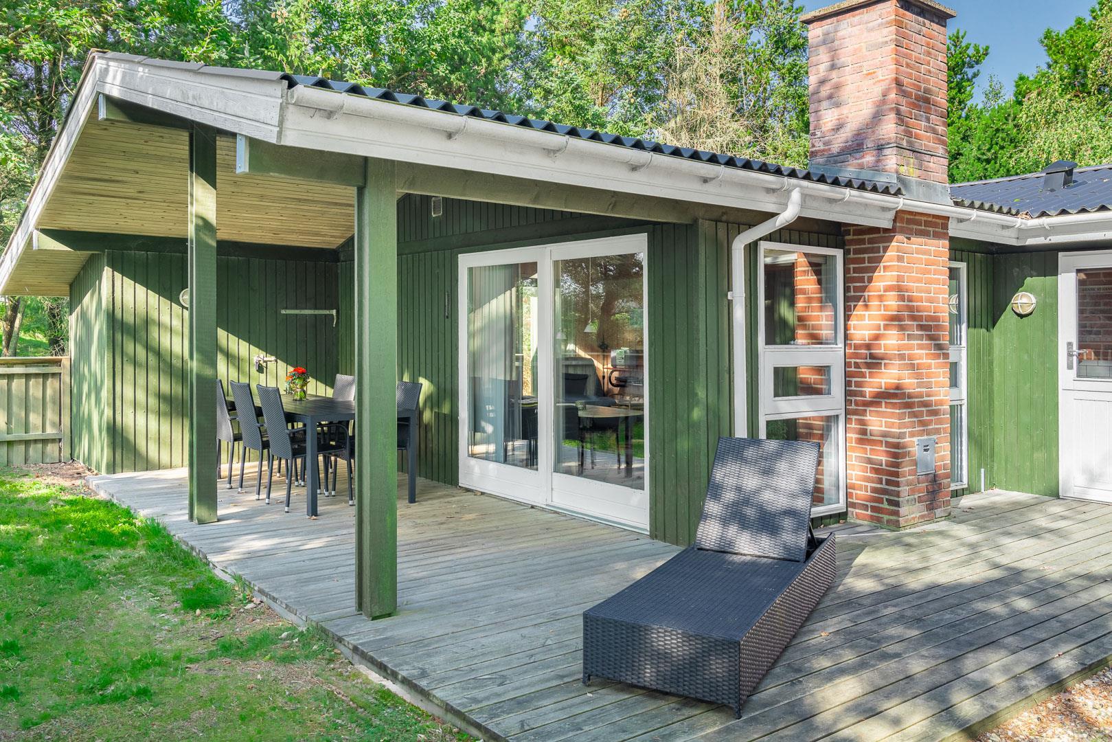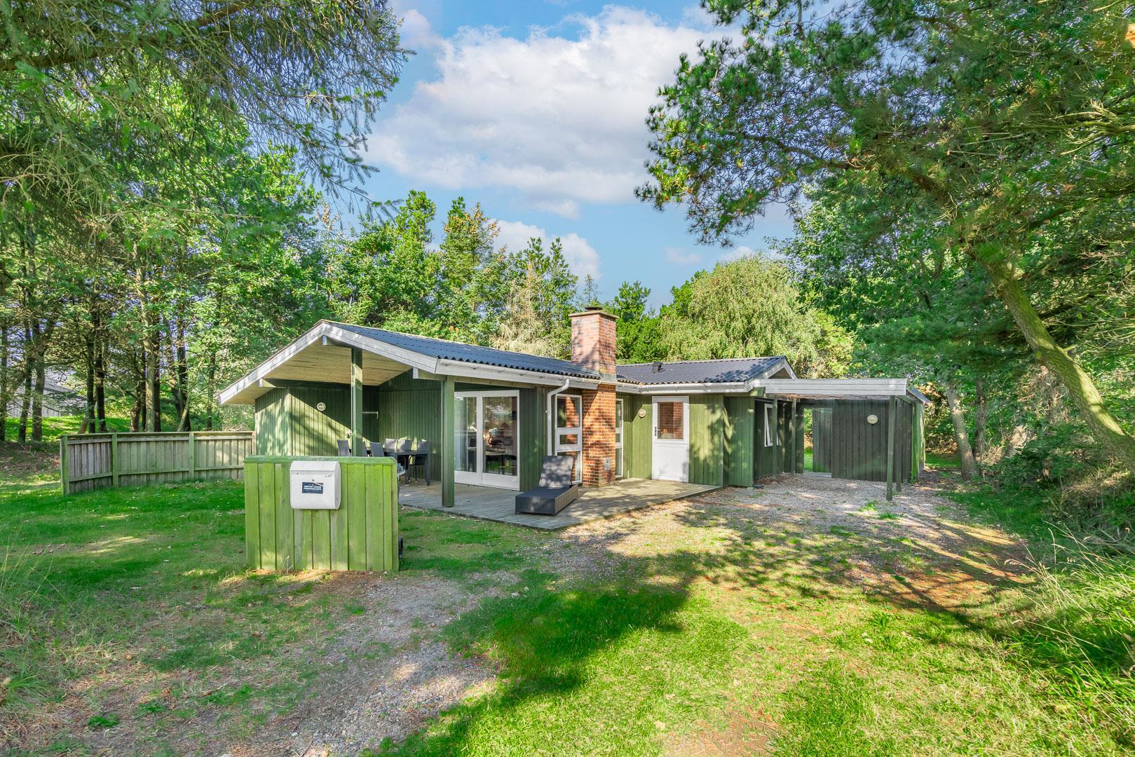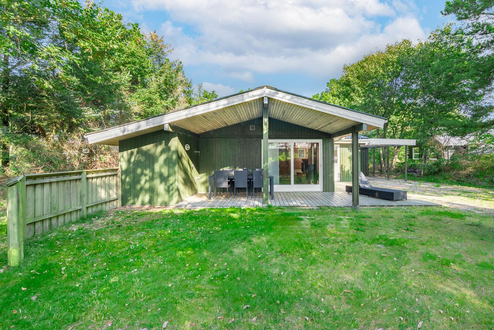 Feriehus beliggende på flot, bevokset naturgrund i rolige omgivelser. Huset er indrettet med pæne og gode møbler. Fra stuen er der udgang til træterrasse. Bag huset er der græs-/naturgrund, hvor børnene rigtig kan boltre sig. Klinkegulv i køkken og stue.