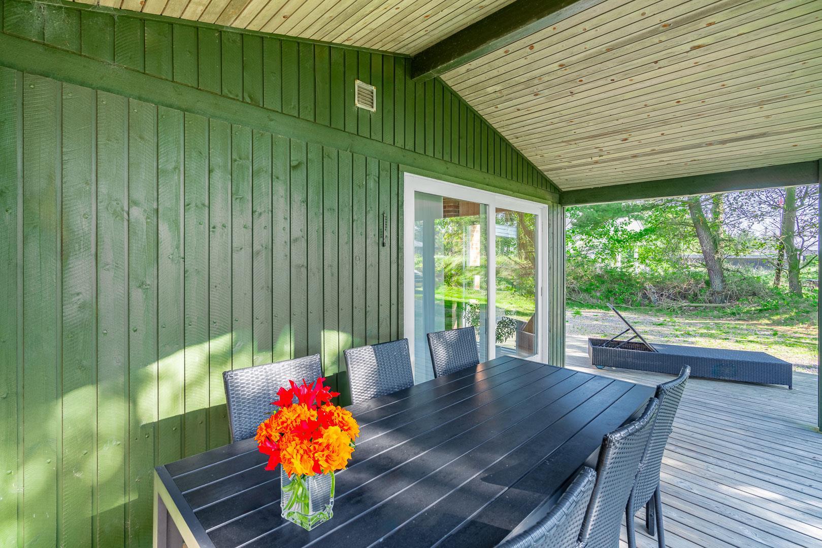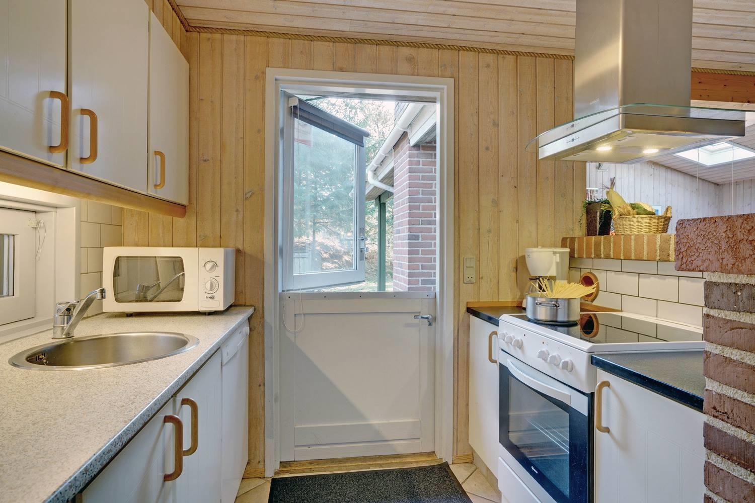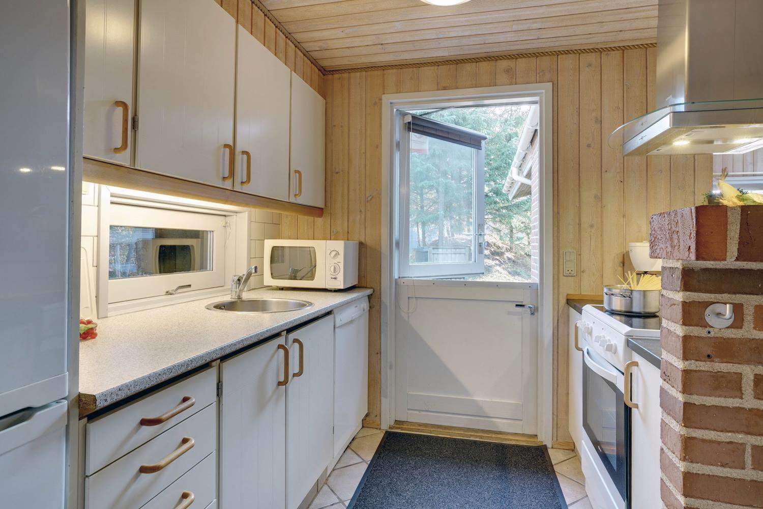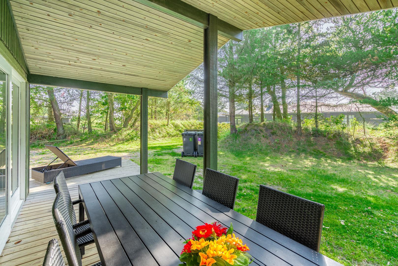 Feriehus beliggende på flot, bevokset naturgrund i rolige omgivelser. Huset er indrettet med pæne og gode møbler. Fra stuen er der udgang til træterrasse. Bag huset er der græs-/naturgrund, hvor børnene rigtig kan boltre sig. Klinkegulv i køkken og stue.