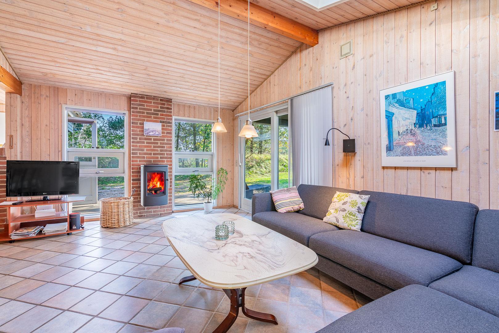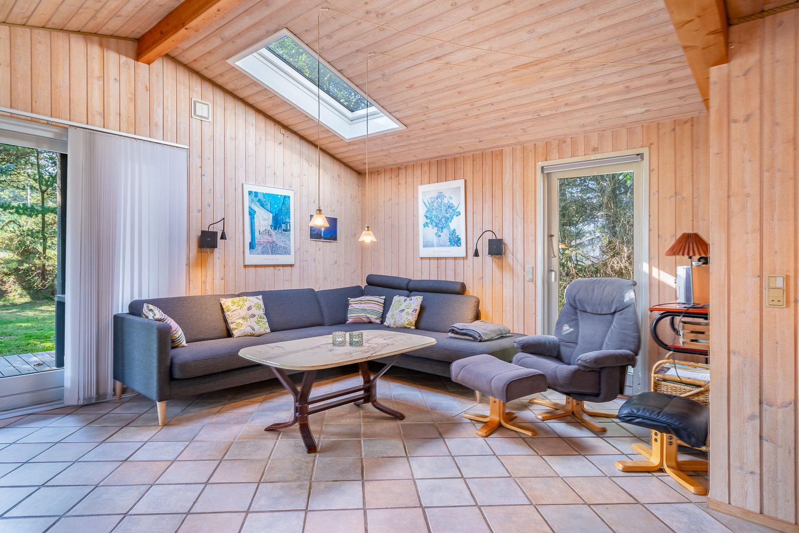 Hyggeligt feriehus i Henne Strand med sauna, brændeovn og stor naturgrund tæt på strand og indkøb.