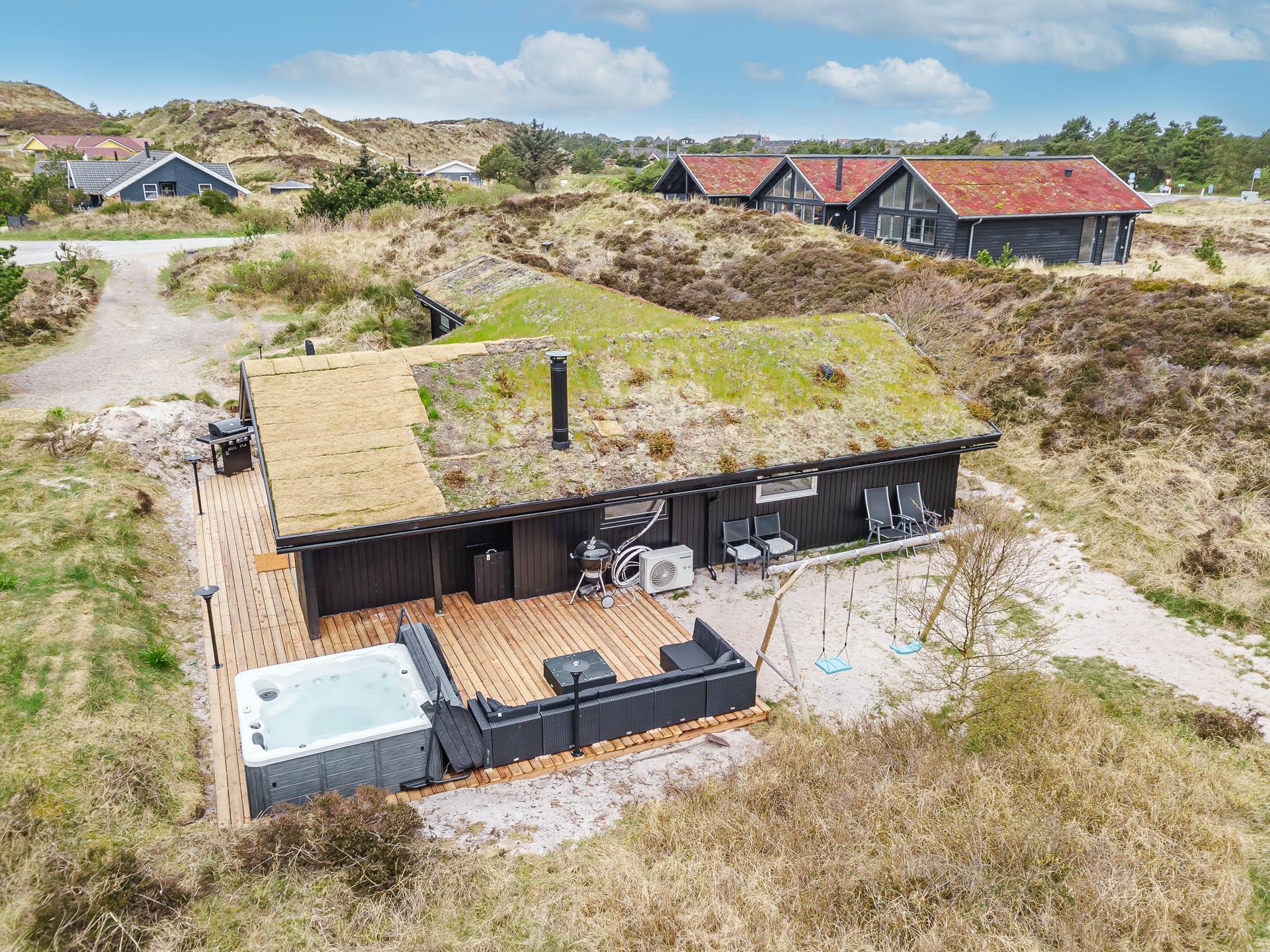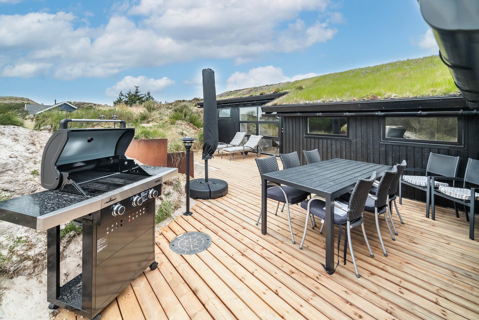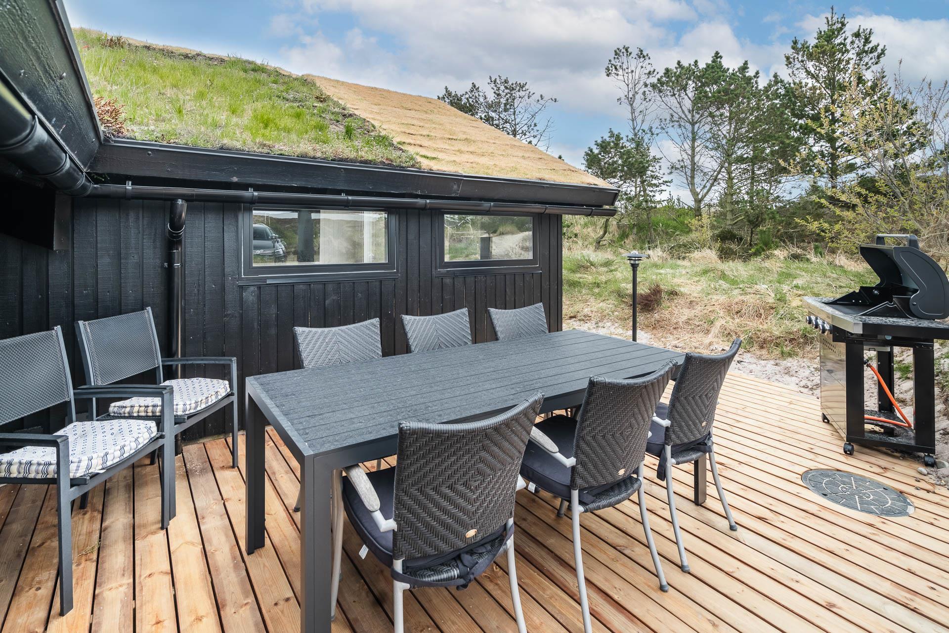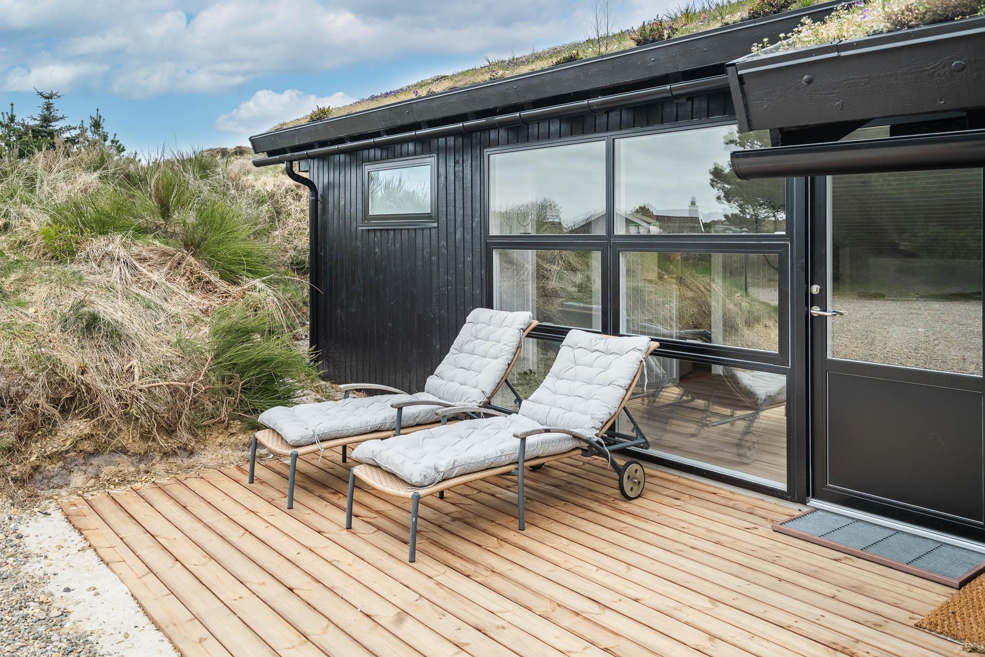 Fra stuen er der udgang til stor ugeneret træterrasse med Lounge havemøbler, hvor roen og freden kan nydes i fulde drag, eller man kan hoppe en tur i udespaen. Den hyggelige ferieby Henne Strand ligger i gåafstand fra huset, her kan I nyde de gode cafeer, restauranter eller handle i byen butikker.