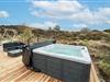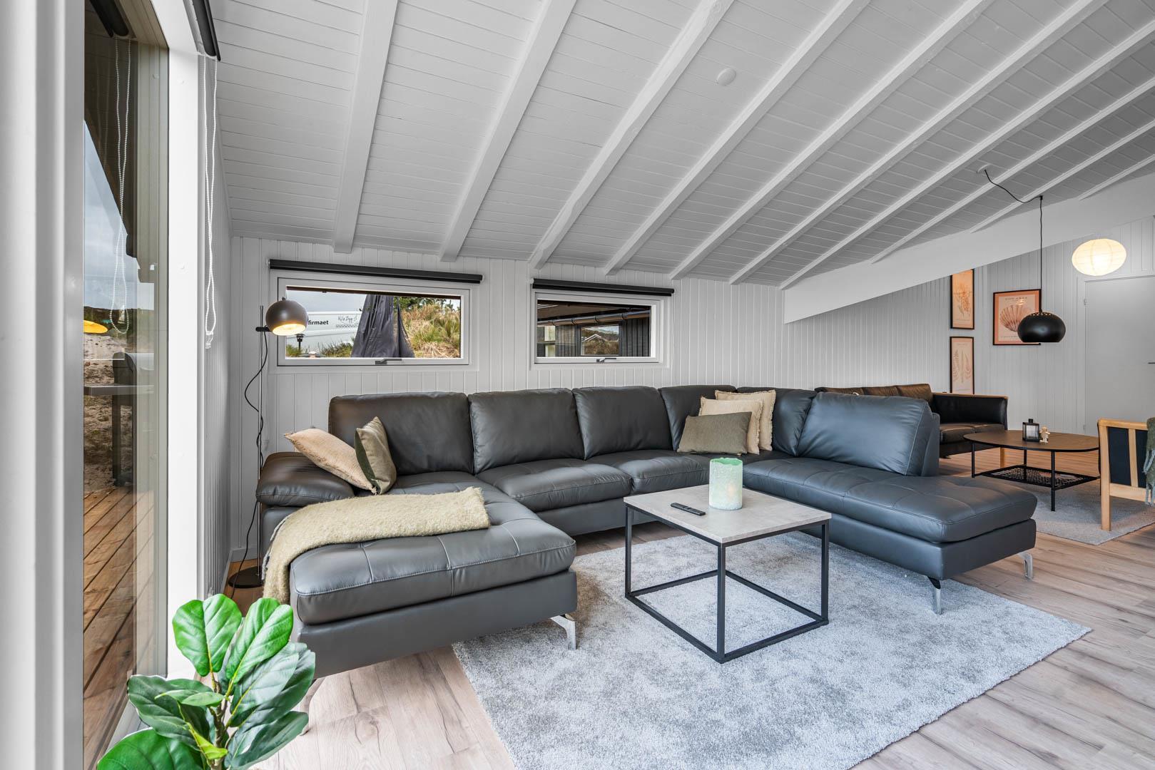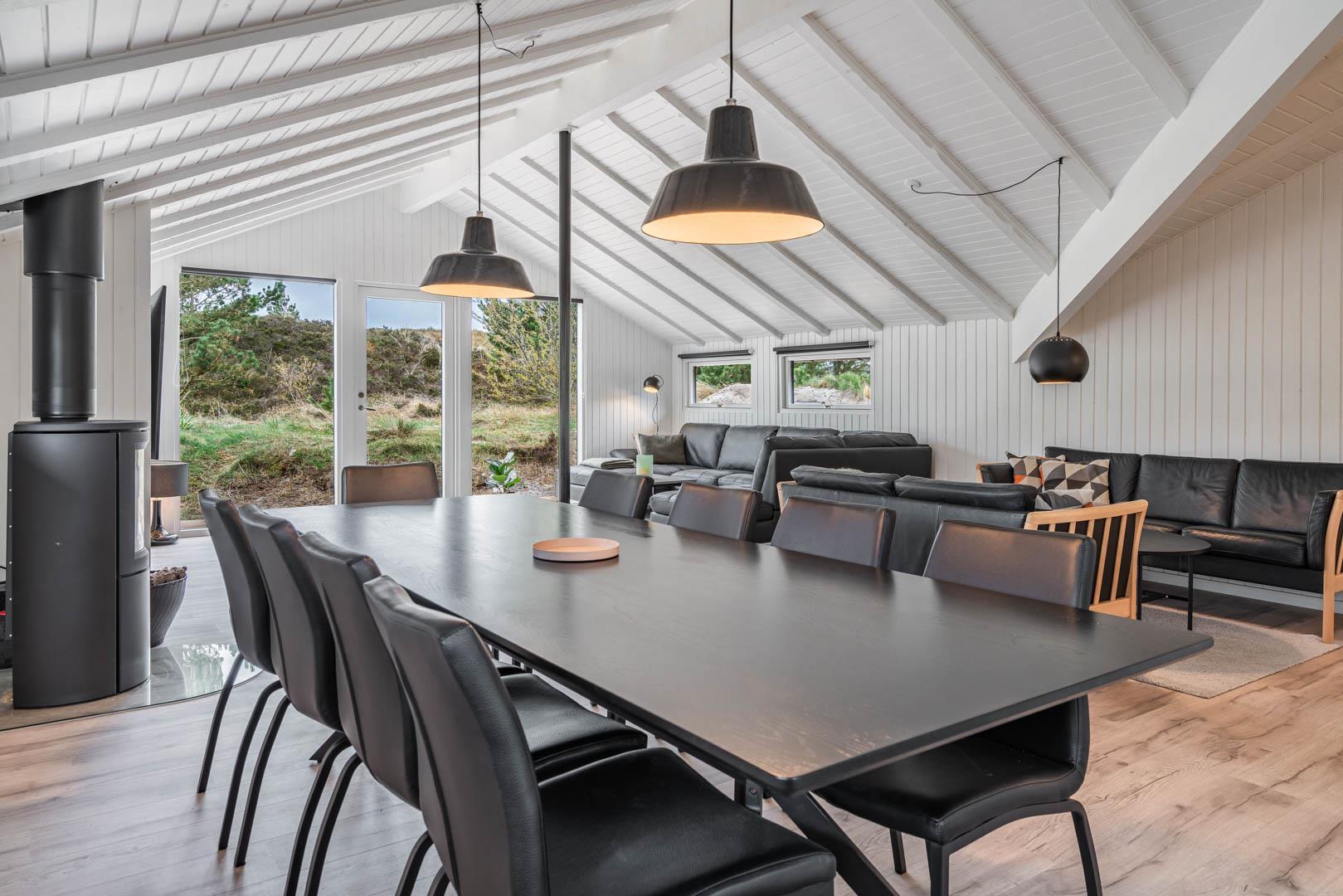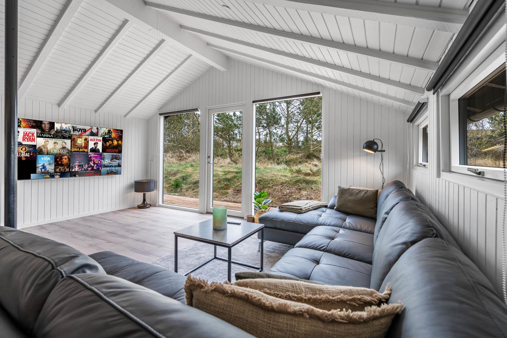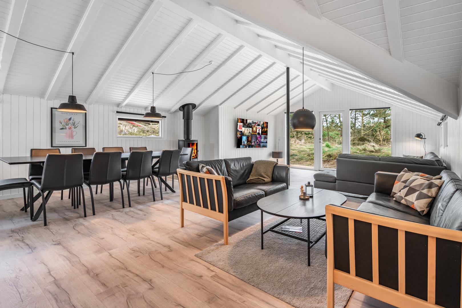 Fra stuen er der udgang til stor ugeneret træterrasse med Lounge havemøbler, hvor roen og freden kan nydes i fulde drag, eller man kan hoppe en tur i udespaen. Den hyggelige ferieby Henne Strand ligger i gåafstand fra huset, her kan I nyde de gode cafeer, restauranter eller handle i byen butikker.