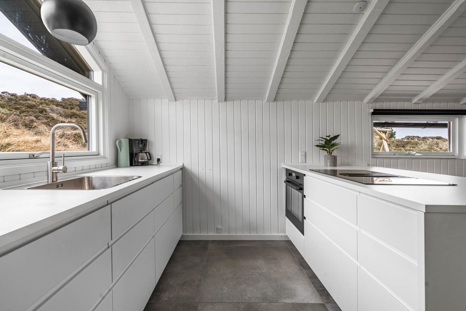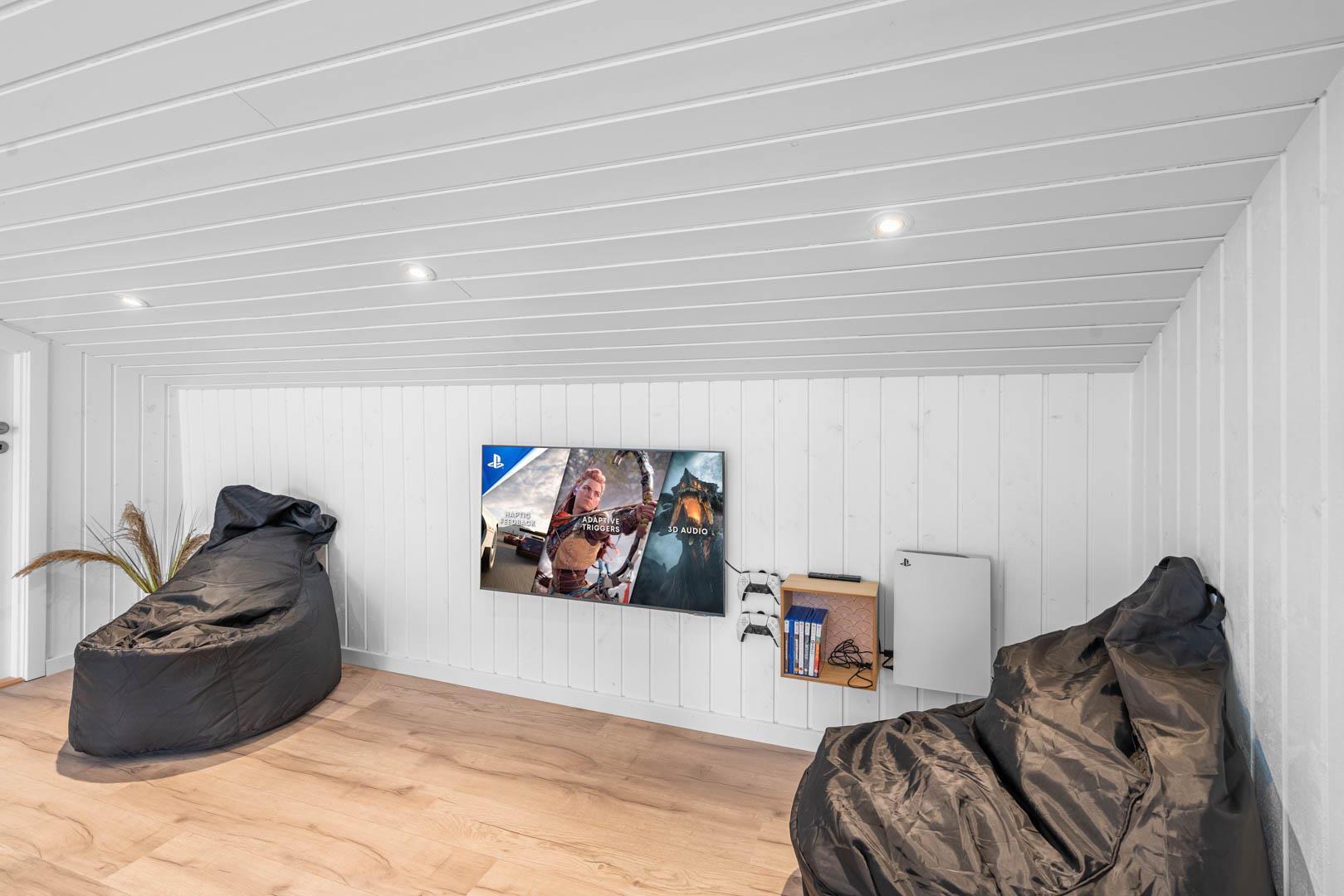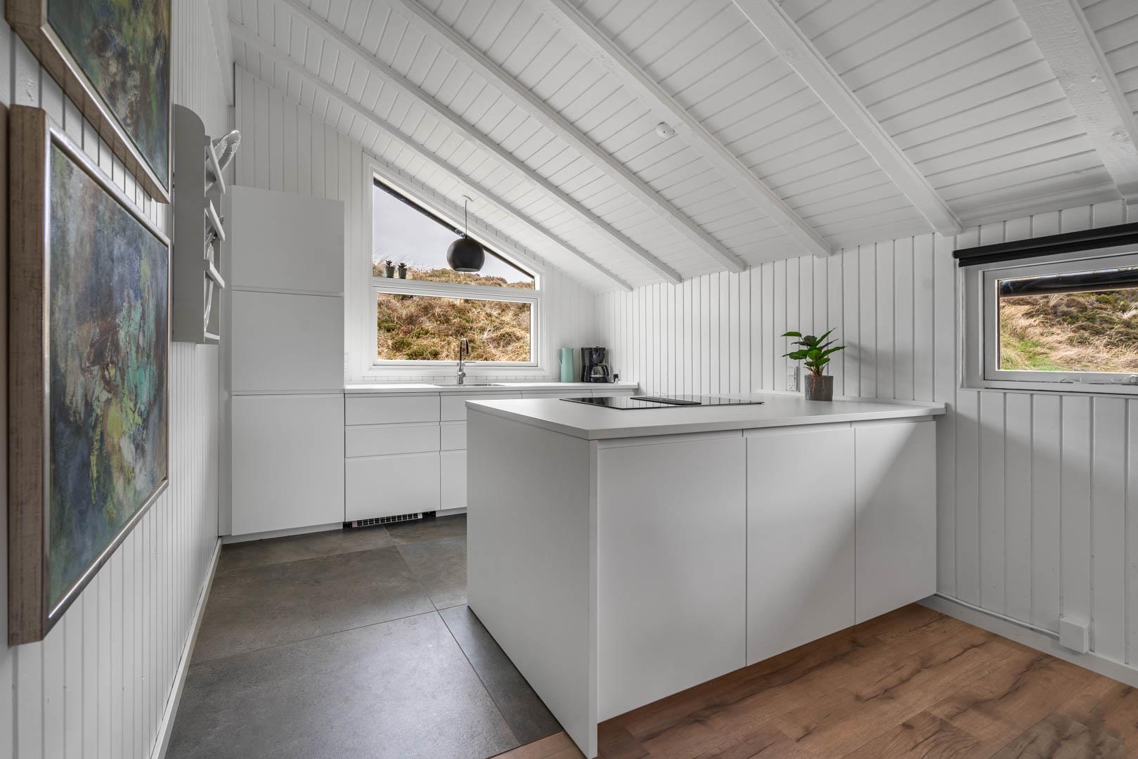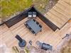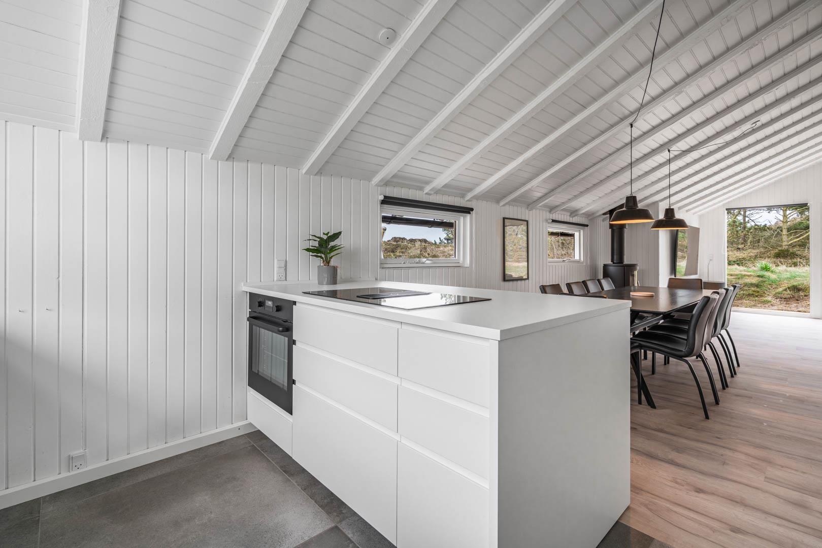 Fra stuen er der udgang til stor ugeneret træterrasse med Lounge havemøbler, hvor roen og freden kan nydes i fulde drag, eller man kan hoppe en tur i udespaen. Den hyggelige ferieby Henne Strand ligger i gåafstand fra huset, her kan I nyde de gode cafeer, restauranter eller handle i byen butikker.