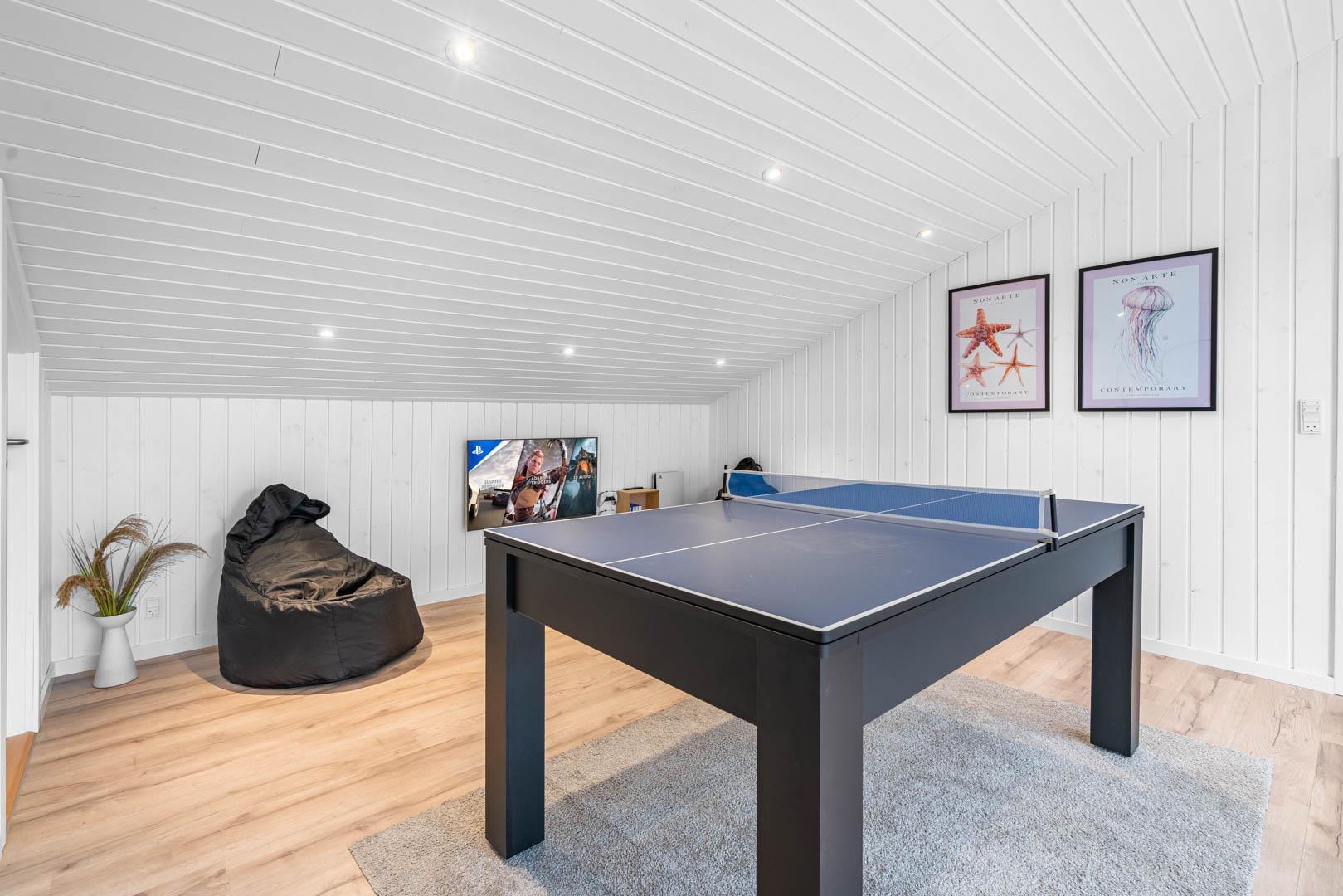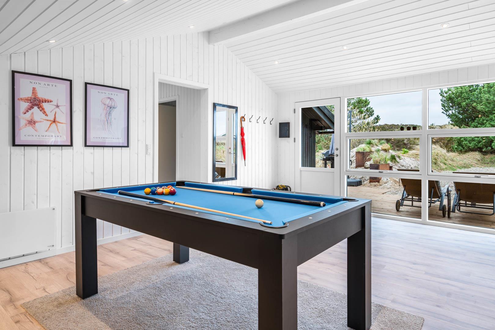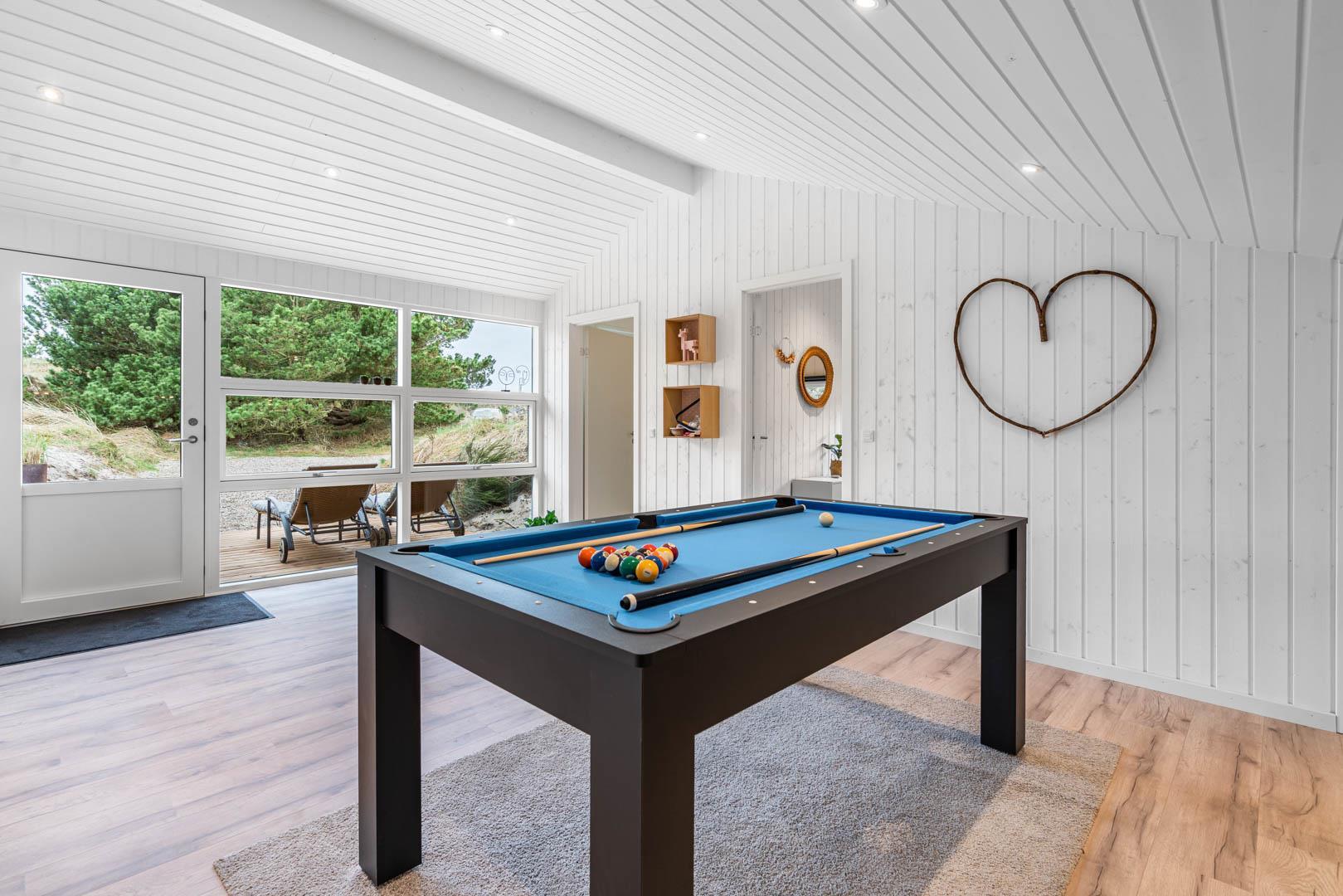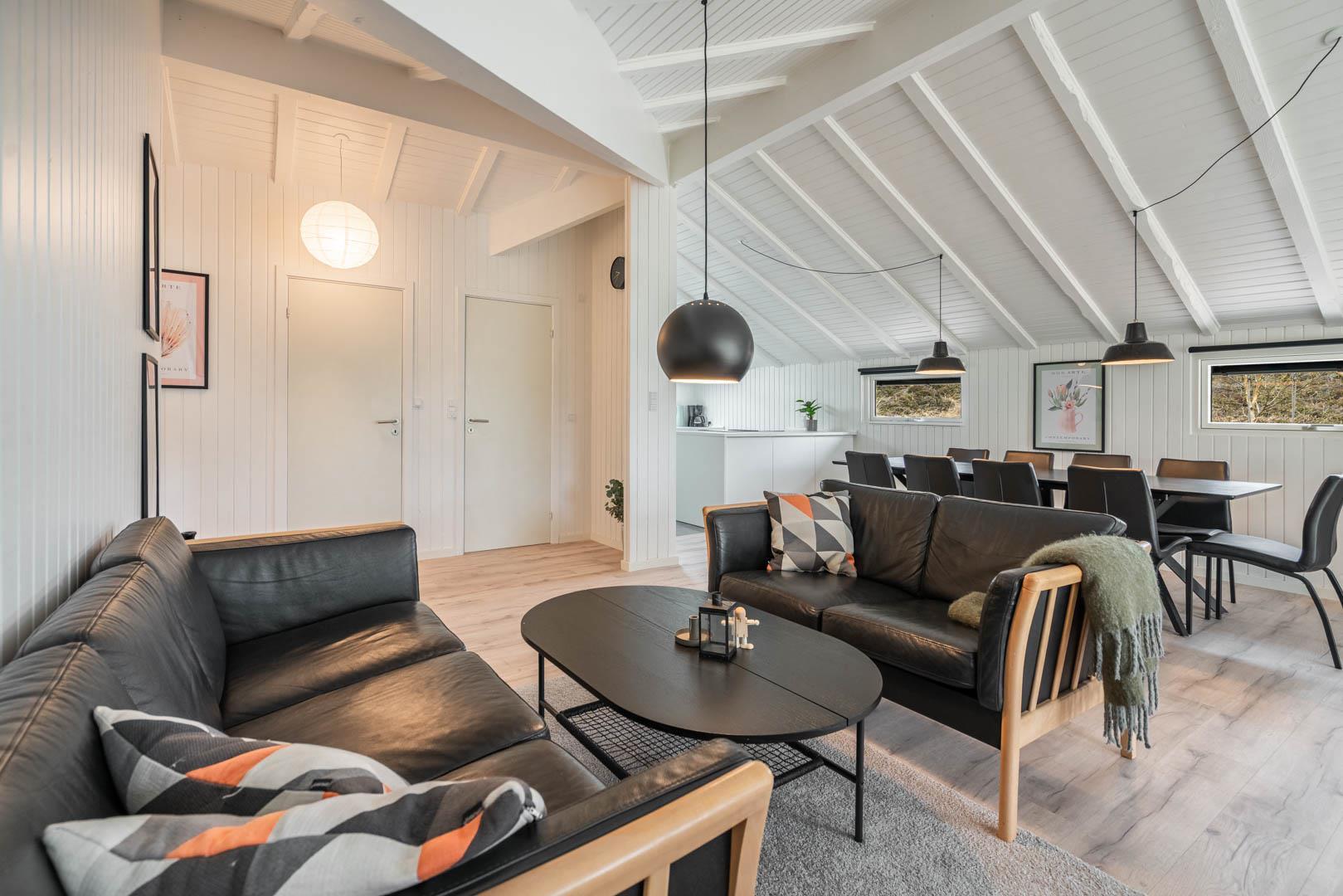 På en skøn kuperet naturgrund og tilbagetrukket i forhold til vejen ligger dette stilfulde og total renoverede feriehus med plads til 8 personer og med 4 soverum. Der er stor aktivitetsafdeling med poolbord,dart, bordtennis og Playstation 5 med tilhørende spil. Moderne indretning med lyse farver og komfortable møbler skaber en hyggelig sommerhusstemning, hvor man i vintertiden også kan slappe af foran huset brændeovn. Der er også en energisparende varmepumpe i huset. Huset er indrettet med 2 gode badeværelser med bruser, samt 4 soverum.