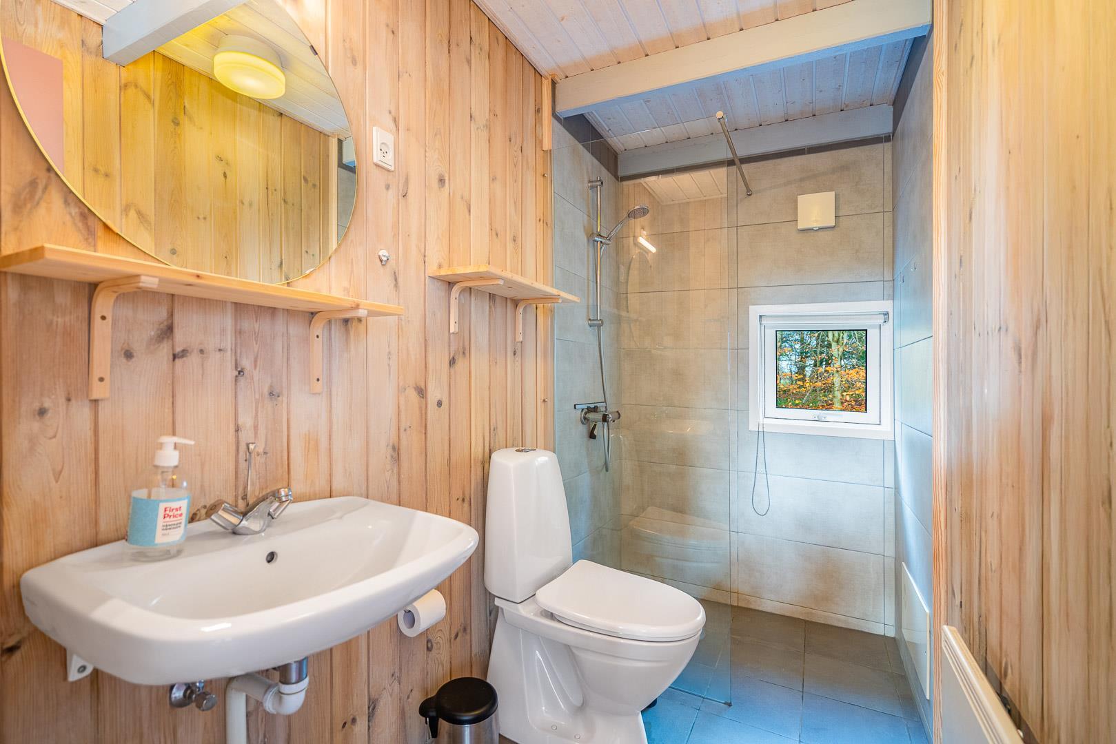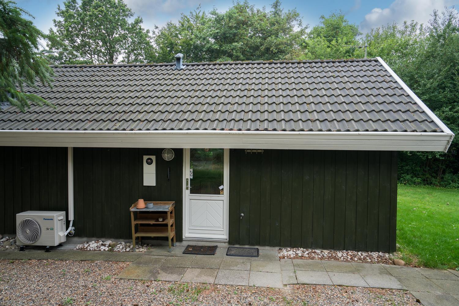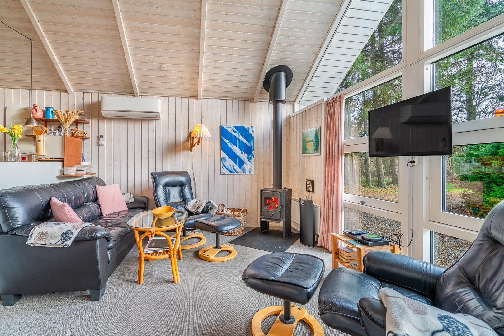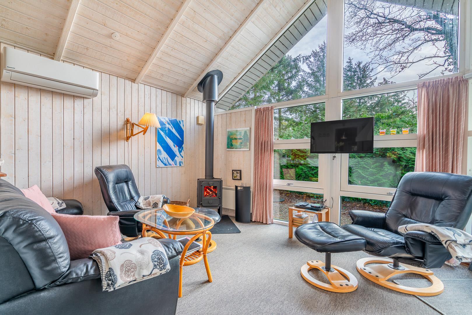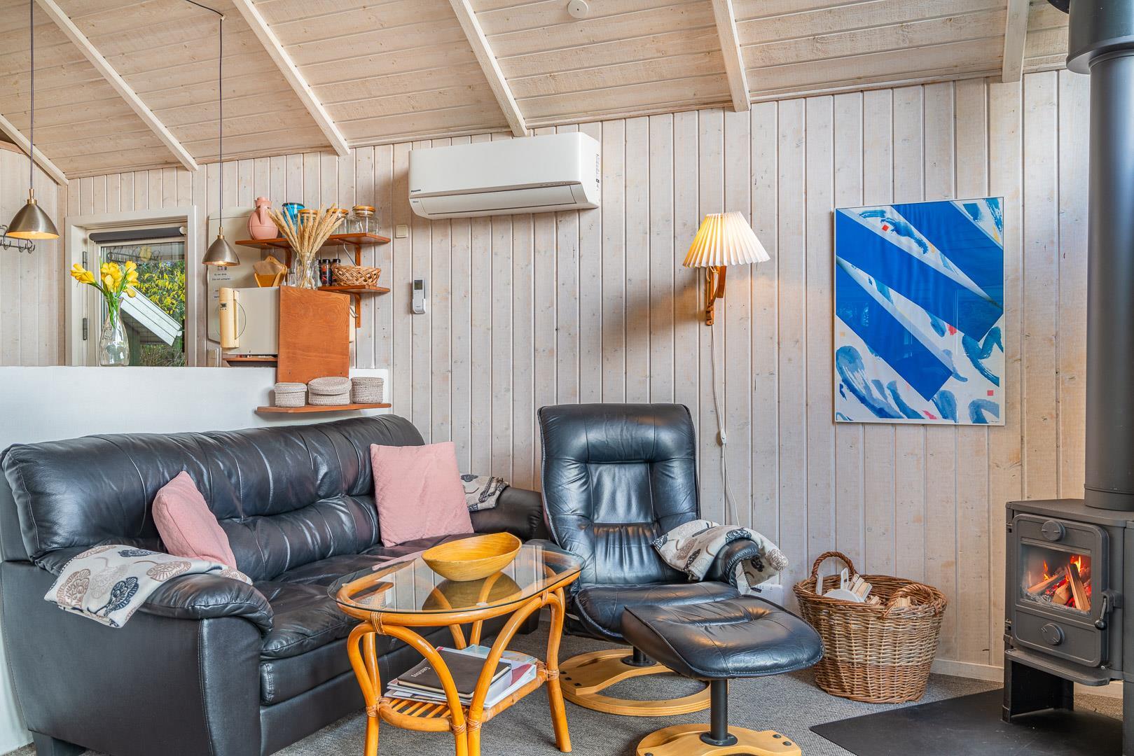 Takket være varmepumpen kan sommerhuset opvarmes effektivt og miljøvenligt, og i de kolde måneder giver brændeovnen ekstra varme og stemning. Badeværelset har gulvvarme, så du starter dagen med varme fødder og ekstra komfort.