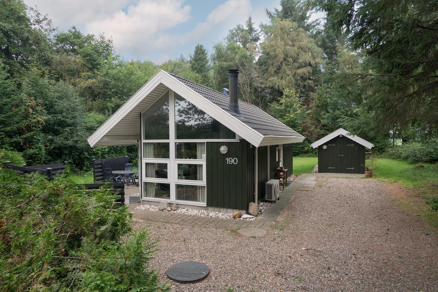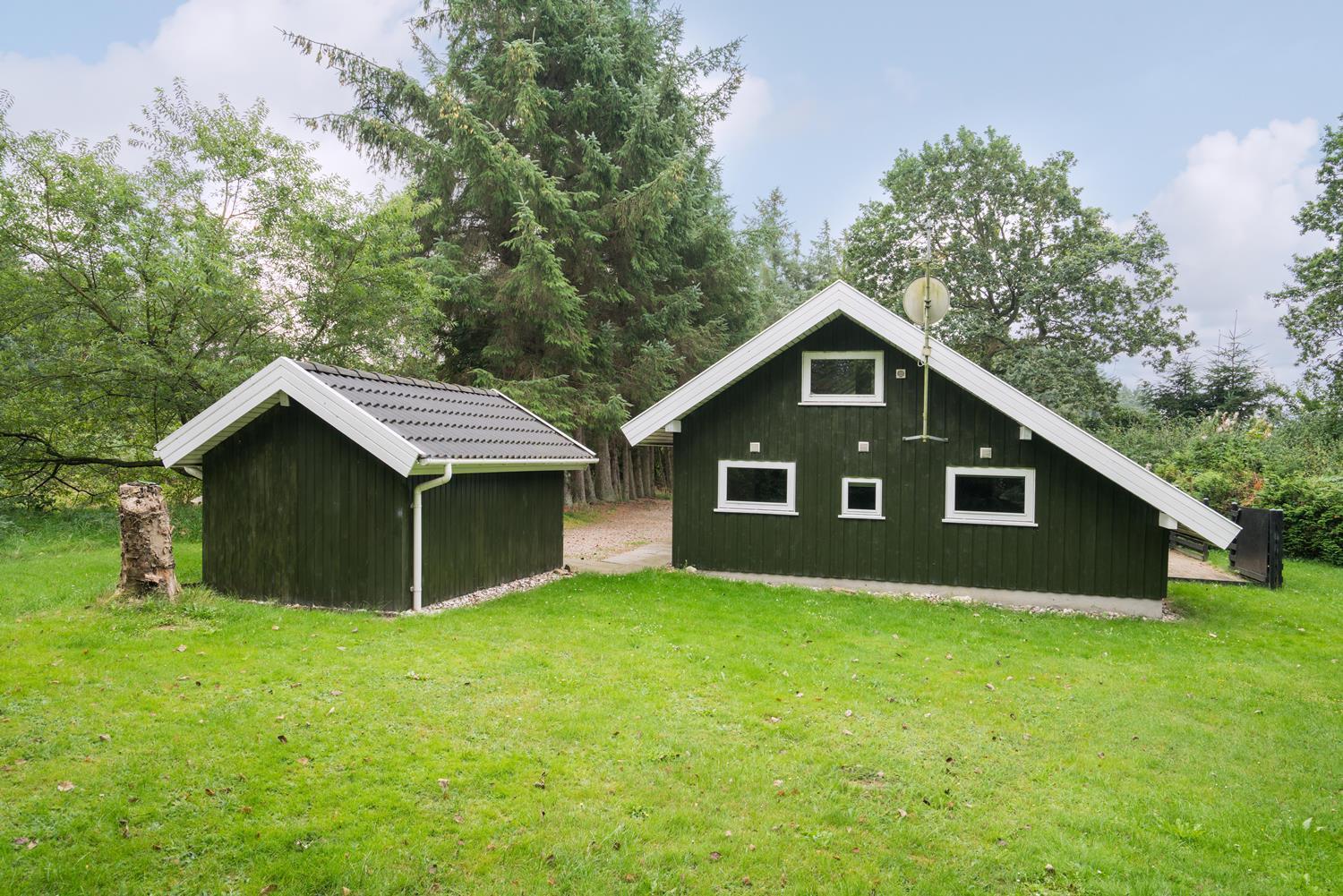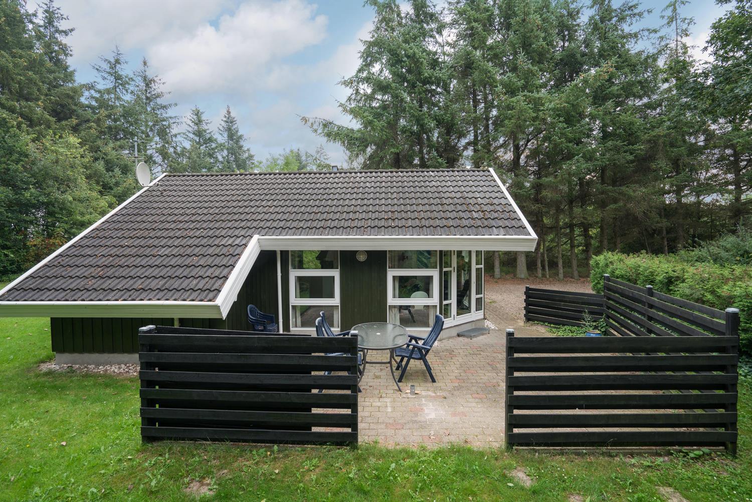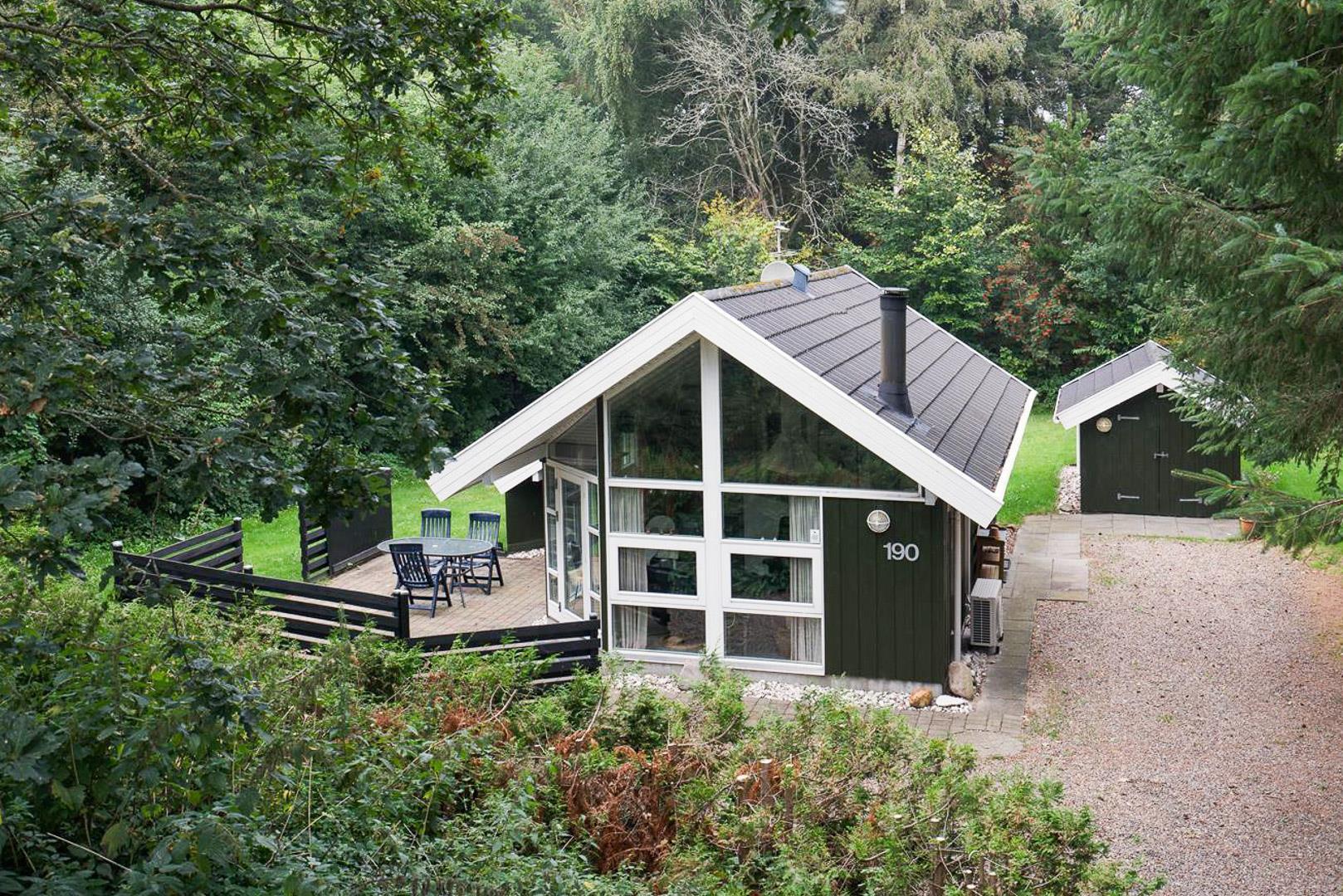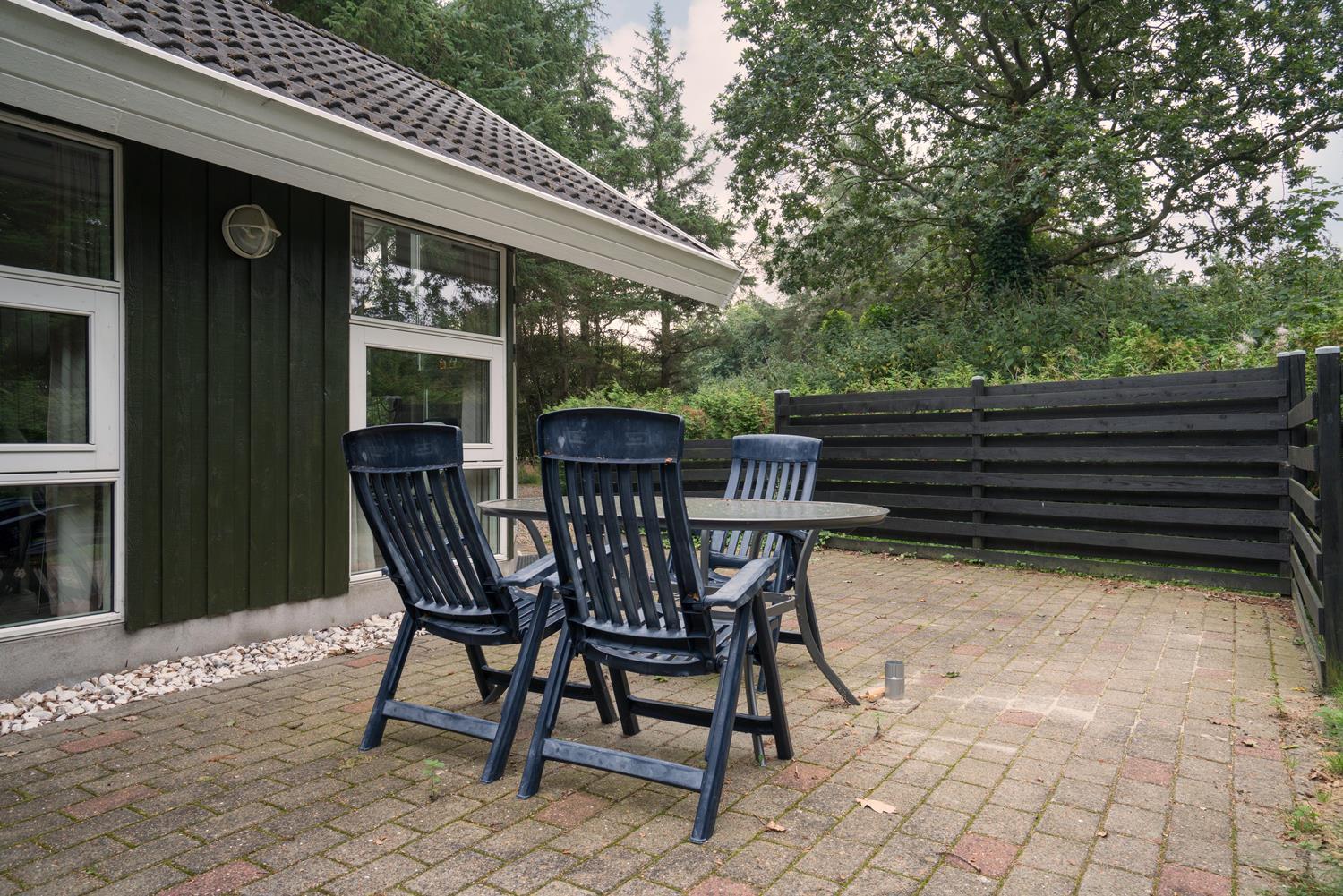 Udenfor finder I en dejlig naturgrund med god plads til leg, solbadning og afslapning. På den delvist overdækkede terrasse kan I nyde morgenkaffen i læ for vinden eller afslutte dagen med et glas vin, mens I lytter til naturens lyde omkring jer.