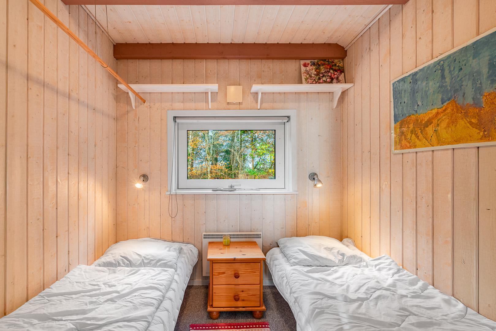 Der er to soveværelser – et med dobbeltseng og et med to enkeltsenge – samt en hyggelig hems, som børnene vil elske. Hemsen egner sig også perfekt som lille læsehjørne eller hyggekrog.
