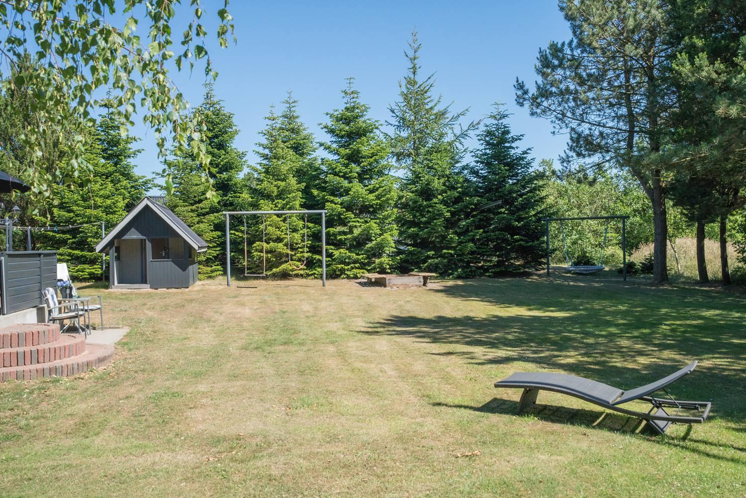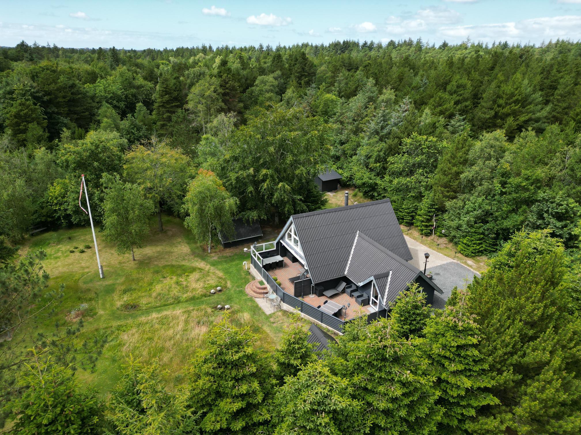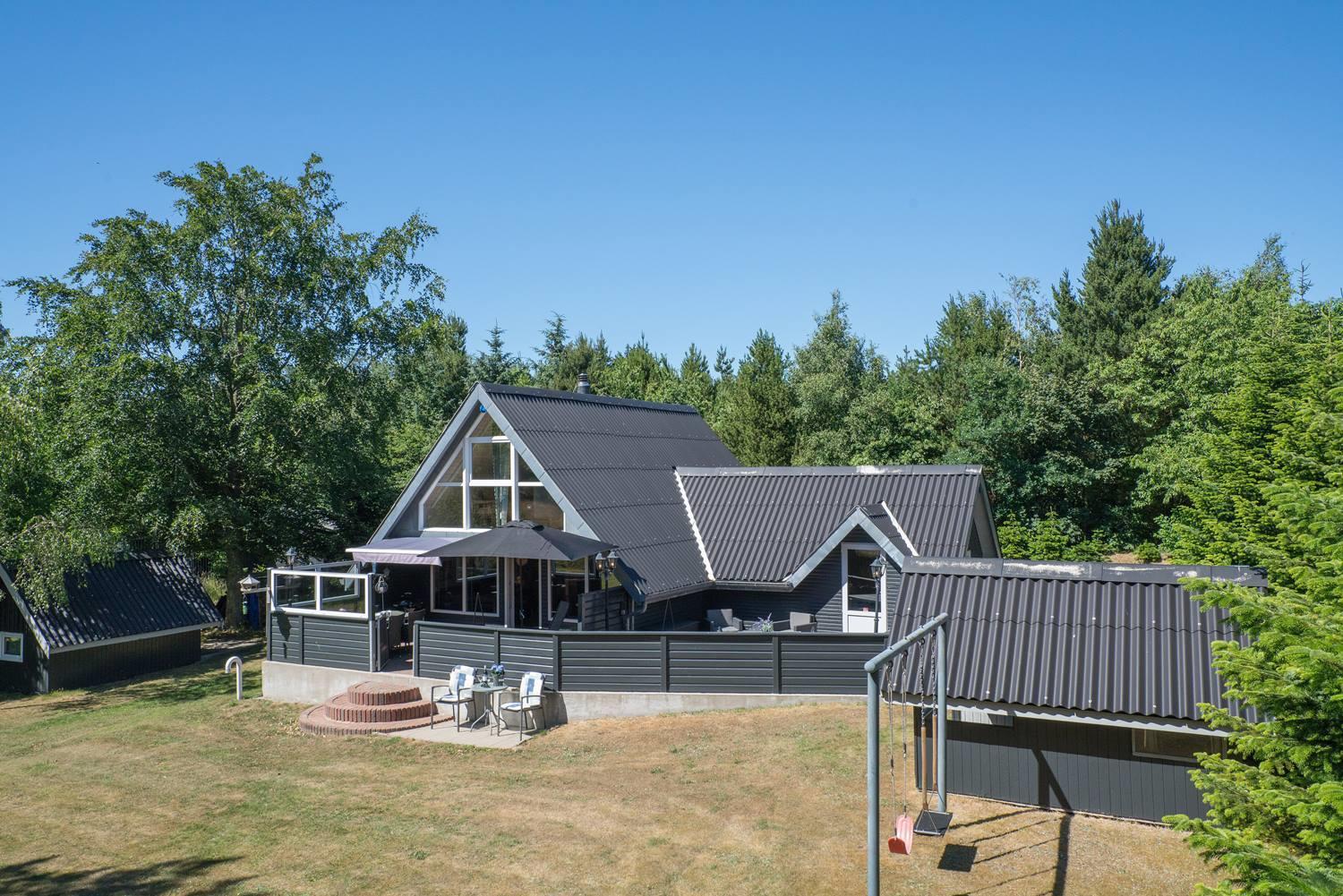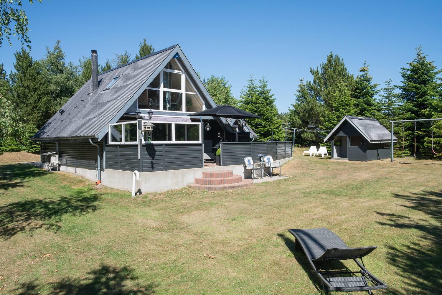 På en skøn sydvendt børnevenlig naturgrund i rolige omgivelser for enden af blind vej tæt ved Blåbjerg Plantage og golfklub, ligger dette velpassede feriehus.