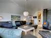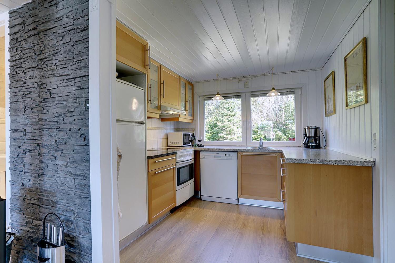 Køkkenet ligger i åben forbindelse med den hyggelig og pænt møblerede stue.