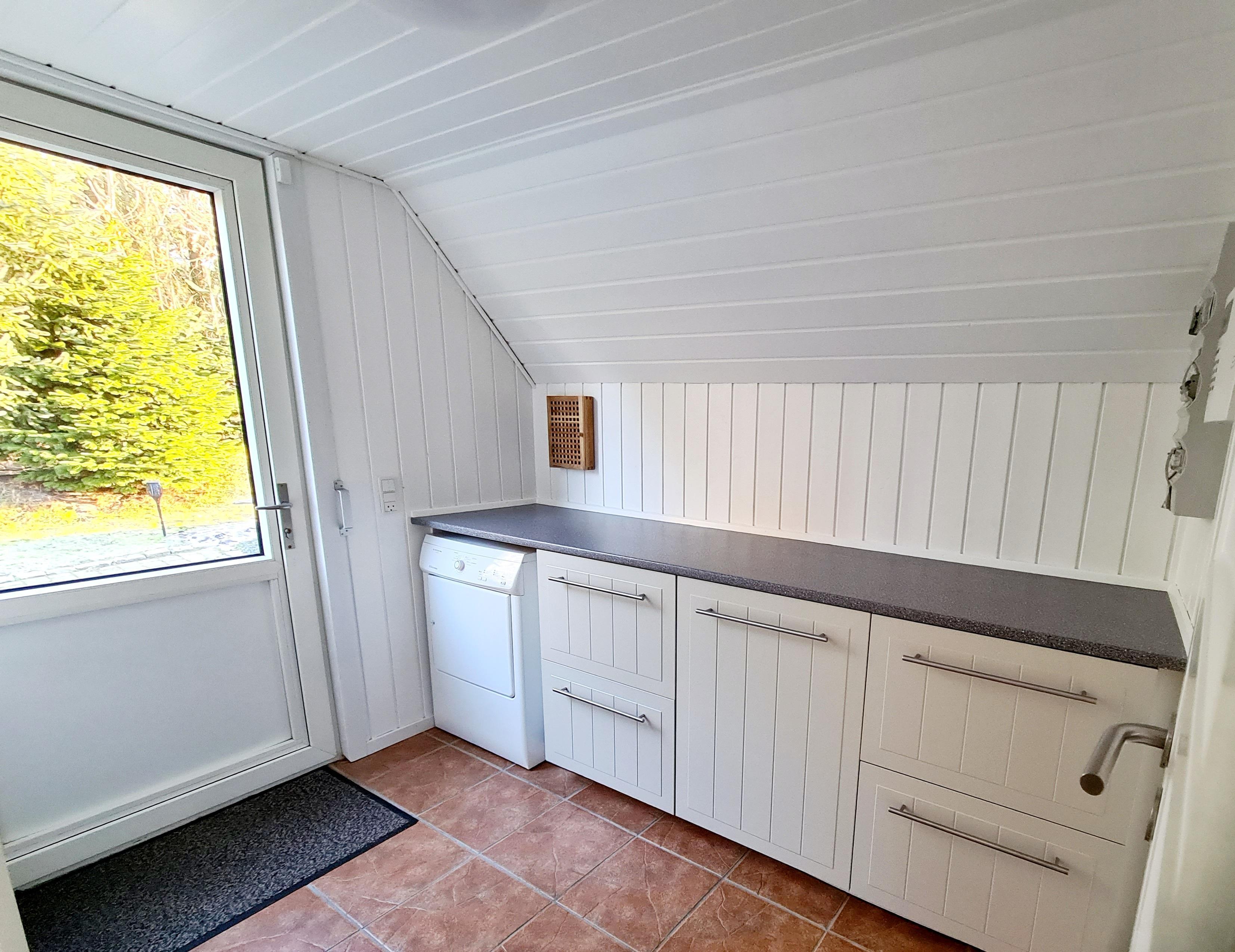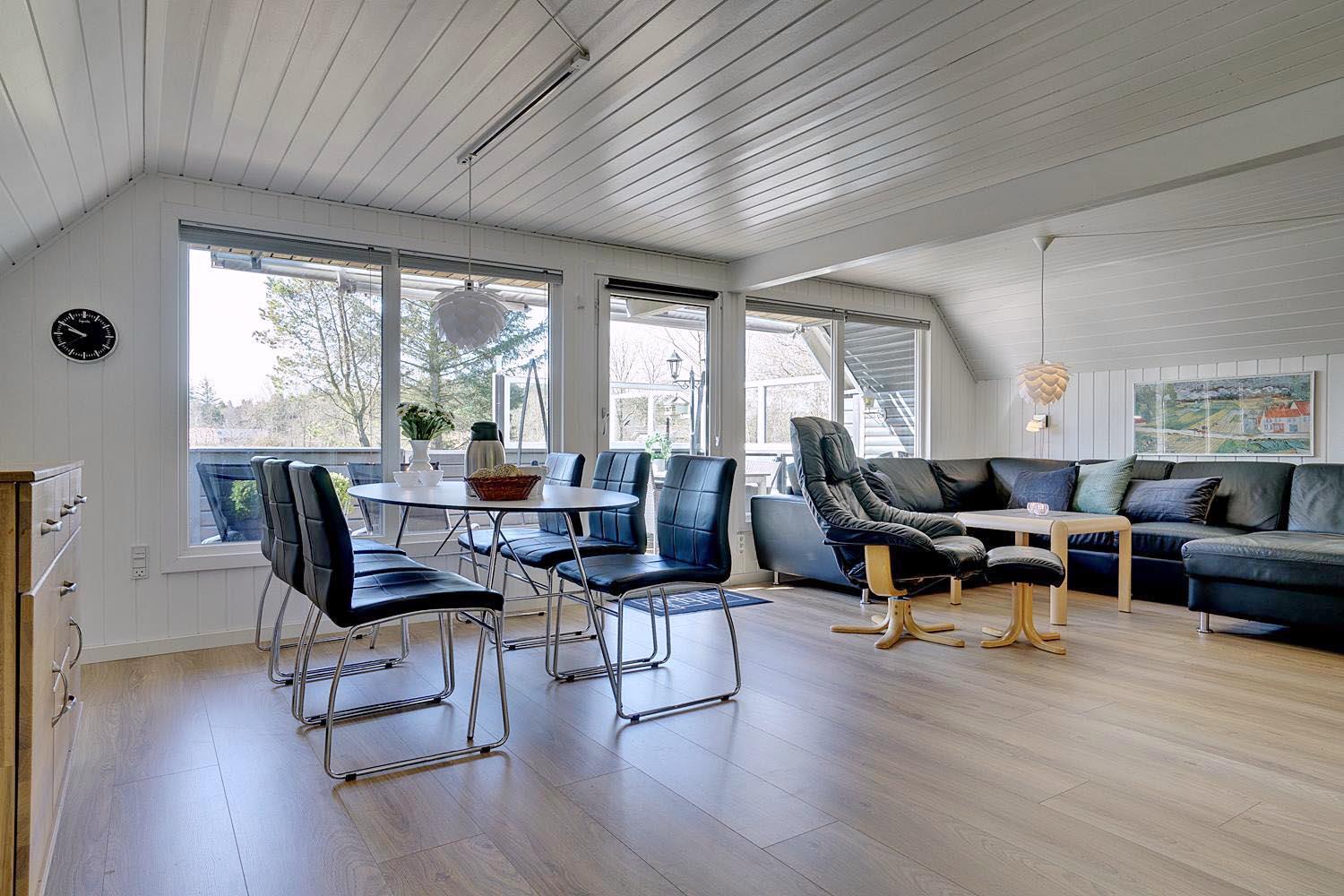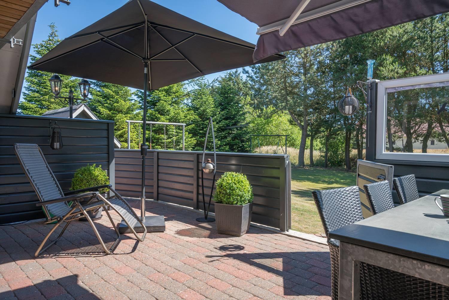 Fra opholdsrummet kommer I ud på den store ugenerte terrasse, der er helt ideel til børnefamilierne og hundeejerne.