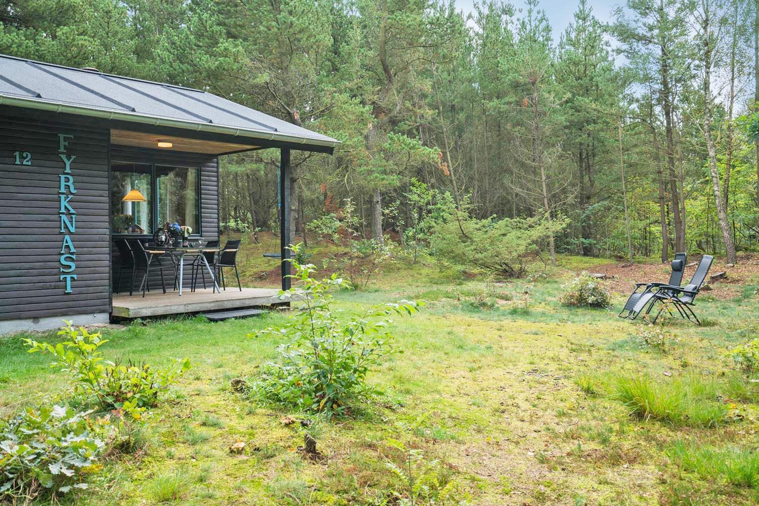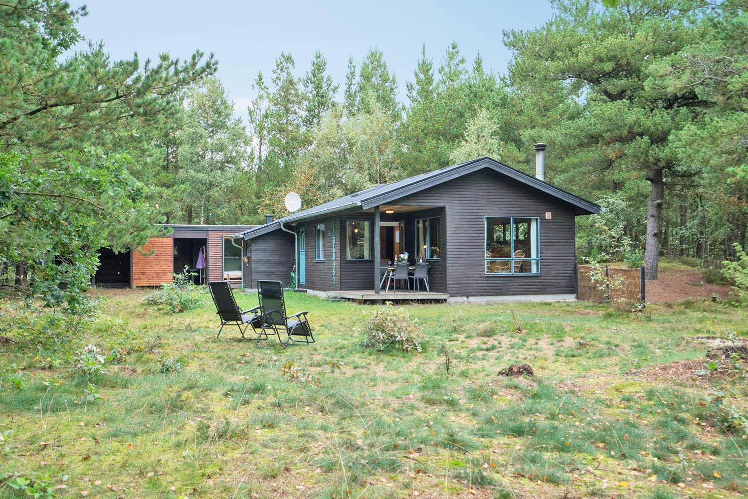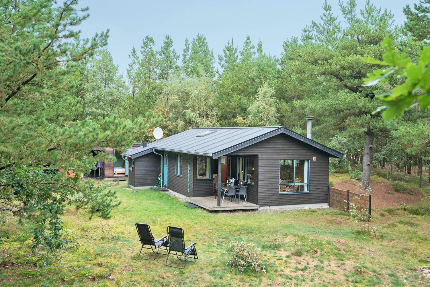 Hyggeligt og velholdt feriehus nær Blåbjerg Plantage med stor skovgrund og skøn overdækket terrasse.