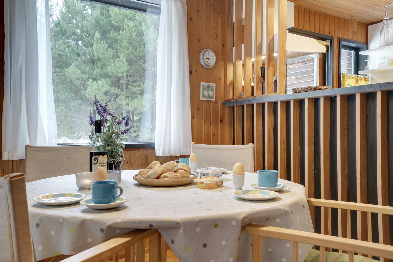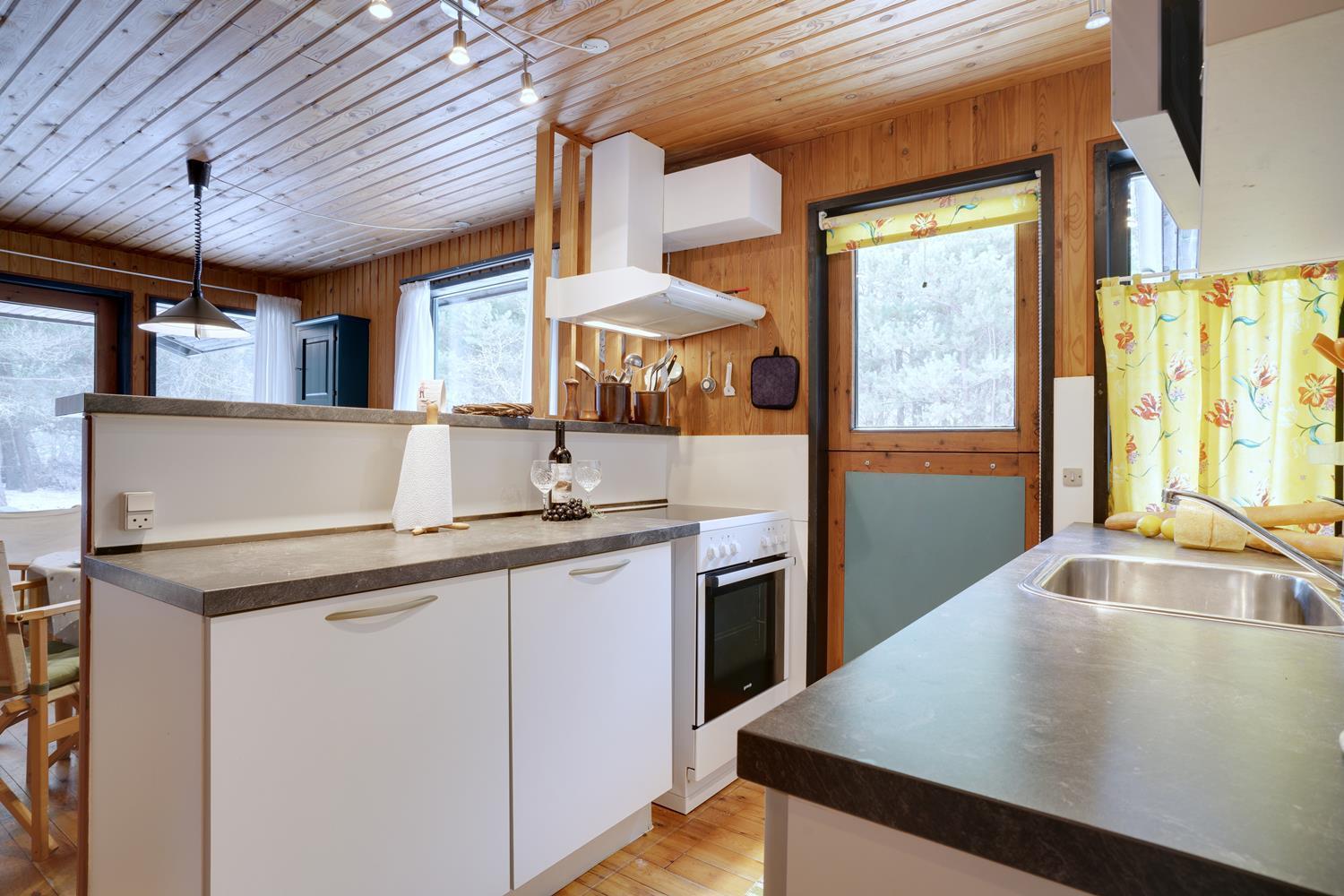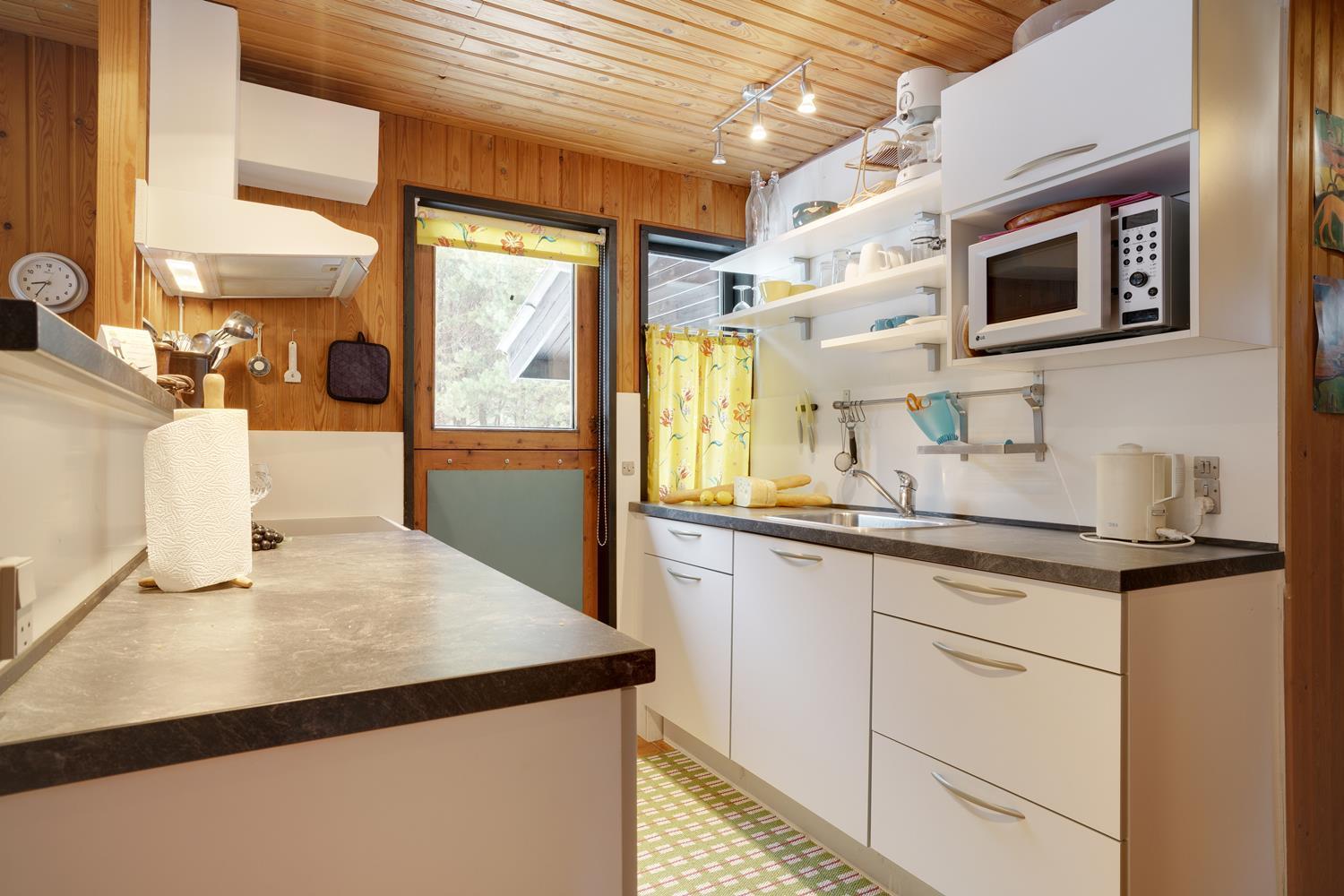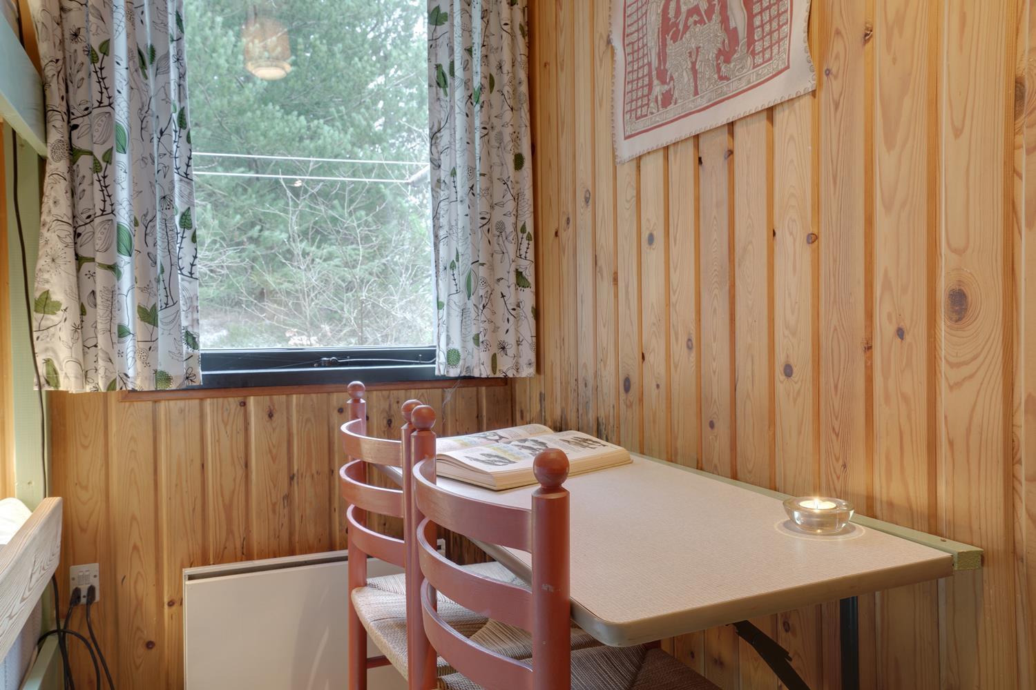 Ældre velholdt og hyggeligt feriehus, lyst og venligt indrettet køkken, beliggende på en stor skovgrund tæt ved Blåbjerg Plantage og golfbane. Grunden er bevokset med træer, hvilket gør, at huset ligger total ugeneret på grunden. Mindre overdækket træ-terrasse samt carport og anneks med 1 ekstra soveplads. Trægulve overalt i huset.