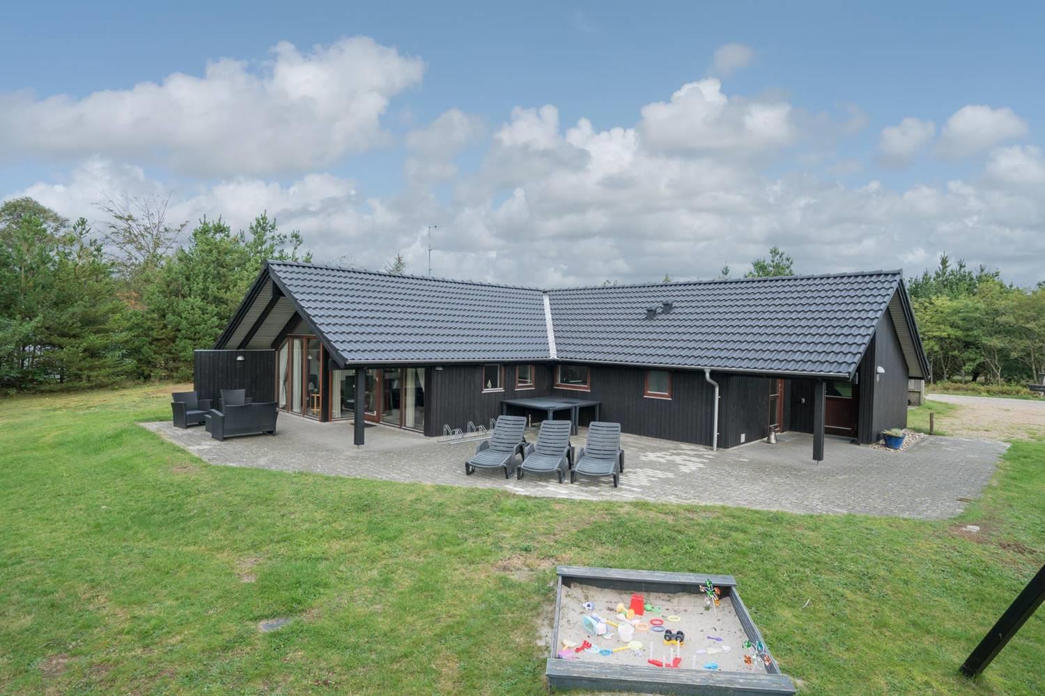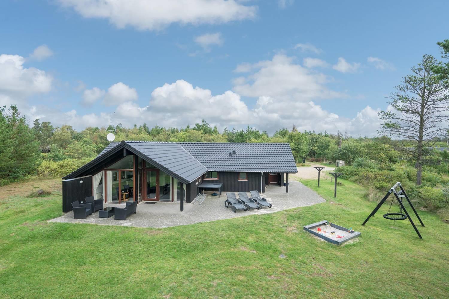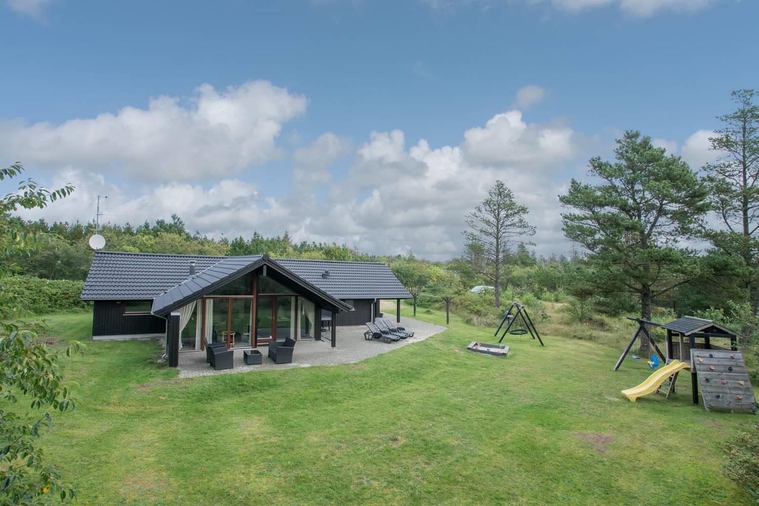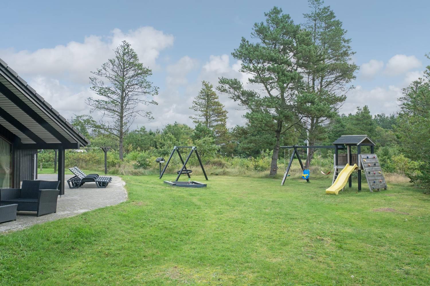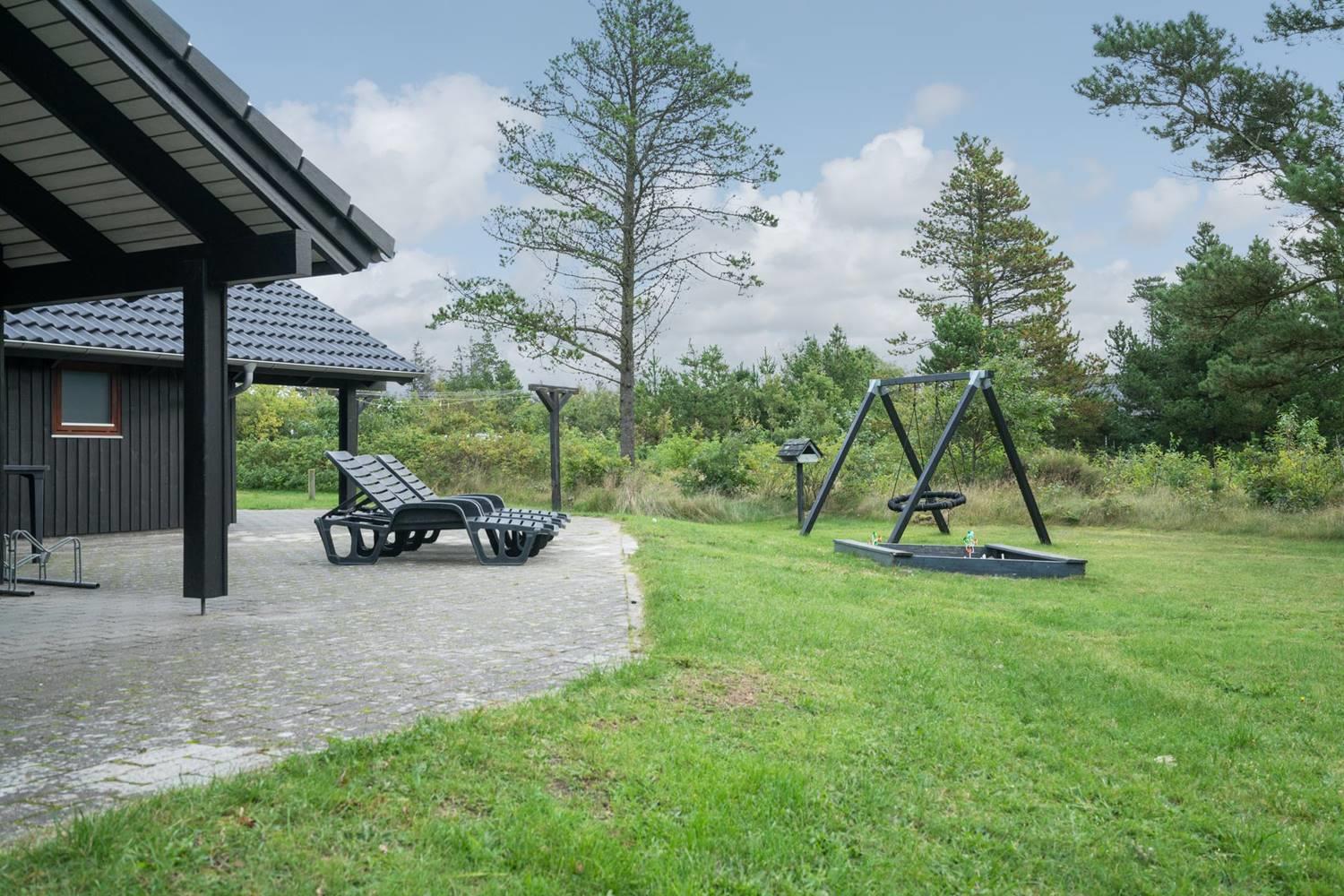 Huset har en stor, delvis overdækket og ugeneret terrasse, perfekt til solbadning, grillaftener og afslapning i rolige omgivelser. For de yngste gæster er der sørget for masser af sjov med legeborg, gynge og sandkasse på grunden.