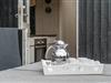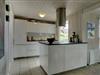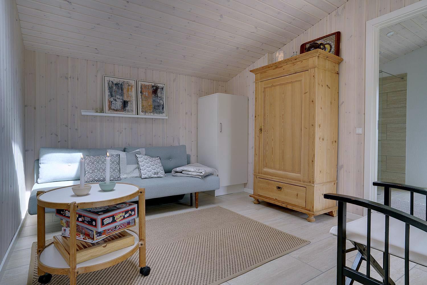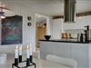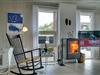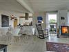Det flotte køkken er i åben forbindelse med den stilfuld indrettede stue som er indrettet med brændeovn og komfortable møbler. I huset er er der også et ”ekstra opholdsrum ” hvor man kan trække sig tilbage og læse en god bog eller slappe af på sofaen. Alle gulve i huset er belagt med klinker.