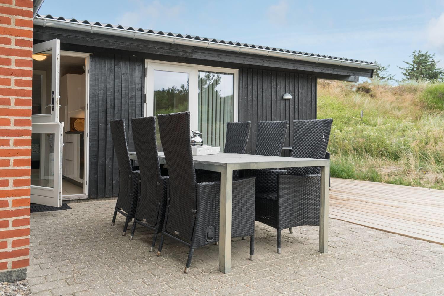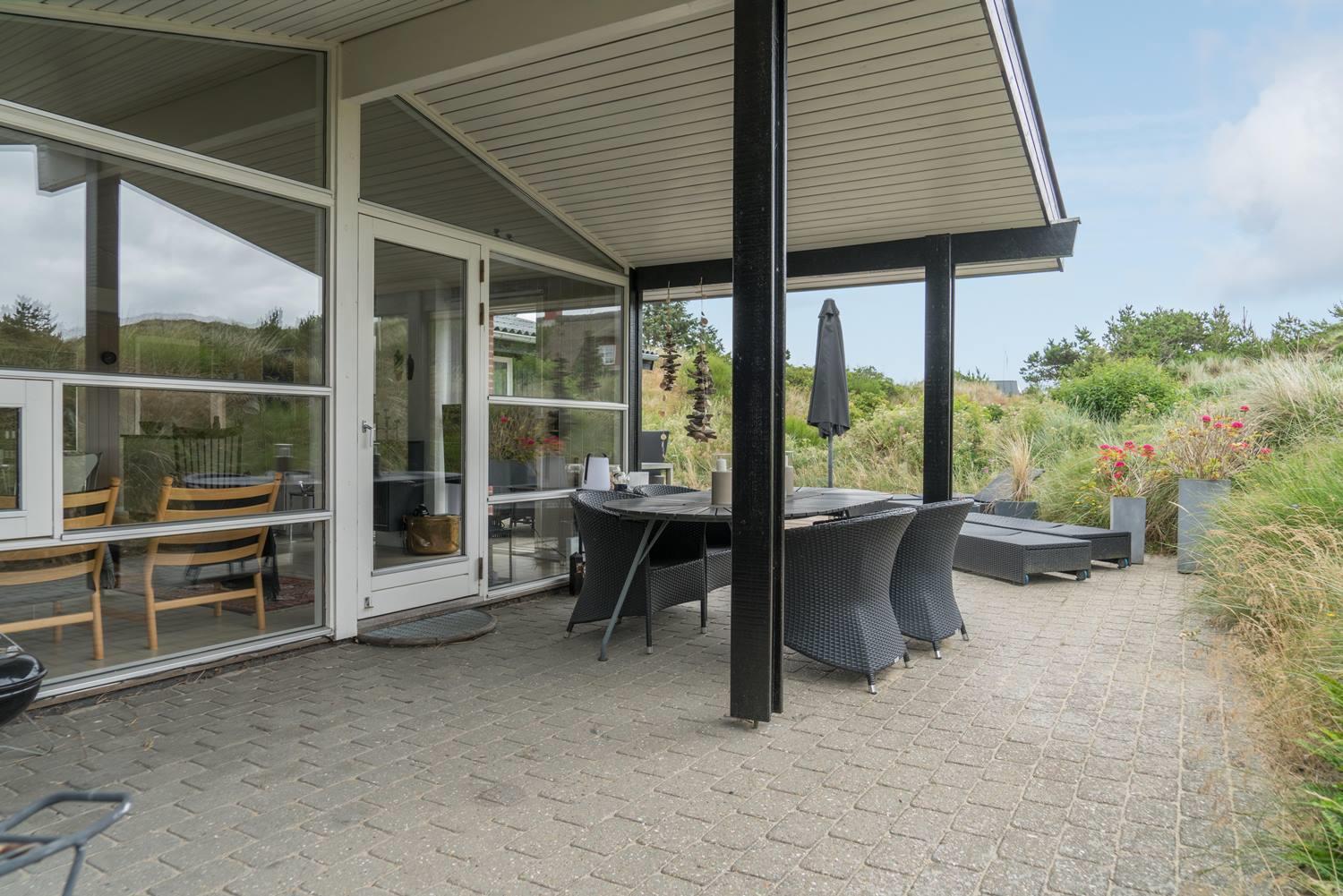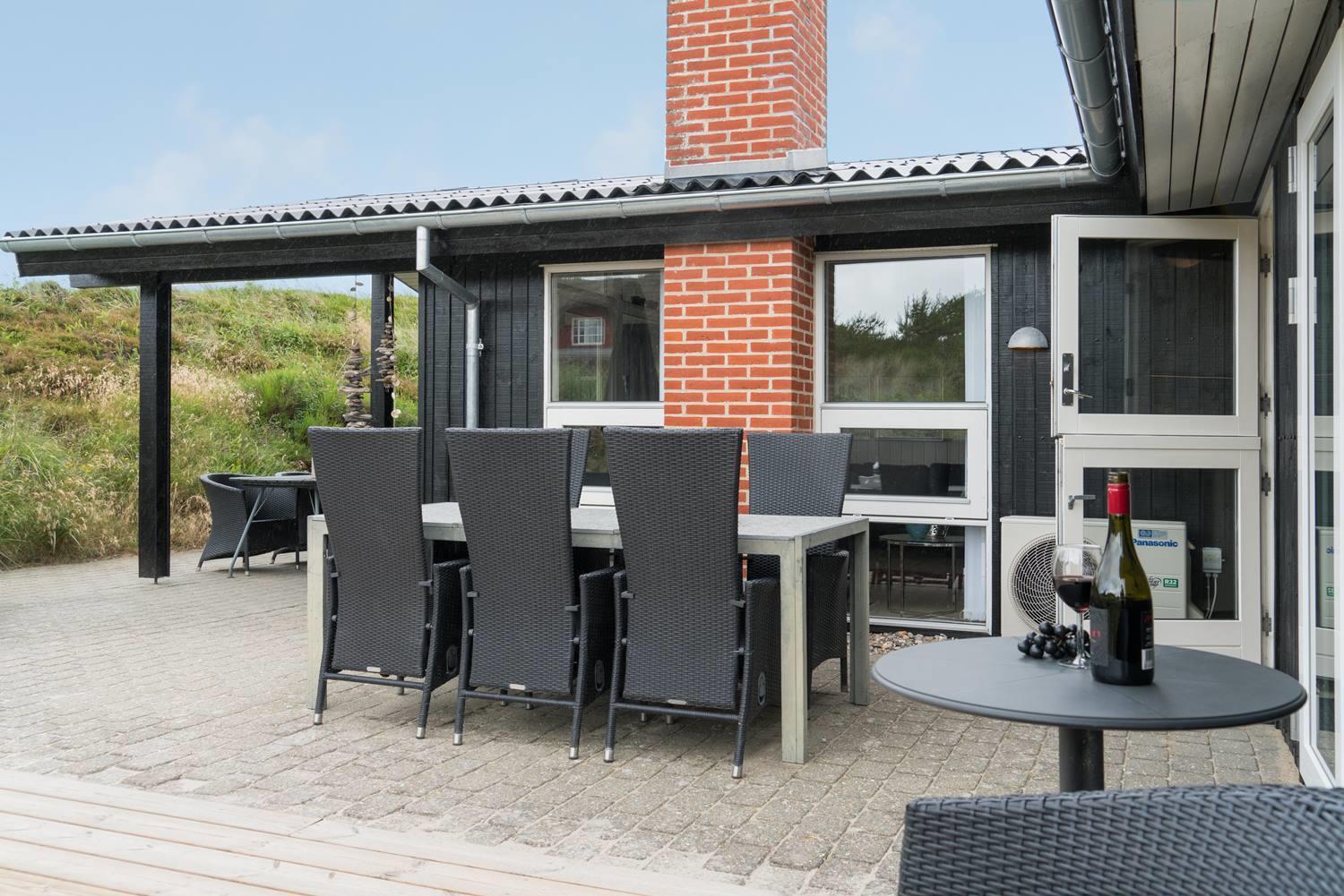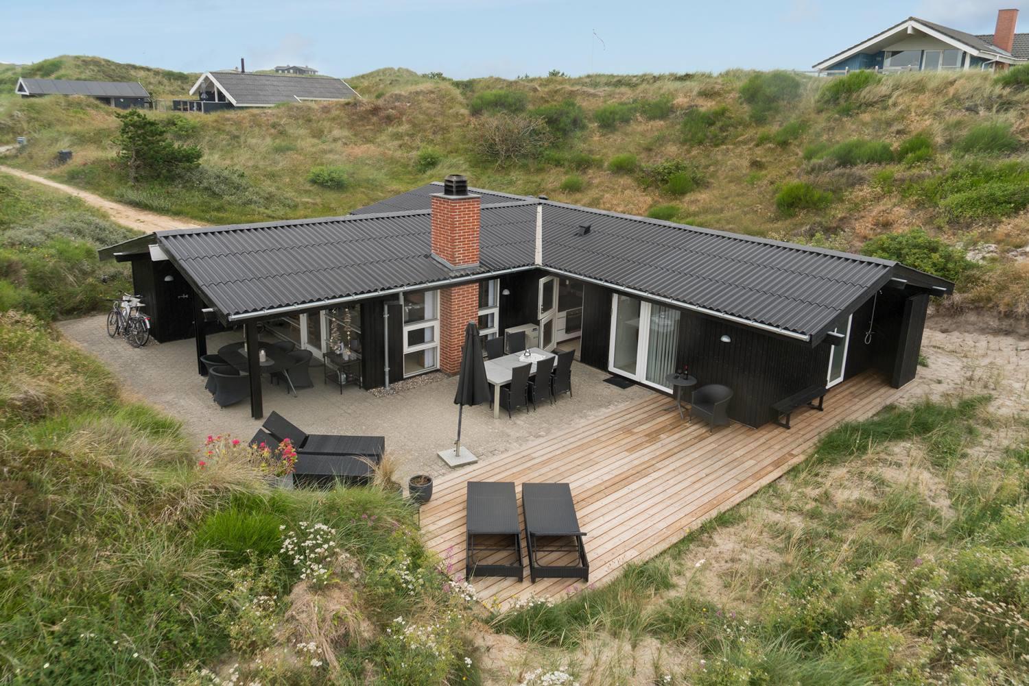 Et meget velholdt og moderne feriehus på Ørnevej 31 Henne Strand med plads til 6 personer. Der er både åbne terrasser og en overdækket terrasse omkring huset, så man kan ugeneret nyde solen.