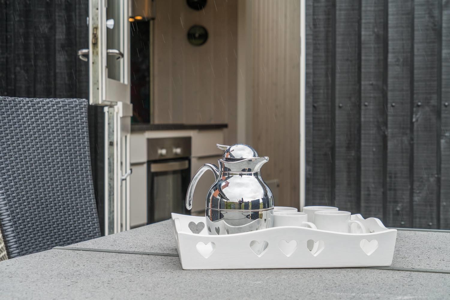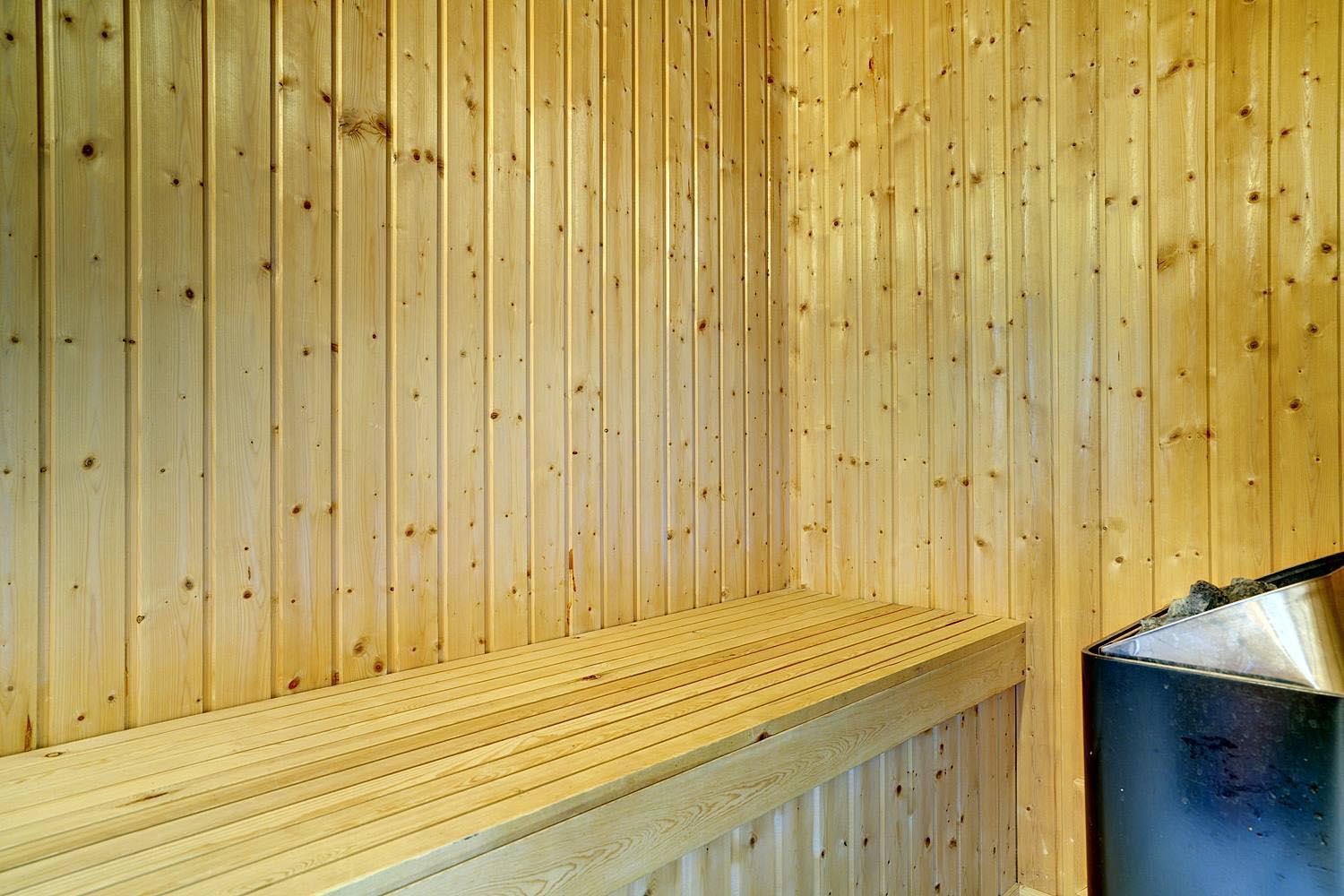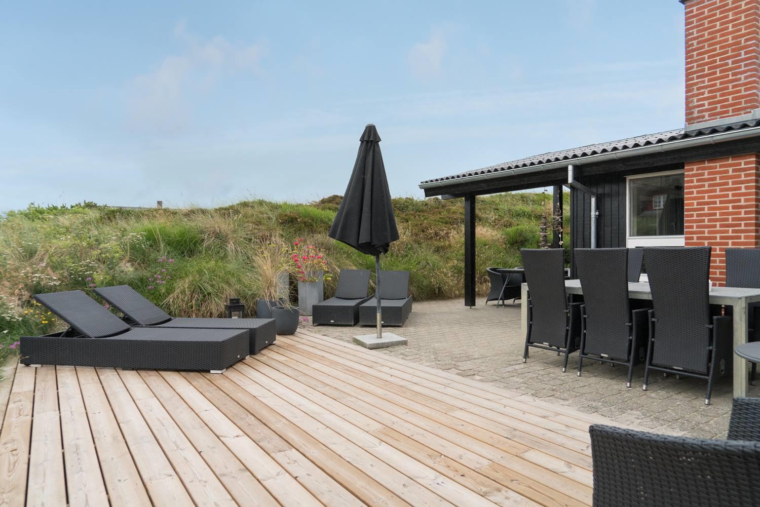 Velholdt og moderne feriehus nær Henne Strand med sauna, brændeovn og flere terrasser til afslapning.