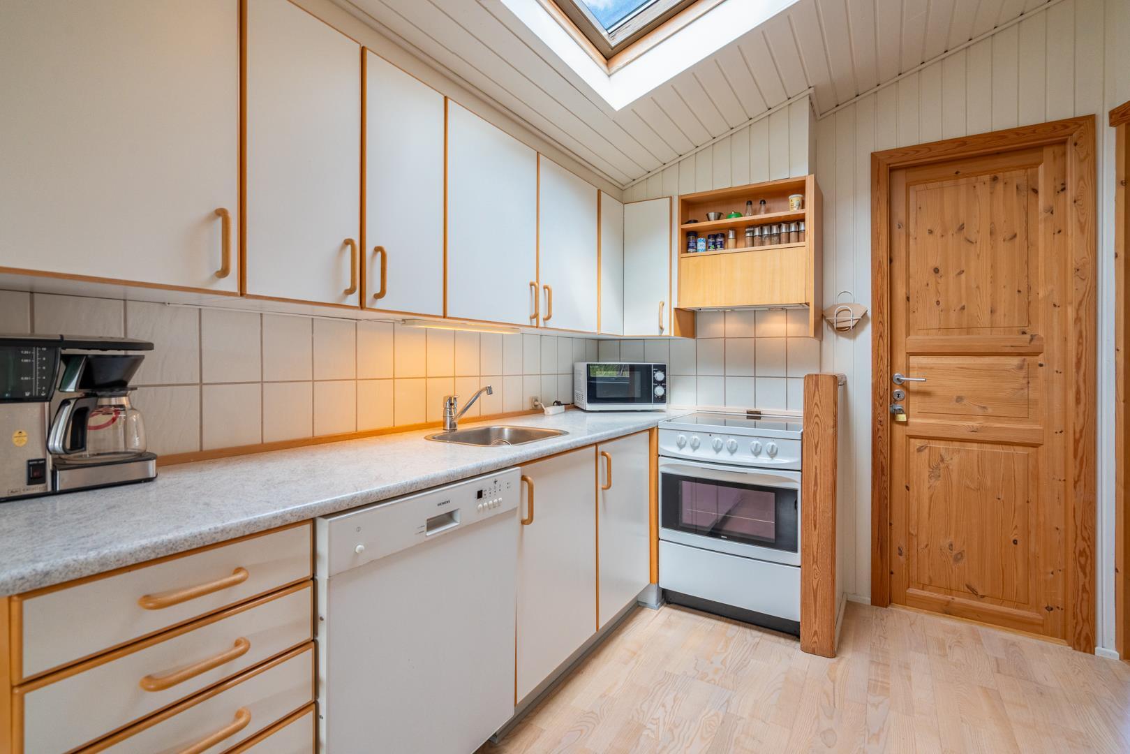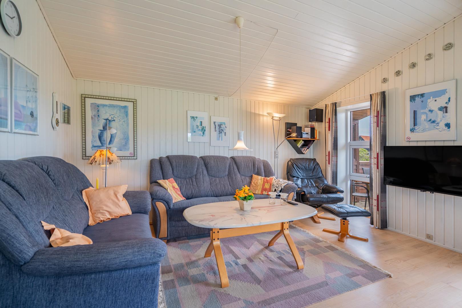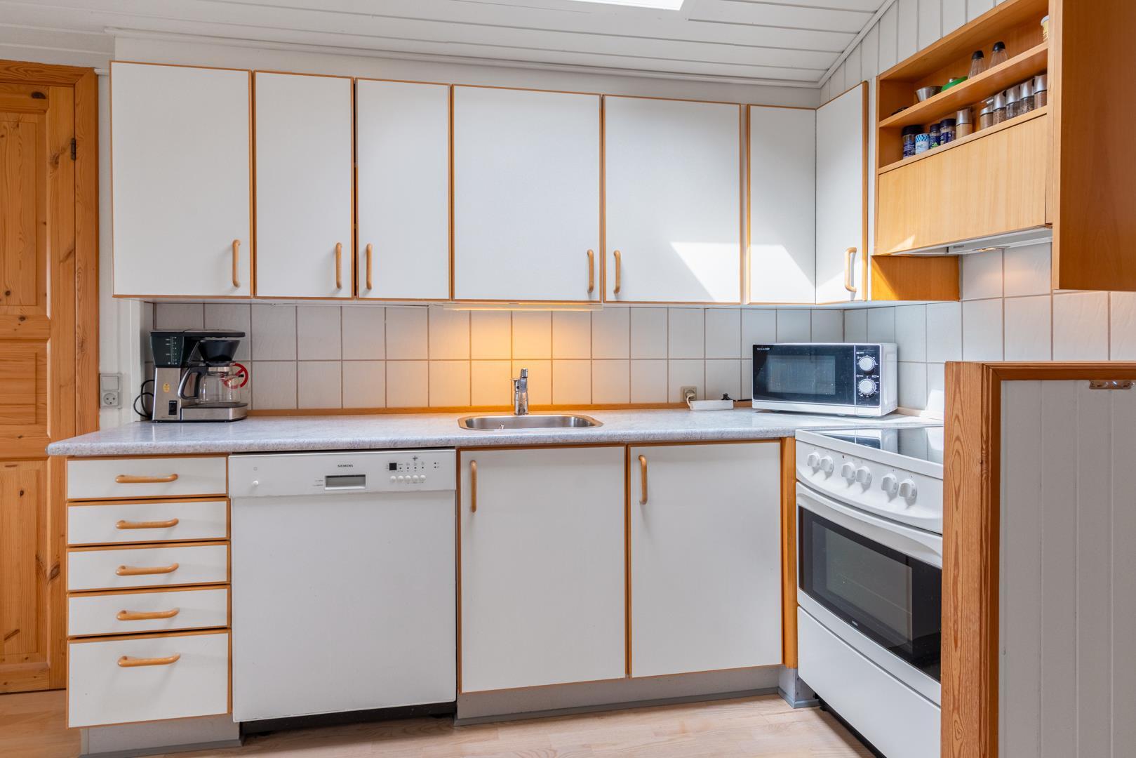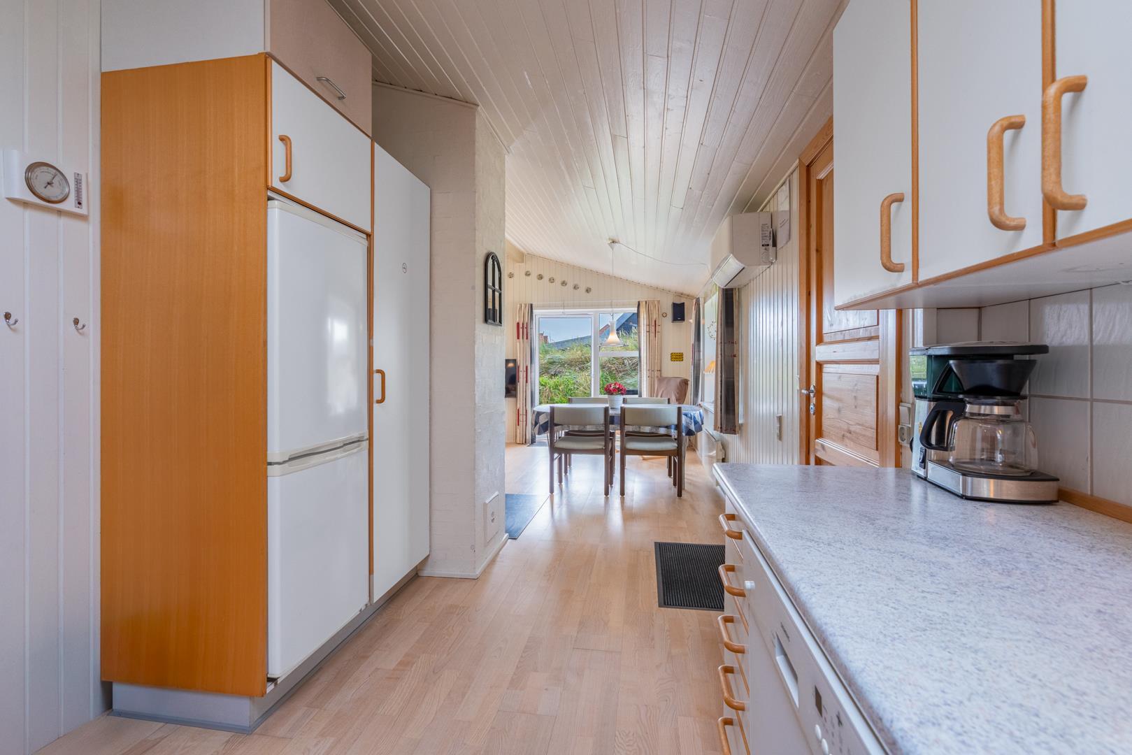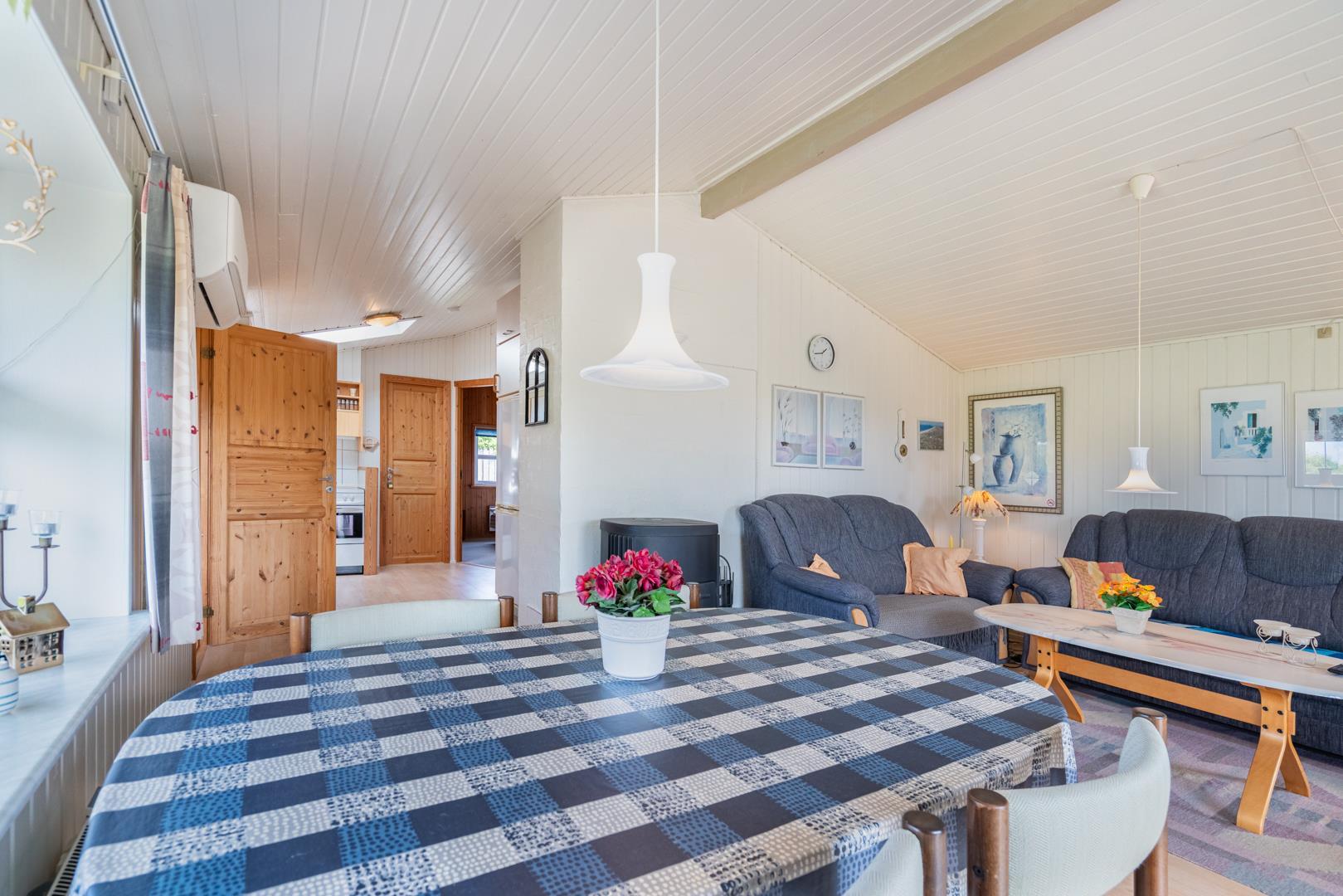 Huset er indrettet med gode, komfortable møbler og har en dejlig, lys atmosfære. Det åbne køkken ligger i direkte forbindelse med stuen, hvor brændeovnen skaber hygge på kølige aftener. Fra stuen er der direkte udgang til en skøn, delvist overdækket terrasse – ideel til morgenkaffen eller en hyggelig middag i det fri. Derudover byder huset på flere solrige terrasser, hvor du altid kan finde en læ krog og nyde naturen.