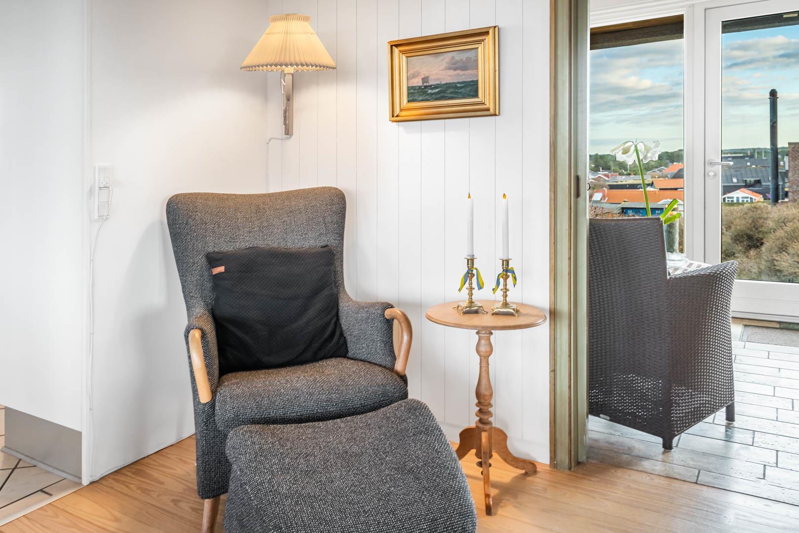 Selvom der blot er få skridt til Strandvejens cafeer, butikker og restauranter, er der helt stille og roligt på sommerhusets skønne klittop. En ferie her vil indeholde en del afslapning på husets skønne terrasser, eller måske foretrækker I en slentretur langs stranden efterfulgt af en lækker frokost hos Crêperiet. Det er også altid skønt at gå lange ture i Blåbjerg Plantage, og skal der ske noget helt andet, kan I også benytte jer af Henne Strand Camping og Resorts faciliteter eller smutte en tur til Henne Golfklub.
