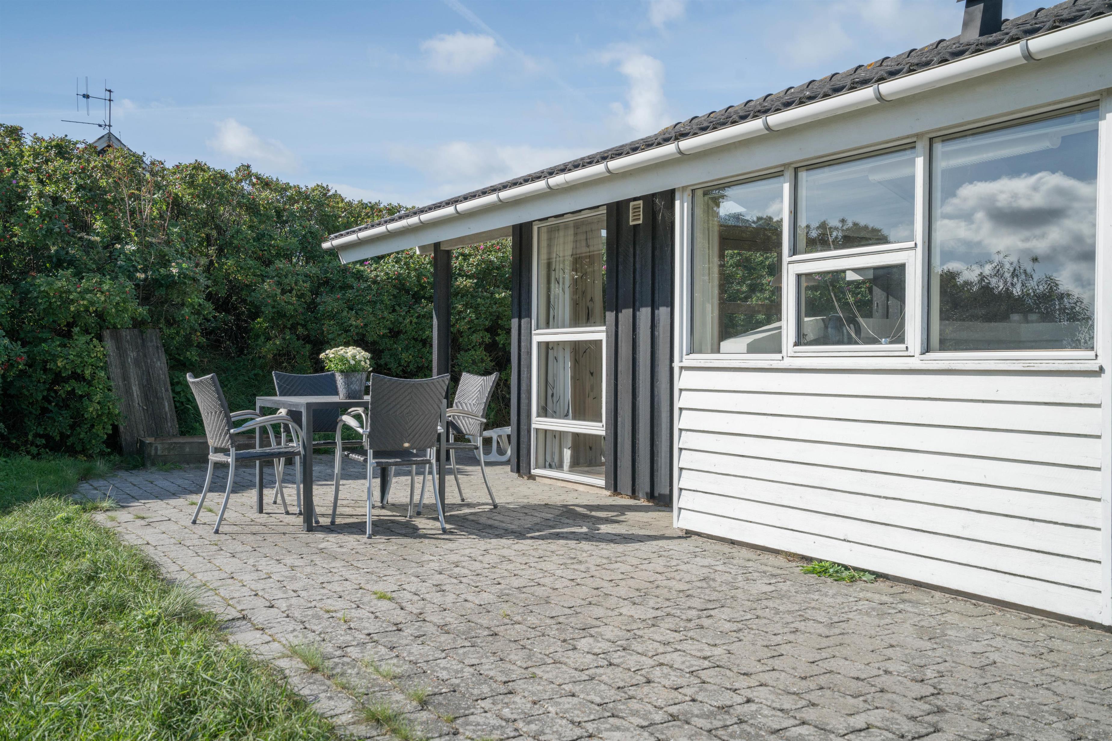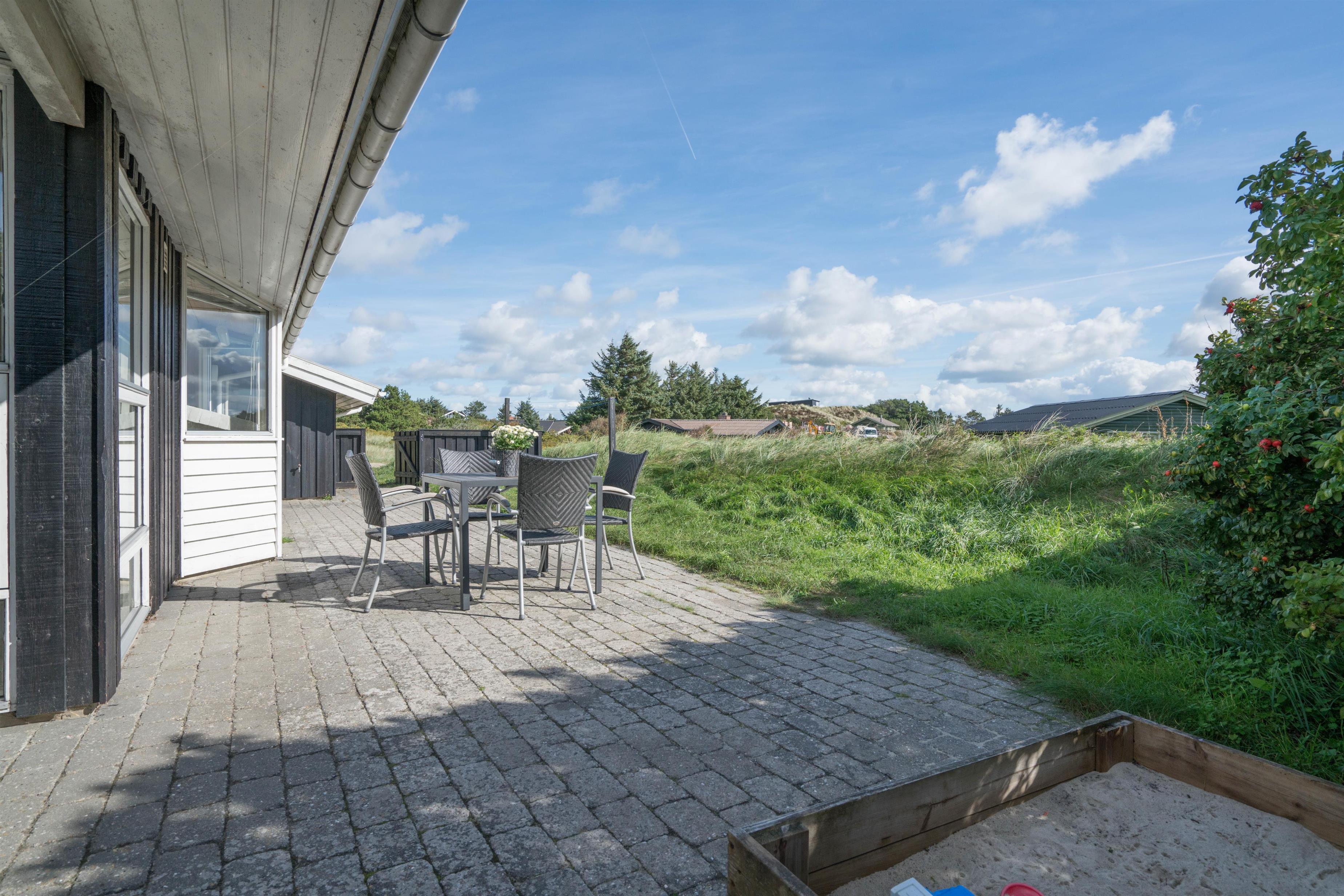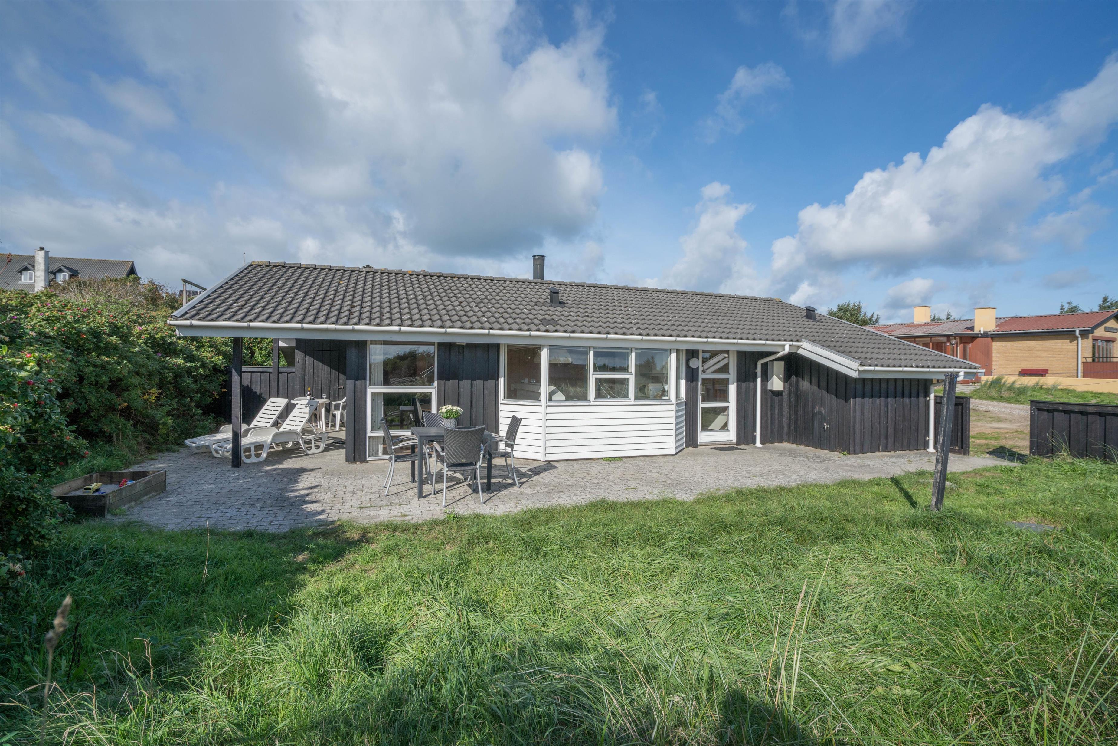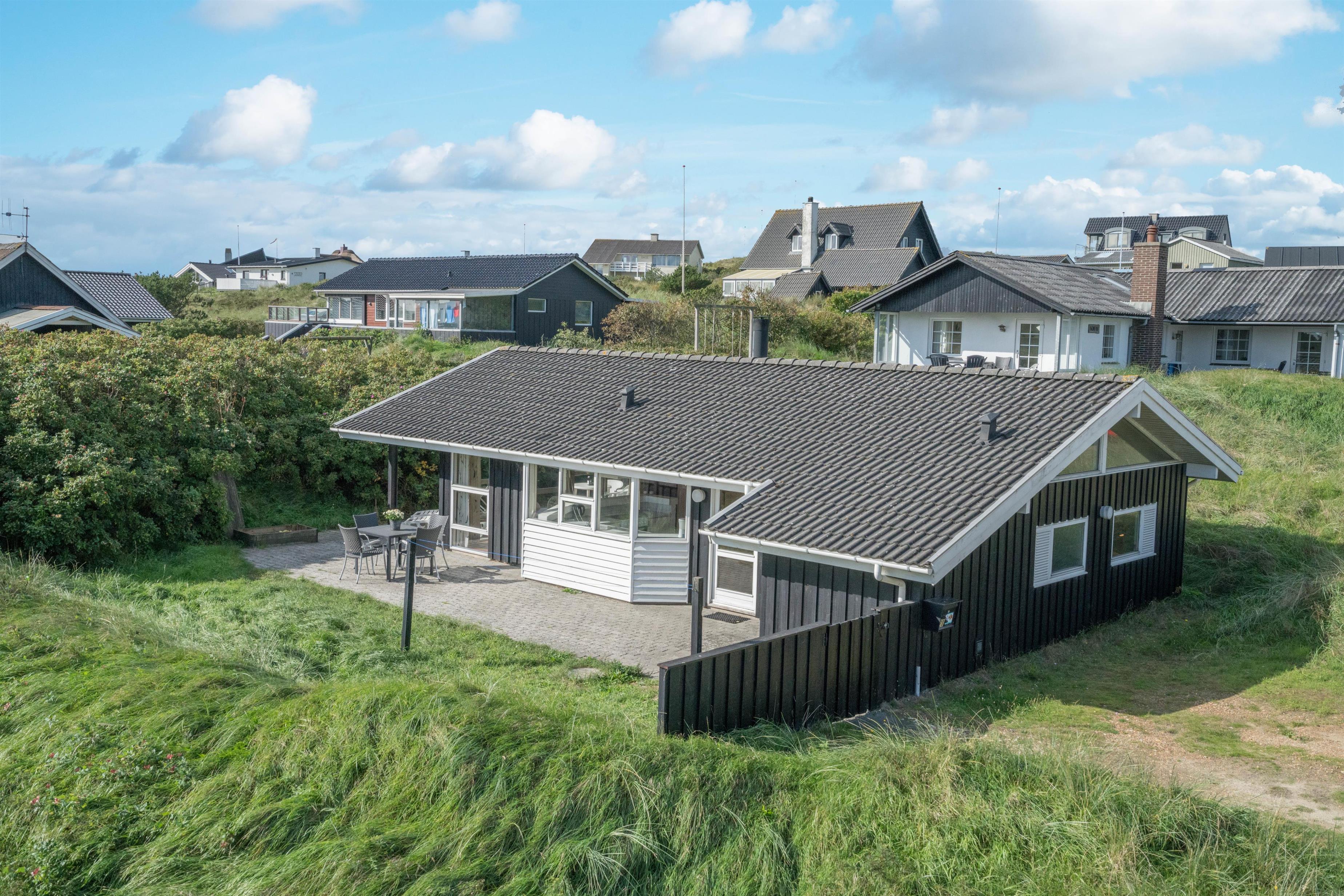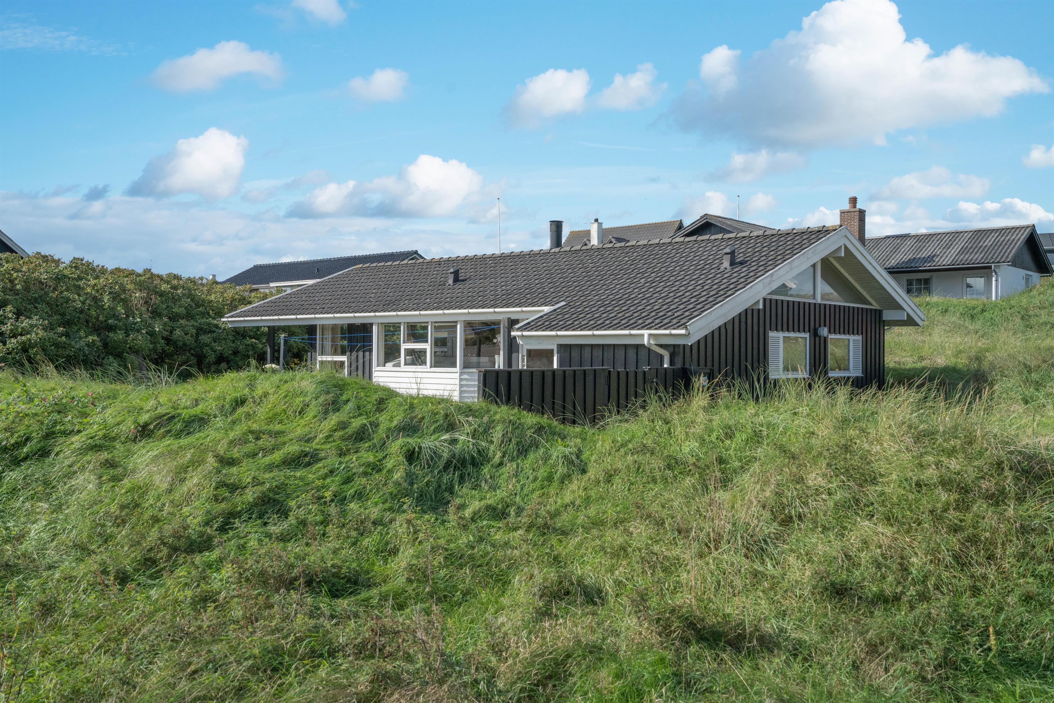 På en dejlig, ugeneret kuperet klitgrund på blind vej ikke langt fra Vesterhavet ligger dette velholdte feriehus. Huset fremstår lyst og venligt. Godt badeværelse med sauna. Fra stuen er der udgang til både delvis overdækket og åben terrasse.