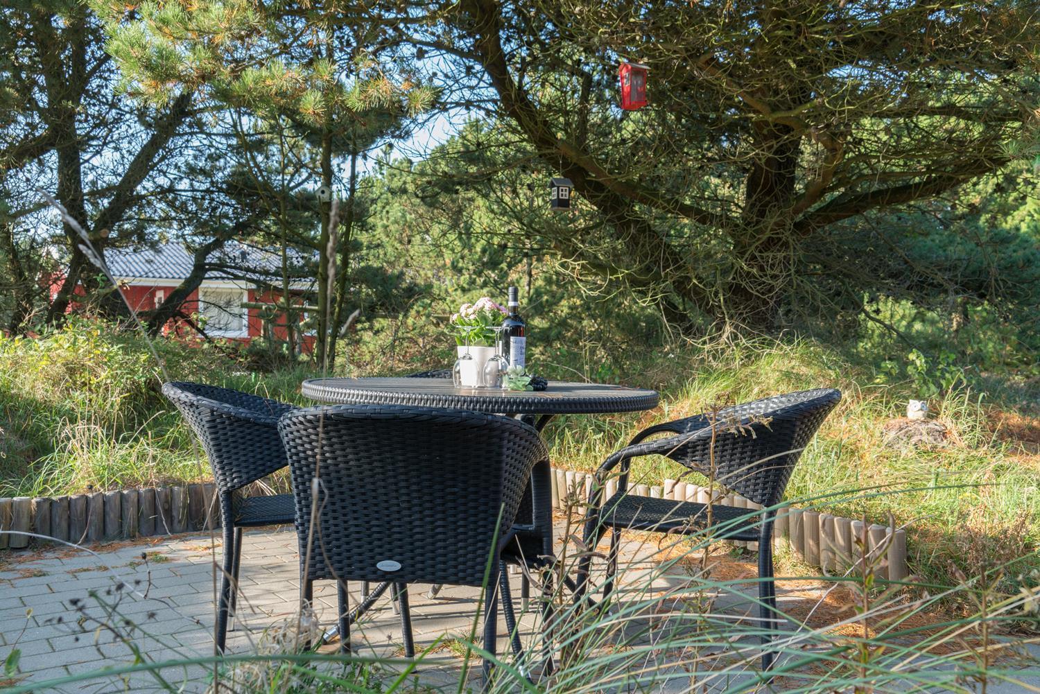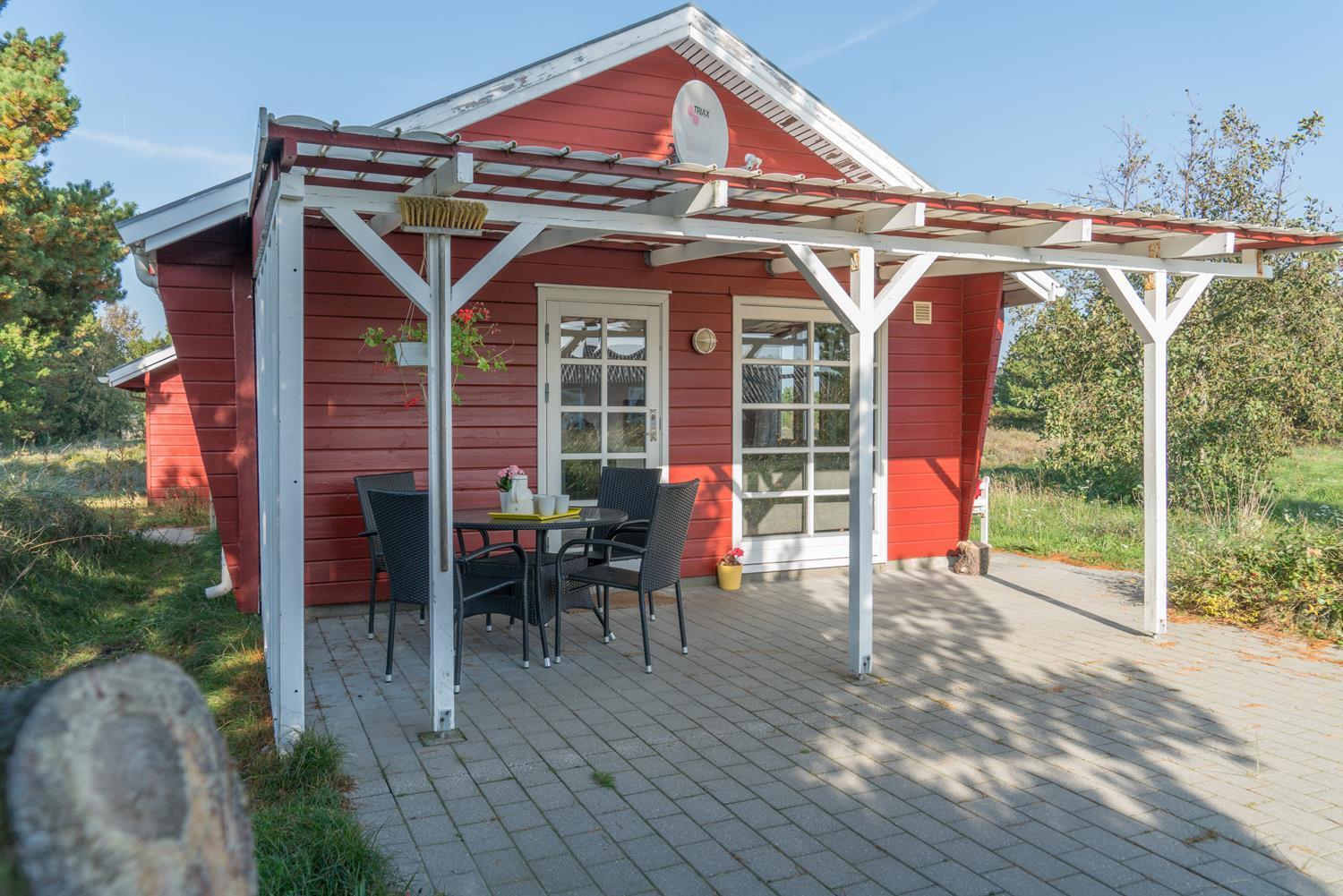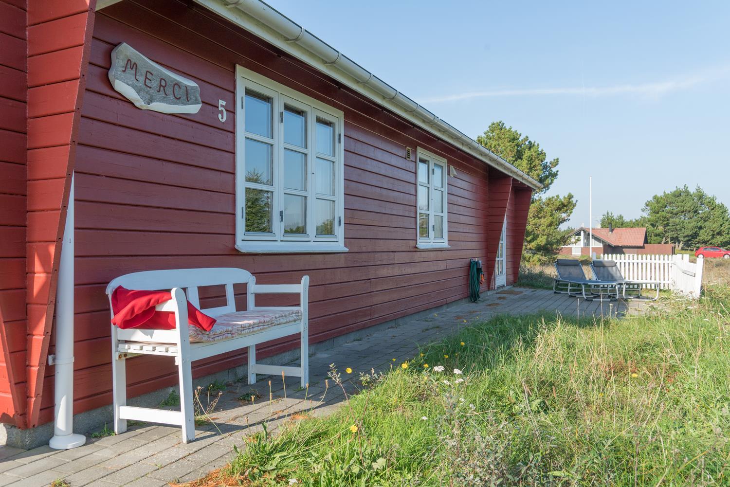 Hyggeligt feriehus på lyngklædt naturgrund med terrasse og udsigt til fredet hede, tæt på strand og indkøb.