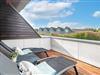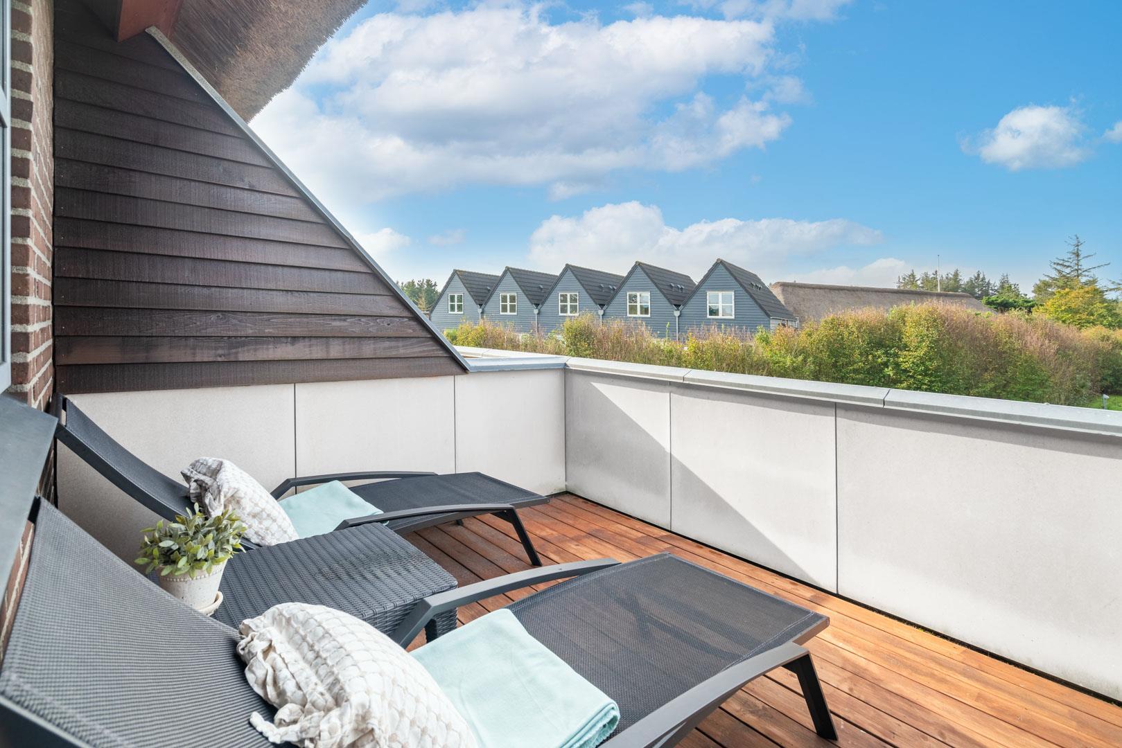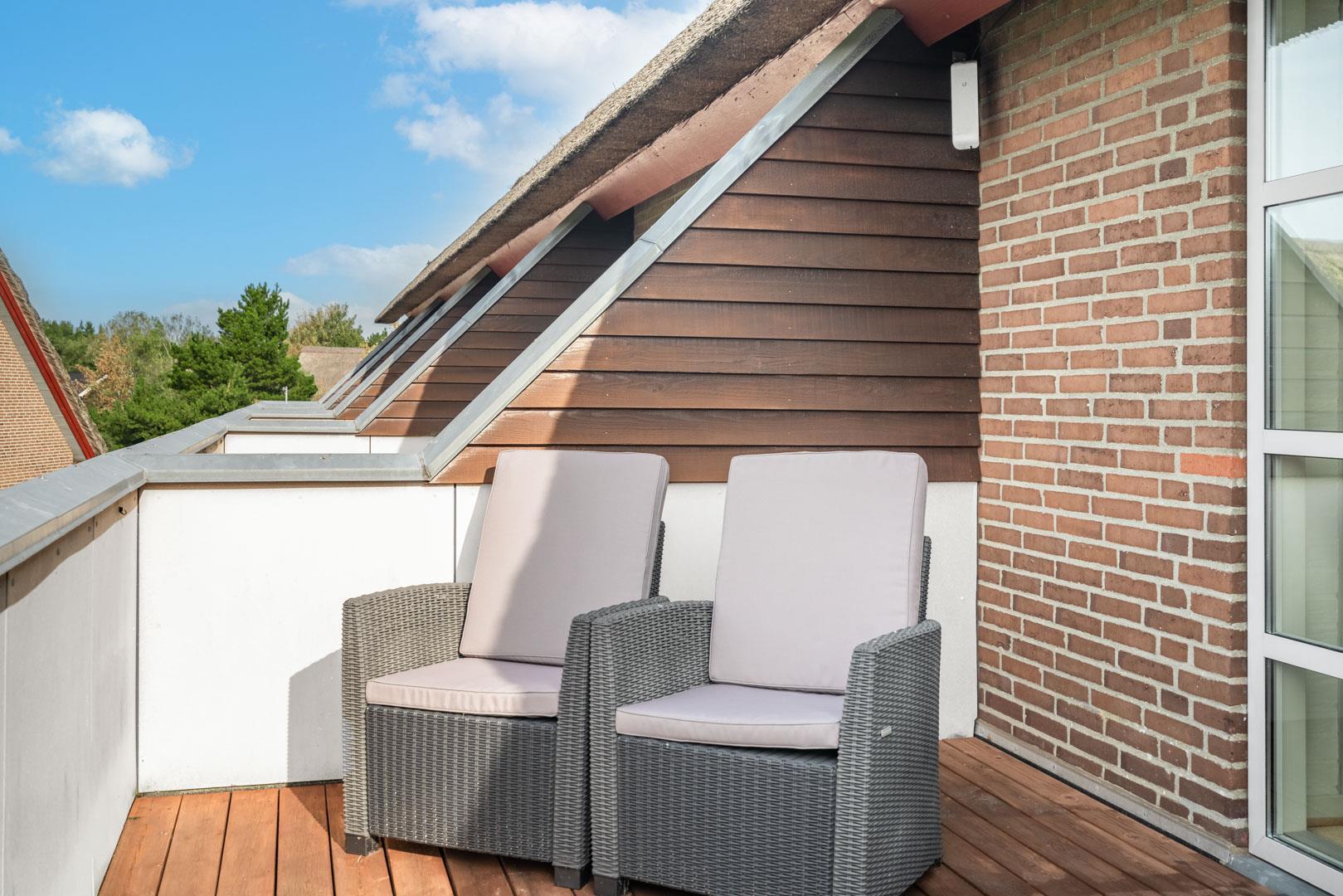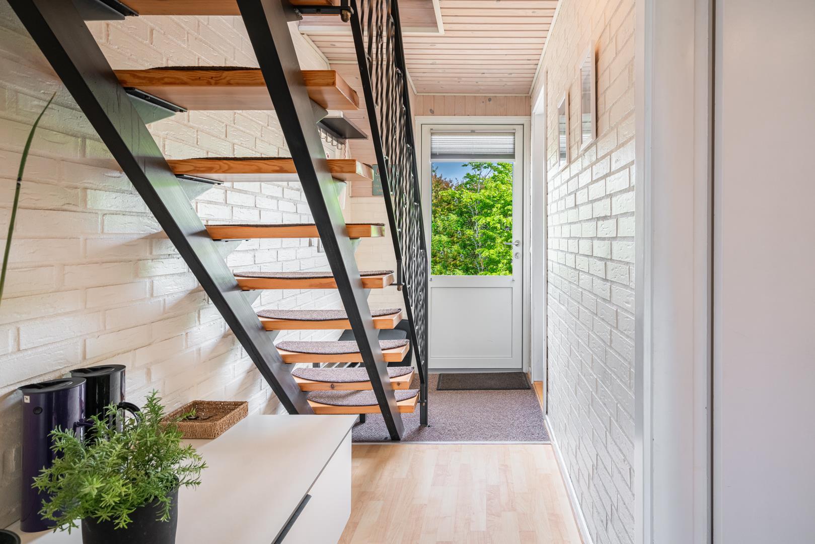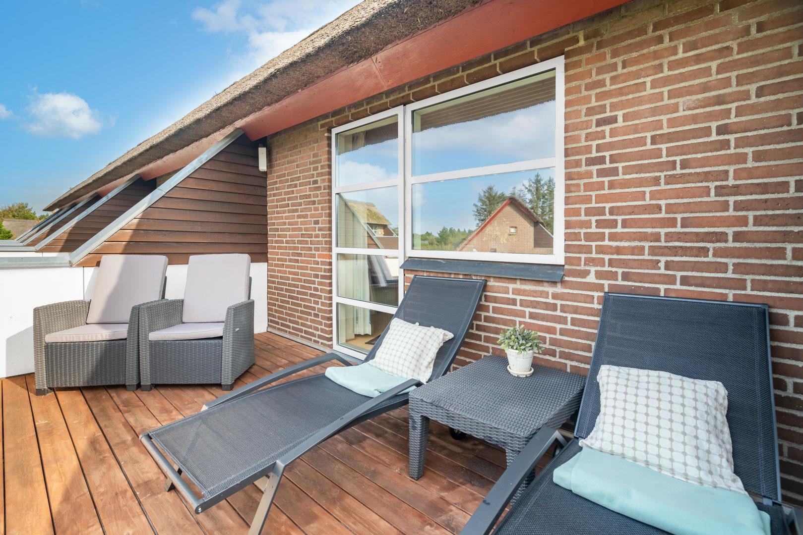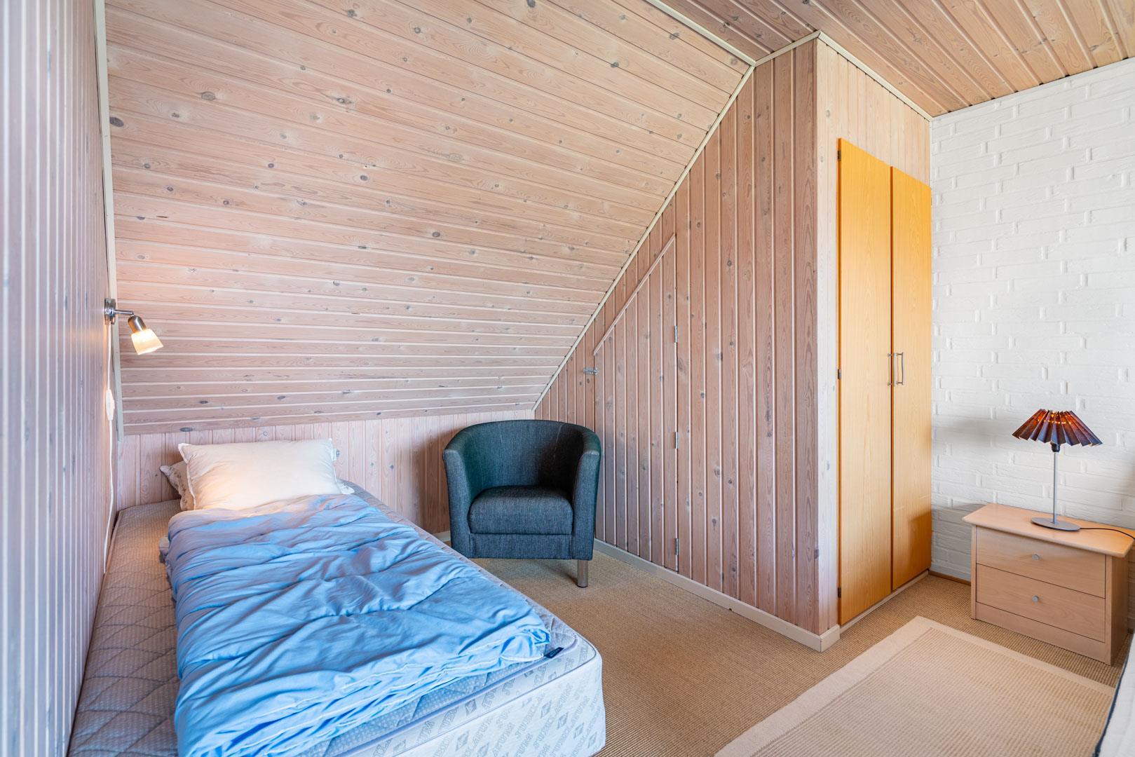 Lejligheden er praktisk indrettet og byder på masser af plads og komfort. På 1. sal finder du et stort soveværelse med direkte adgang til en privat altan, hvor du kan nyde morgensolen og udsigten over området.