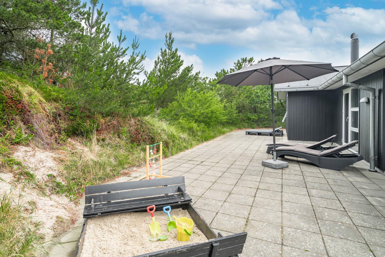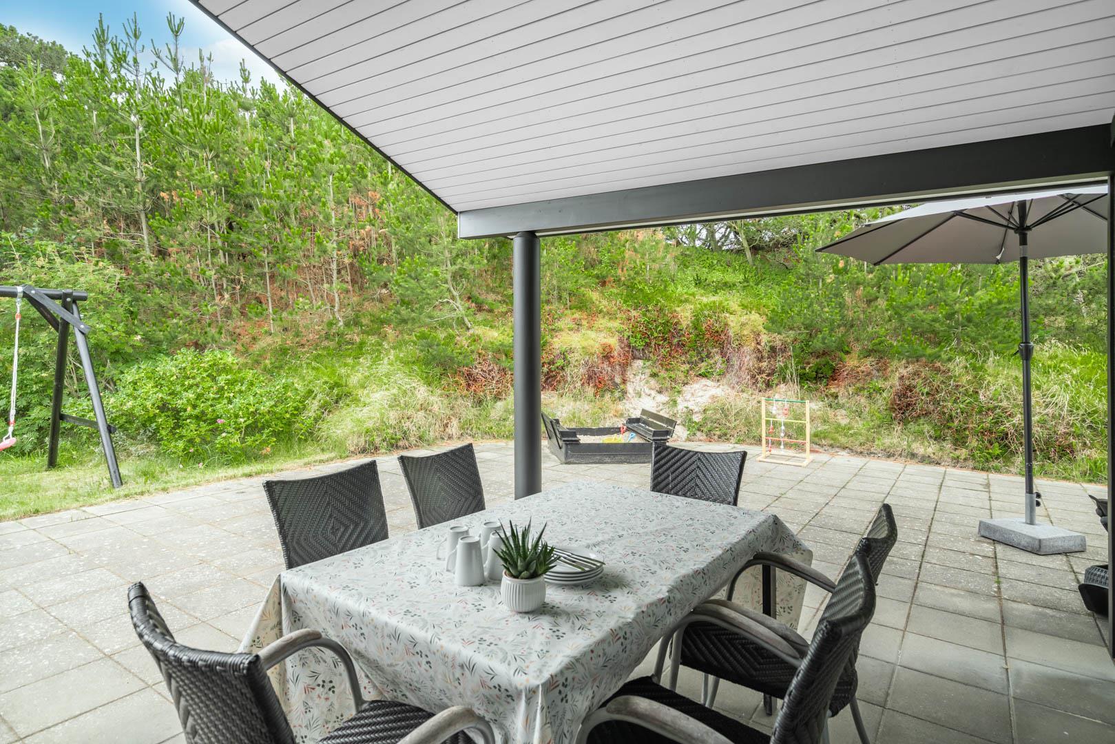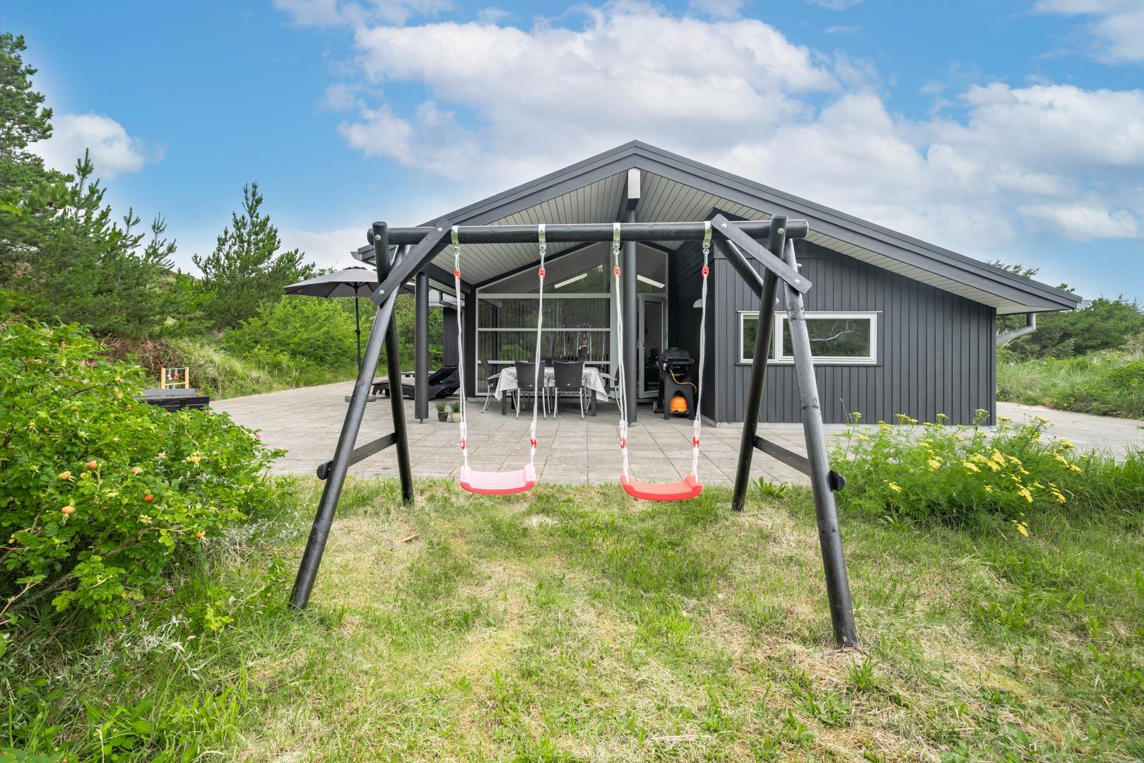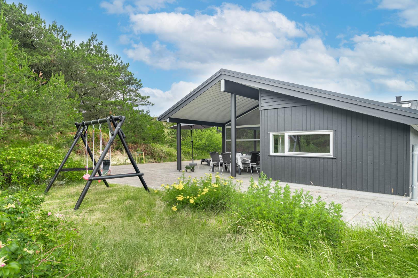 Omkring hele sommerhuset finder du terrasser, så du kan nyde solen fra morgen til aften. Den overdækkede terrasse gør det muligt at grille og hygge udendørs, uanset vejret. På grunden er der også tænkt på de yngste feriegæster, som kan boltre sig på gyngestativet eller bygge sandslotte i sandkassen.