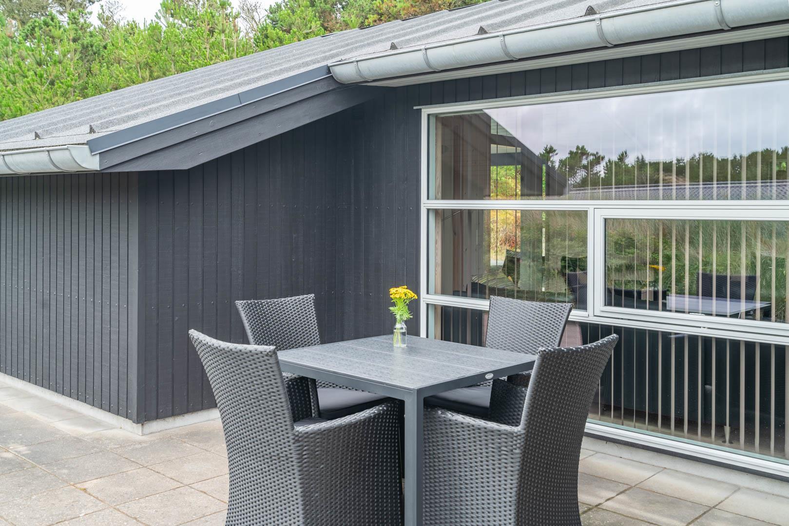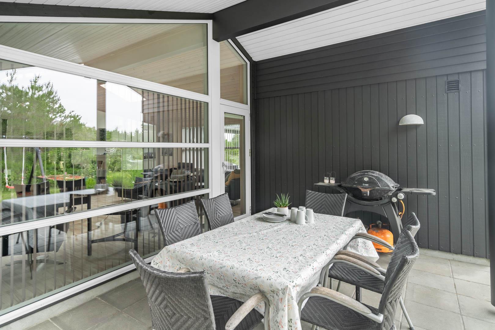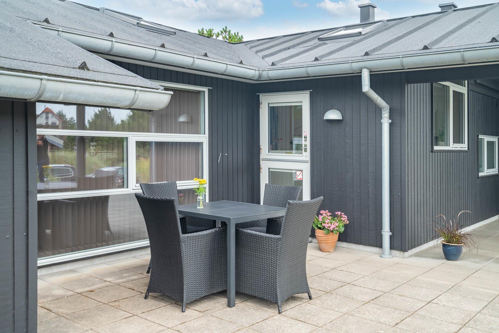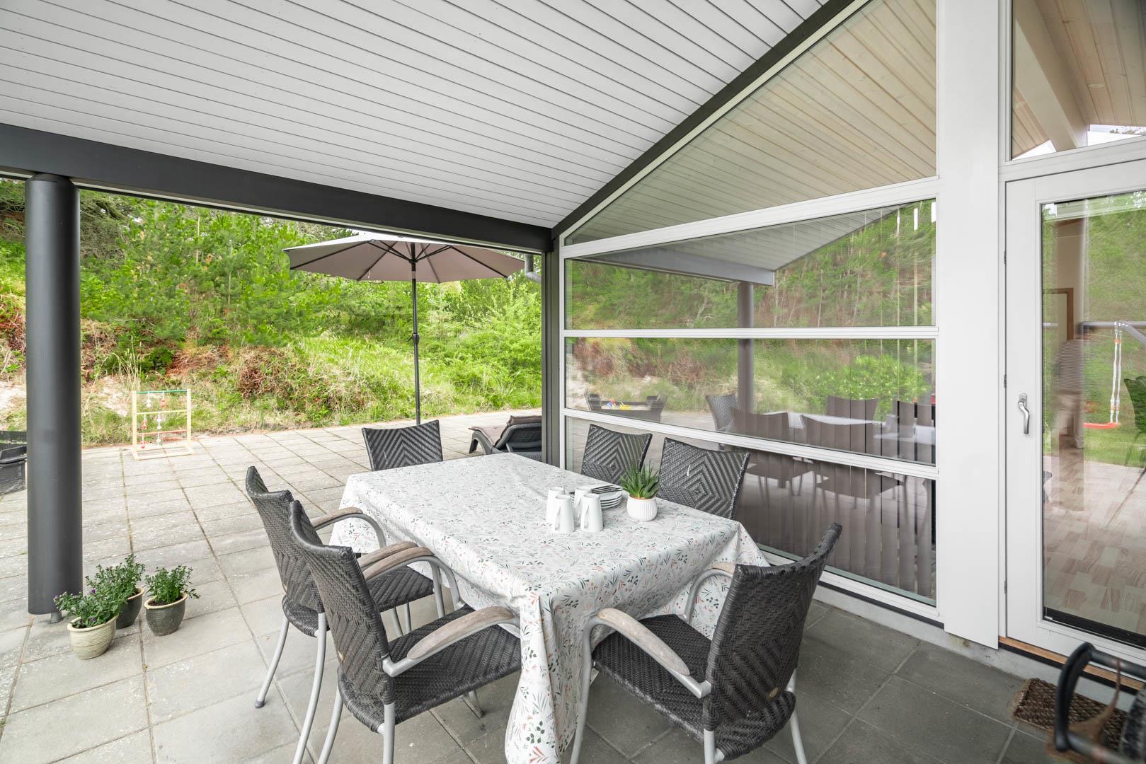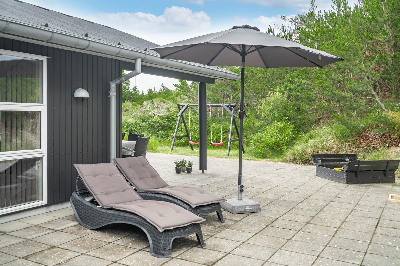Omkring hele sommerhuset finder du terrasser, så du kan nyde solen fra morgen til aften. Den overdækkede terrasse gør det muligt at grille og hygge udendørs, uanset vejret. På grunden er der også tænkt på de yngste feriegæster, som kan boltre sig på gyngestativet eller bygge sandslotte i sandkassen.