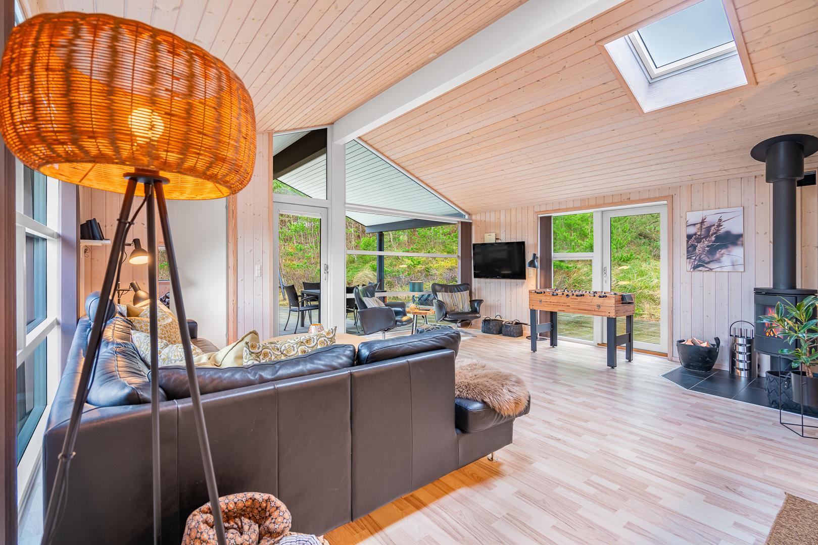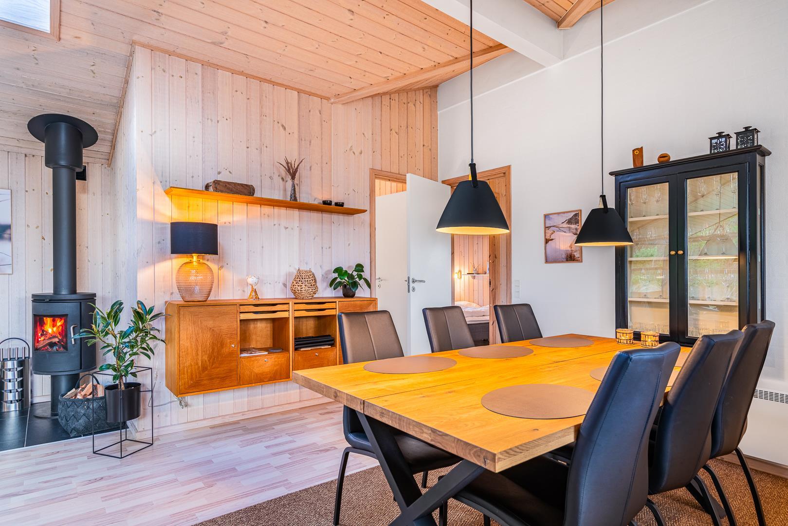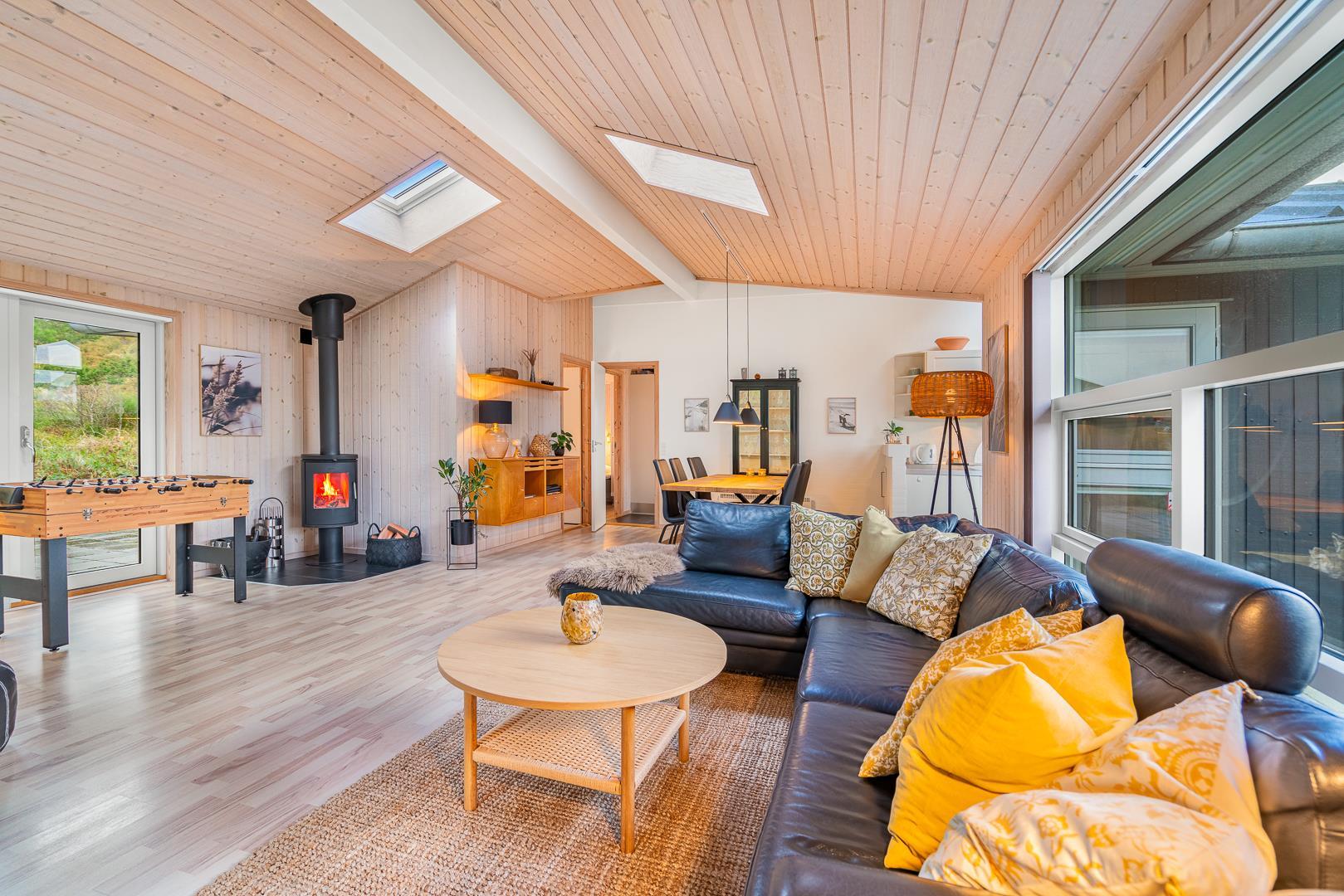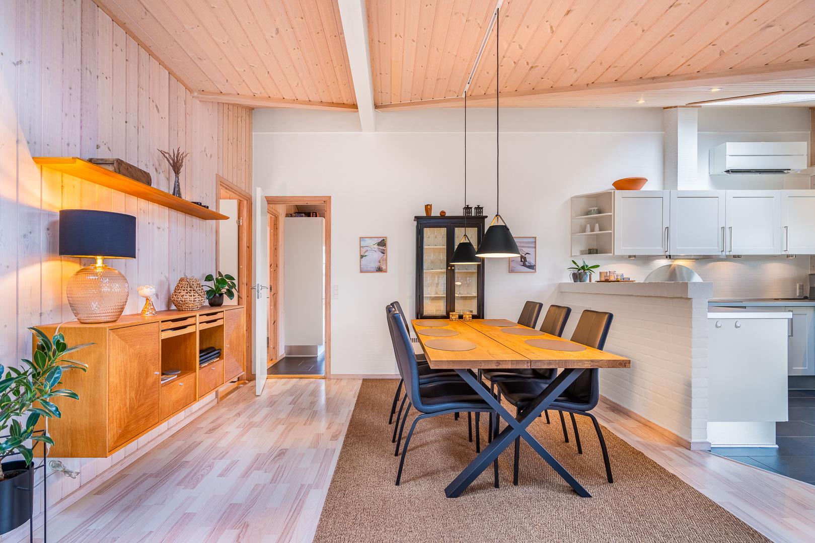 Husets hjerte er det åbne køkken-alrum, der er kombineret med den rummelige og smagfuldt indrettede stue. Møblerne er af høj kvalitet, og de store vinduespartier lader dagslyset strømme ind, hvilket skaber en lys og behagelig atmosfære. Brændeovnen sørger for varme og hygge på de køligere dage, så du altid føler dig hjemme.
