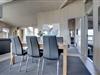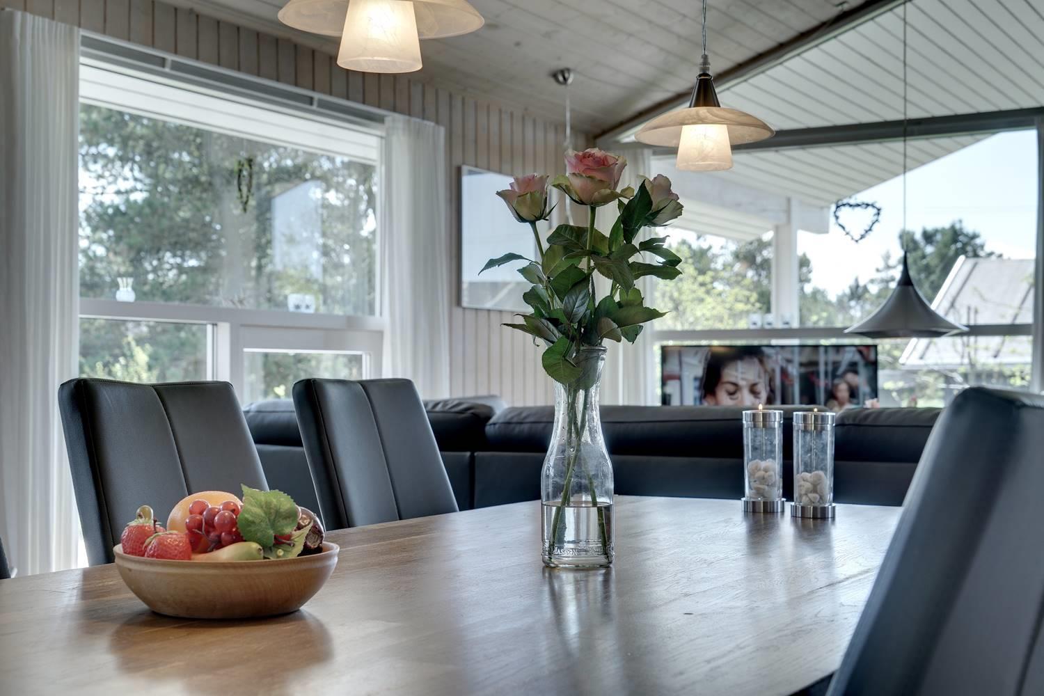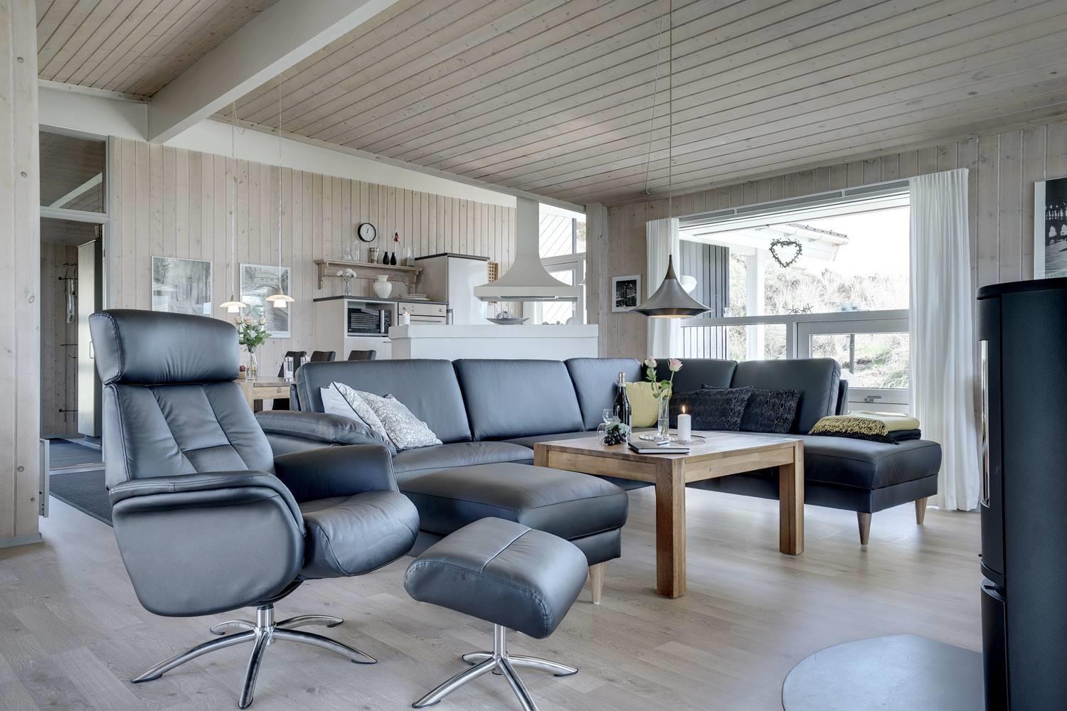 Huset er indrettet med et lyst og veludstyret køkken i åben forbindelse med en hyggelig stue, hvor brændeovn og varmepumpe sørger for komfort året rundt. Overalt er der loft til kip og store glaspartier, som inviterer lyset og naturen helt ind i opholdsrummene og skaber en behagelig og luftig atmosfære.